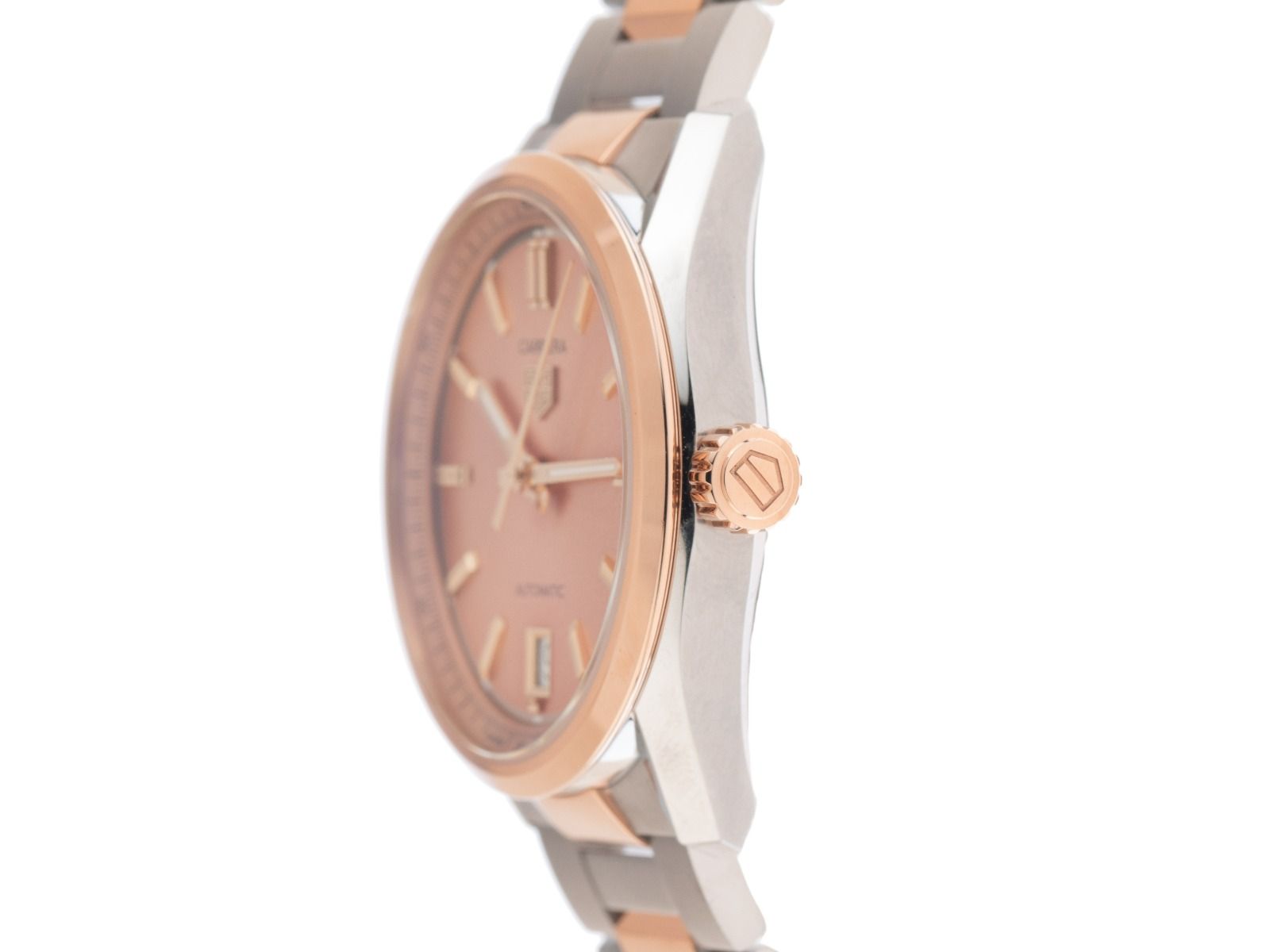 Tag Heuer Carrera Date Stahl Roségold Automatik Armband Stahl RoségoldGehäuse Edelstahl poliert, Gehäusedurchmesser ohne Krone 36mm, Gehäusehöhe 10,6mm. Lünette Roségold glatt und poliert. Armband Edelstahl / Roségold poliert, Doppelsicherheitsfaltschließe Edelstahl mit Hersteller-Logo. Zifferblatt roséfarben mit aufgesetzten roségoldenen Leuchtindexen und roségoldenen Leuchtzeigern. Uhrwerk Automatik, Kaliber Tag Heuer Calibre 7 mit 25 Edelsteinen, Gangreserve ca. 50 Stunden. Anzeige von Stunde, Minute und Sekunde über Zeiger aus der Mitte mit Sekundenstopp zur sekundengenauen Einstellung der Uhrzeit, Datumsanzeige mit Schnellverstellung bei 6 Uhr. Saphirglas kratzfest und gewölbt. Krone mit Hersteller-Logo. Boden Edelstahl verschraubt und graviert mit Saphirglas Sichtfenster. Gewicht der Uhr inklusive Armband 118g, Länge des Armbandes inklusive Gehäuse 190mm. Wasserdicht bis 5 ATM. Referenznummer: WBN2350.BD0000, ID: ST116095420825H-7600, Artikelnummer: 10000081871. Original Tag Heuer Box mit Umkarton und Garantie Papiere von Juli 2025 sowie Beschreibung, Full Set. Ungetragen. Lieferzeit sofort.