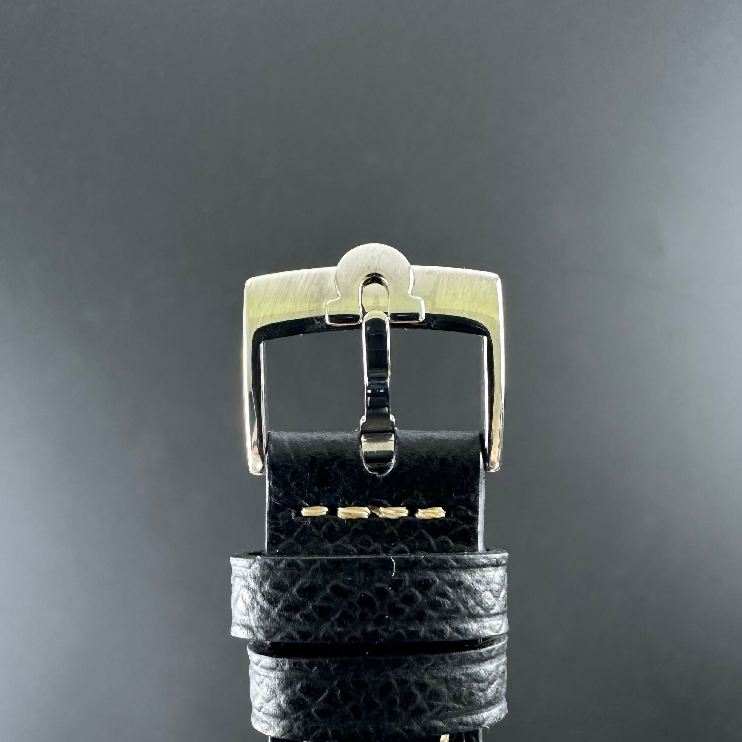 Diese Vintage Omega De Ville Prestige aus dem Jahr 1993 hat ein weißes Zifferblatt mit Sonnenschliff, eine kleine Sekunde, goldene Indexe, ein goldenes Omega-Logo, goldene Dauphine-Zeiger und eine goldene Lünette. Der Rest des Gehäuses ist aus Edelstahl, und das Zifferblatt ist schwarz. Die Uhr wurde beim Juwelier Ohlmeier in Hamburg gekauft und trägt auf dem Gehäuseboden die Gravur "Mutti 1996" ("Mother 1996"). Im Inneren befindet sich ein weißes Handaufzugswerk vom Kaliber 651, das im August 2025 überholt wurde und hervorragend läuft und funktioniert. Die Uhr ist mit einem schwarzen Kalbslederarmband mit cremefarbenen Nähten ausgestattet. Der Gesamtzustand ist wunderbar und macht sie zu einer idealen Anzugsuhr.