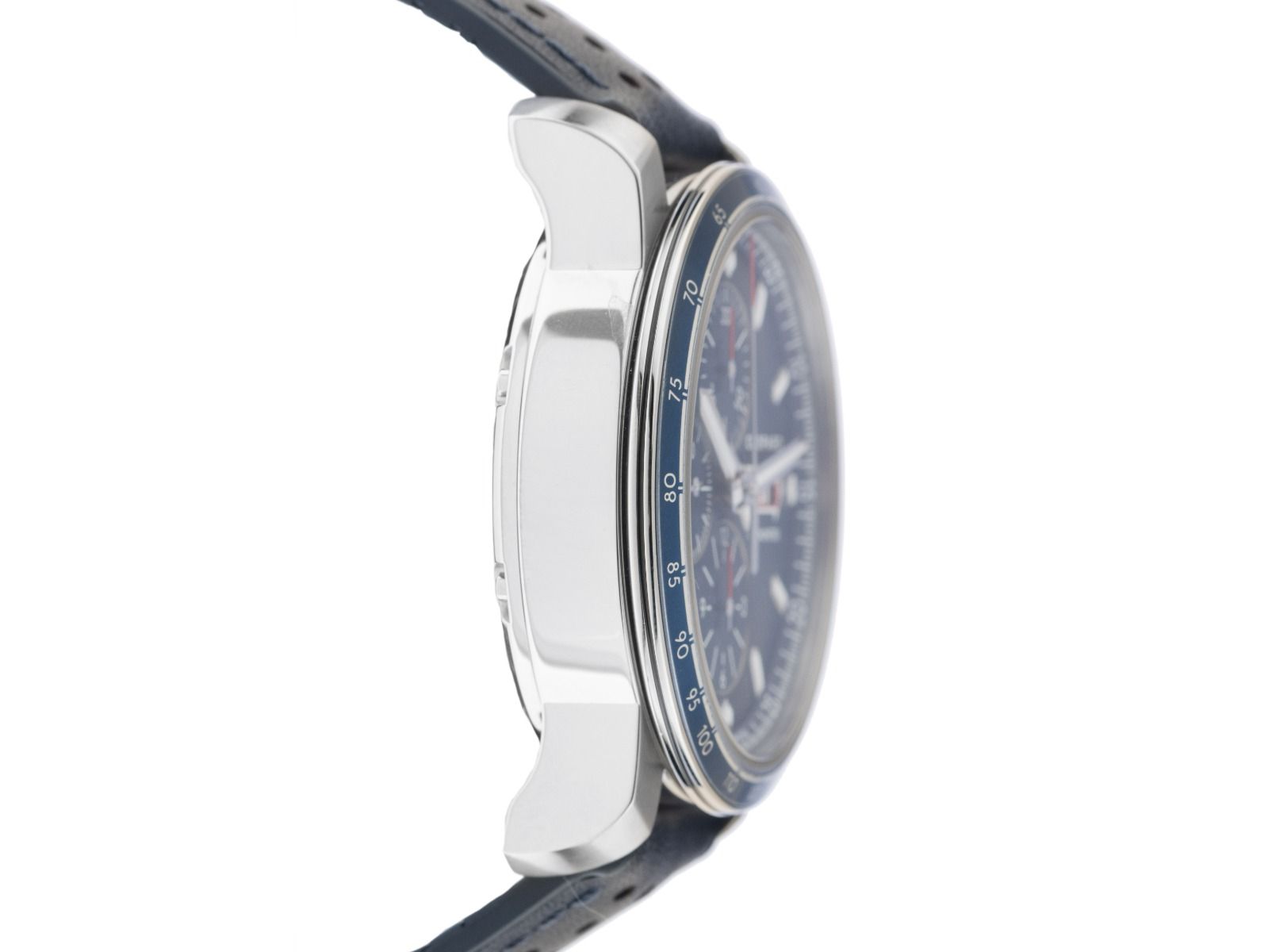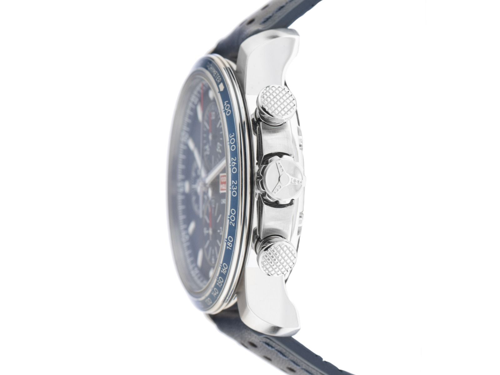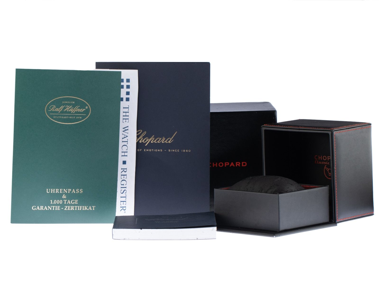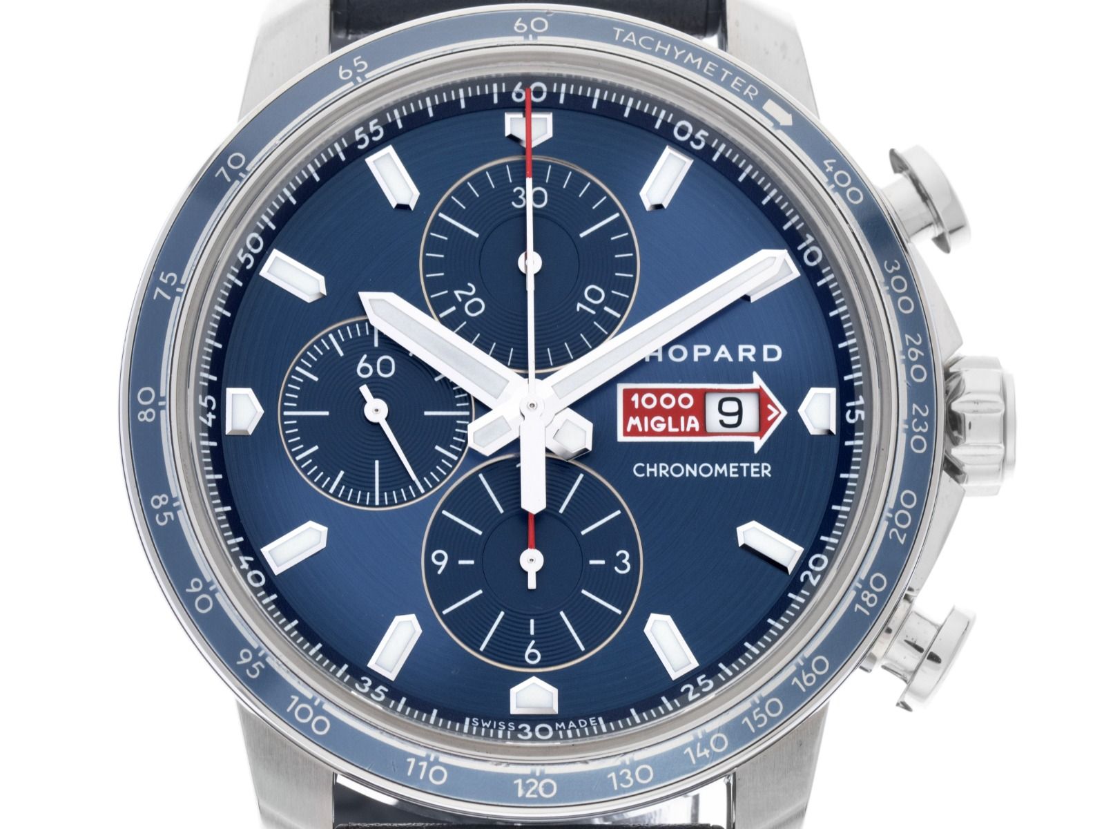 Gehäuse Edelstahl poliert, Gehäusedurchmesser ohne Krone 44mm, Gehäusehöhe 13,8mm. Lünette Edelstahl mit blauem Inlay und Tachymeter-Skala. Armband Leder blau mit Ziernaht, Anstoßbreite 21mm, Doppelsicherheitsfaltschließe Edelstahl mit Stiftverstellung und Hersteller-Logo. Zifferblatt Azzurro-Blau mit Sonnenschliff, aufgesetzten Edelstahl Indexen und Edelstahl Zeigern. Uhrwerk Automatik, Chronograph, COSC Chronometer mit Zeugnis, Kaliber Chopard 106377 mit 25 Edelsteinen. Anzeige von Stunde und Minute über Zeiger aus der Mitte, kleine Sekunde mit Sekundenstopp zur sekundengenauen Einstellung der Uhrzeit bei 9 Uhr, Datumsanzeige mit Schnellverstellung bei 3 Uhr. Saphirglas kratzfest. Krone verschraubt mit Hersteller-Logo. Boden Edelstahl 8-fach verschraubt und graviert. Gewicht der Uhr inklusive Armband 132g. Referenznummer: 168571-3007, Gehäusenummer: 4162XXX, Baujahr: 2013, ID: P138764000825H-7100, Artikelnummer: 10000081961. Mit Gangkontrolle und kompletter äußerlicher Aufarbeitung von August 2025. Original Chopard Box mit Umkarton und Garantie Papiere ohne Datumseintrag sowie Beschreibung und Watchregister Auszug von August 2025, The Watch Register Zertifikat / ohne Eintrag (Internationale Datenbank für verlorene oder gestohlene Uhren), Full Set. Limitiert auf 750 Exemplare. Sehr guter Zustand. Lieferzeit sofort.