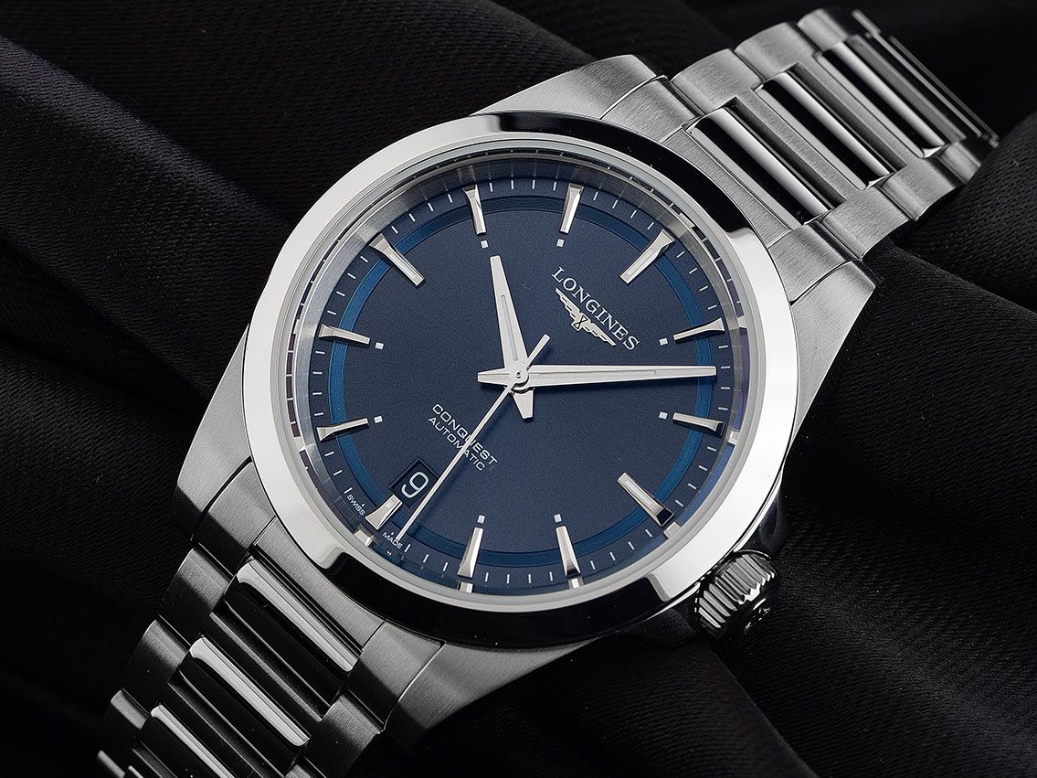 Longines Conquest Stahl Automatik Armband StahlGehäuse Edelstahl poliert, Gehäusedurchmesser ohne Krone 38mm, Gehäusehöhe 10,9mm. Lünette Edelstahl glatt und poliert. Armband Edelstahl poliert und satiniert, Doppelsicherheitsfaltschließe Edelstahl mit Hersteller-Logo. Zifferblatt blau mit Sonnenschliff, aufgesetzten Edelstahl Indexen und Edelstahl Leuchtzeigern. Uhrwerk Automatik, Kaliber Longines L888 mit 21 Edelsteinen, Gangreserve ca. 72 Stunden. Anzeige von Stunde, Minute und Sekunde über Zeiger aus der Mitte mit Sekundenstopp zur sekundengenauen Einstellung der Uhrzeit, Datumsanzeige mit Schnellverstellung bei 6 Uhr. Saphirglas kratzfest. Krone verschraubbar mit Hersteller-Logo. Boden Edelstahl verschraub und graviert mit Saphirglas Sichtfenster. Gewicht der Uhr inklusive Armband 123g, Länge des Armbandes inklusive Gehäuse 190mm. Referenznummer: L3.720.4.92.6, ID: ST580633000825H-2250, Artikelnummer: 10000082091. Original Longines Box mit Umkarton und Garantie Papiere von August 2025, Full Set. Ungetragen. Lieferzeit sofort.