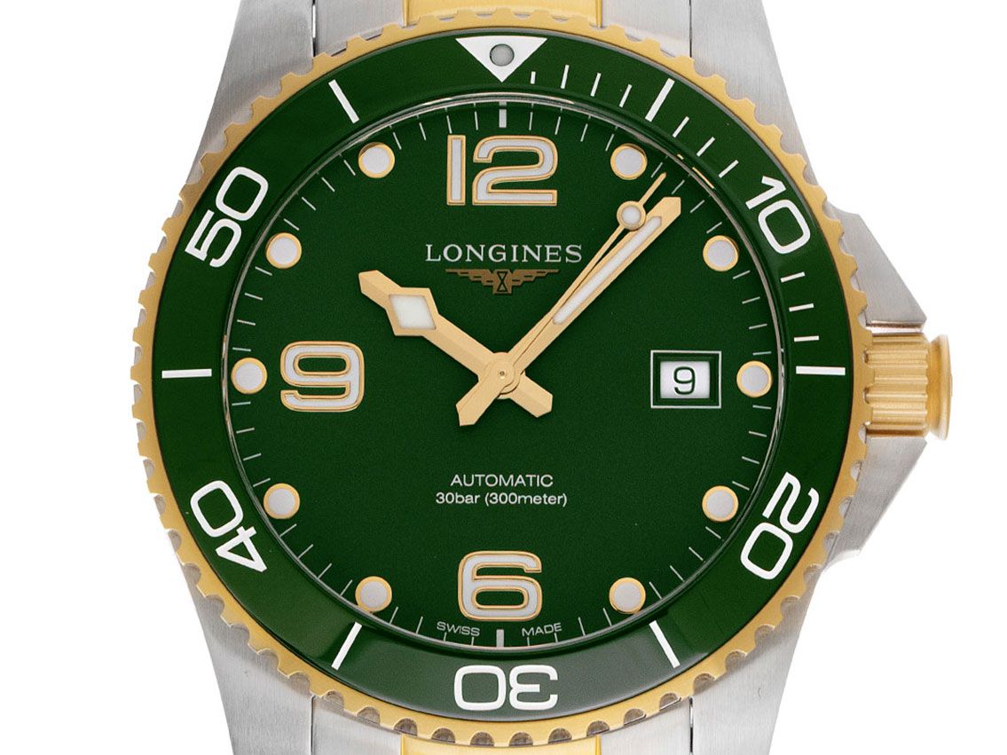 Gehäuse Edelstahl satiniert, Gehäusedurchmesser ohne Krone 43mm, Gehäusehöhe 11,9mm. Lünette Gelbgold mit grünem Keramik Inlay, 60-Minuten Einteilung, einseitig drehbar. Armband Edelstahl /Gelbgold poliert und satiniert, Sicherheitsfaltschließe Edelstahl mit Hersteller-Logo. Zifferblatt grün mit aufgesetzten gelbgoldenen Leuchtindexen, arabischen Leuchtziffern und gelbgoldenen Leuchtzeigern. Uhrwerk Automatik, Longines Kaliber L 888 mit 21 Edelsteinen, Gangreserve ca. 72 Stunden... Anzeige von Stunde, Minute und Sekunde über Zeiger aus der Mitte mit Sekundenstopp zur sekundengenauen Einstellung der Uhrzeit, Datumsanzeige mit Schnellverstellung bei 3 Uhr. Saphirglas kratzfest. Krone verschraubbar mit Flankenschutz und Hersteller-Logo. Boden Edelstahl verschraubt und graviert. Gewicht der Uhr inklusive Armband 194g, Länge des Armbandes inklusive Gehäuse 220mm. Wasserdicht bis 30 ATM. Referenznummer: L3.782.3.067, ID: ST580631600825H-2200, Artikelnummer: 10000082093. Original Longines Box mit Umkarton und Garantie Papiere von August 2025, Full Set. Ungetragen. Lieferzeit sofort.