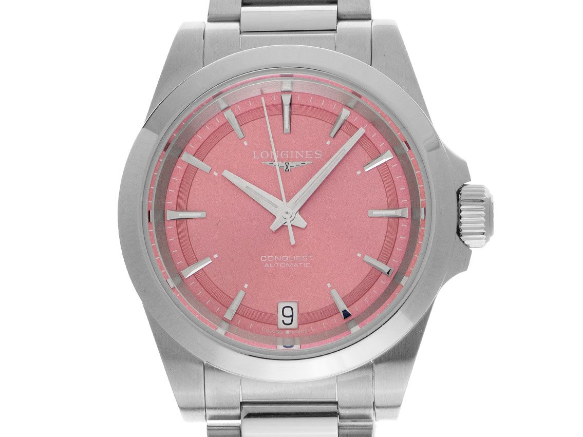 Longines Conquest Stahl Automatik Armband StahlGehäuse Edelstahl poliert, Gehäusedurchmesser ohne Krone 34mm, Gehäusehöhe 10,9mm. Lünette Edelstahl glatt und poliert. Armband Edelstahl poliert und satiniert, Doppelsicherheitsfaltschließe Edelstahl mit Hersteller-Logo. Zifferblatt pink mit Sonnenschliff, aufgesetzten Edelstahl Indexen und Edelstahl Leuchtzeigern. Uhrwerk Automatik, Kaliber Longines L888 mit 21 Edelsteinen, Gangreserve ca. 72 Stunden. Anzeige von Stunde, Minute und Sekunde über Zeiger aus der Mitte mit Sekundenstopp zur sekundengenauen Einstellung der Uhrzeit, Datumsanzeige mit Schnellverstellung bei 6 Uhr. Saphirglas kratzfest. Krone verschraubbar mit Hersteller-Logo. Boden Edelstahl verschraub und graviert mit Saphirglas Sichtfenster. Gewicht der Uhr inklusive Armband 96g, Länge des Armbandes inklusive Gehäuse 170mm. Referenznummer: L3.430.4.99.6, ID: ST580633000825H-2250, Artikelnummer: 10000082103. Original Longines Box mit Umkarton und Garantie Papiere von August 2025, Full Set. Ungetragen. Lieferzeit sofort.