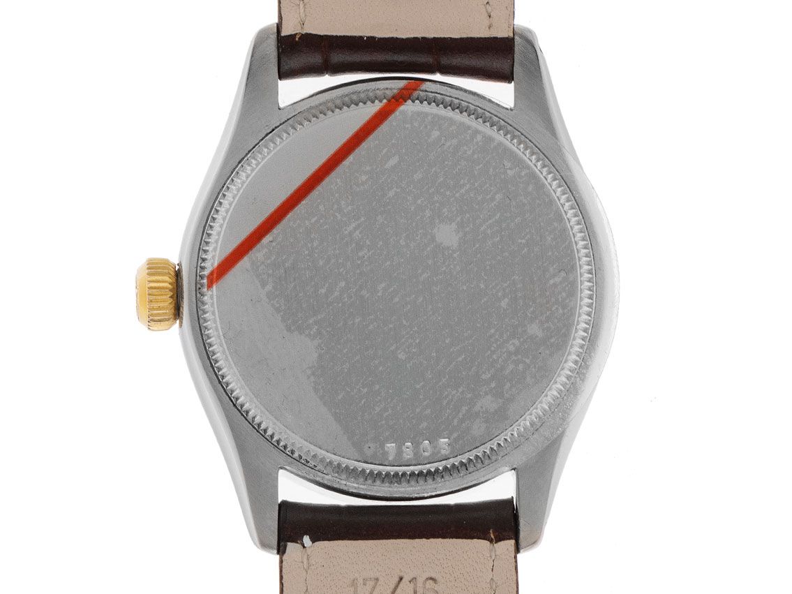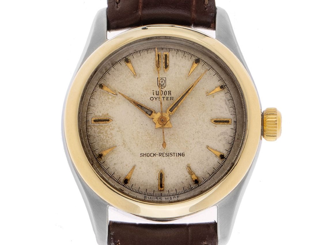 Gehäuse aus poliertem und satiniertem Edelstahl, Gehäusedurchmesser ohne Krone 32mm, Gehäusehöhe 10,3mm. Lünette aus Edelstahl, vergoldet in Gelbgold, glatt und poliert. Armband aus braunem Leder mit Ziernaht, Anstoßbreite 17mm, Rolex Stiftschließe aus Edelstahl mit Hersteller-Logo. Zifferblatt cremeweiß mit Patina, aufgesetzten Indexen und Zeigern in Gelbgold. Uhrwerk Handaufzug, Kaliber Tudor 1182 mit 17 Edelsteinen. Anzeige von Stunde, Minute und Sekunde über Zeiger aus der Mitte. Gewölbtes Plexiglas. Geriffelte Krone. Boden aus Edelstahl, verschraubt und graviert. Gewicht der Uhr inklusive Armband 41g. Referenznummer: 7803, Gehäusenummer: 83XXX, Baujahr: 1965, ID: P140311000825H-3200, Artikelnummer: 10000082007. Mit Gangkontrolle und kompletter äußerlicher Aufarbeitung von September 2025. Original Tudor Reiseetui und Auszug aus dem Watchregister von September 2025, The Watch Register Zertifikat / ohne Eintrag (Internationale Datenbank für verlorene oder gestohlene Uhren). Superschnäppchen, Kapitalanlage mit Wertsteigerungspotential, extrem seltenes Sammlerstück. Sehr guter Zustand. Lieferzeit sofort.
