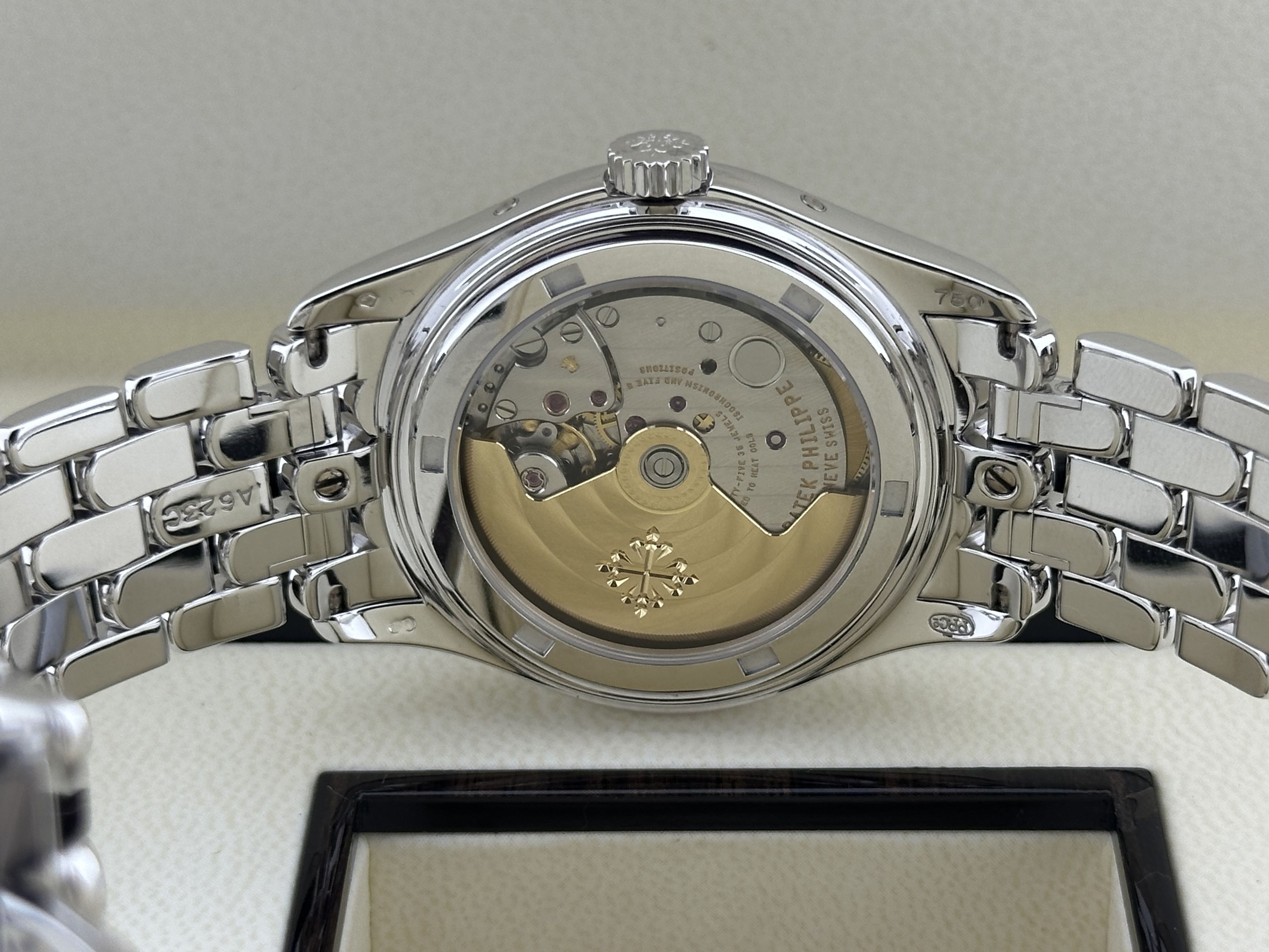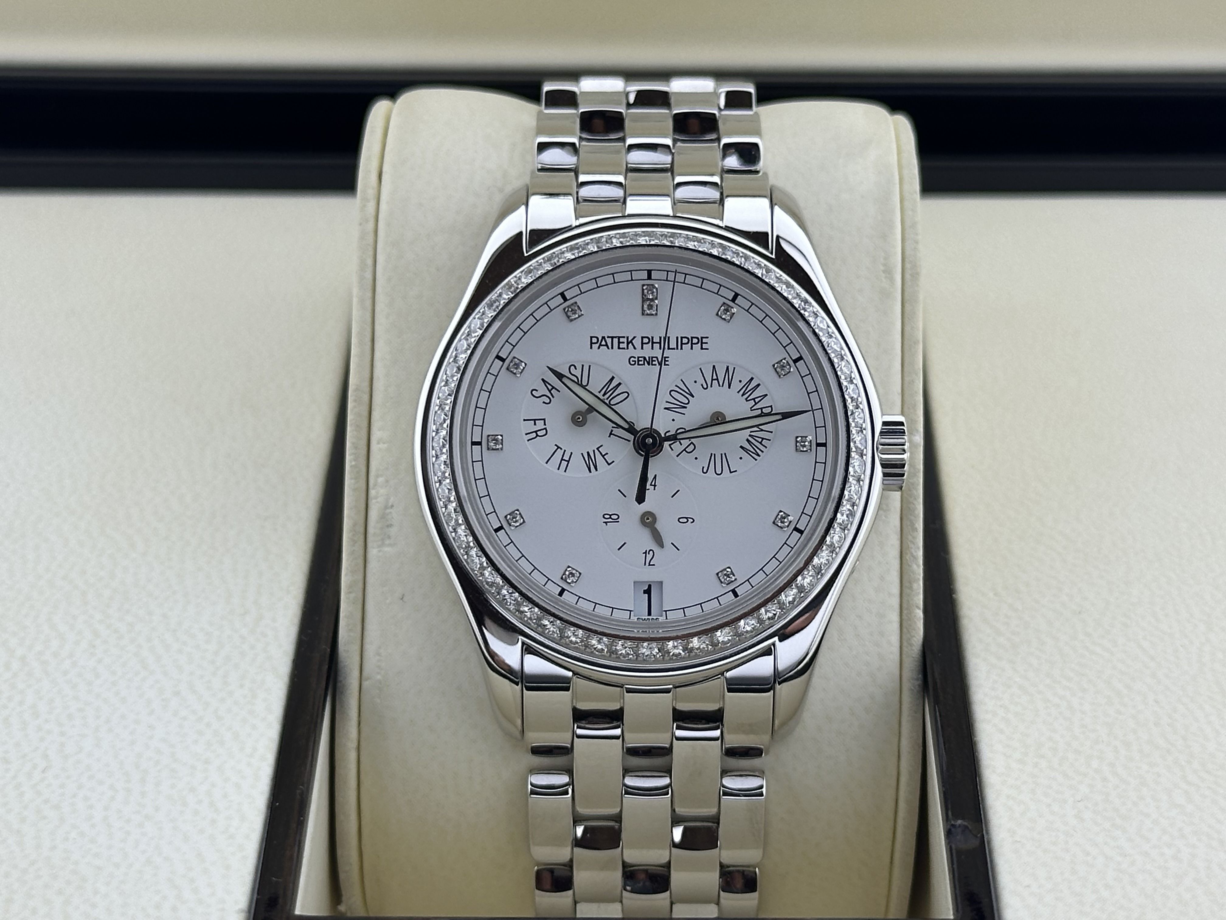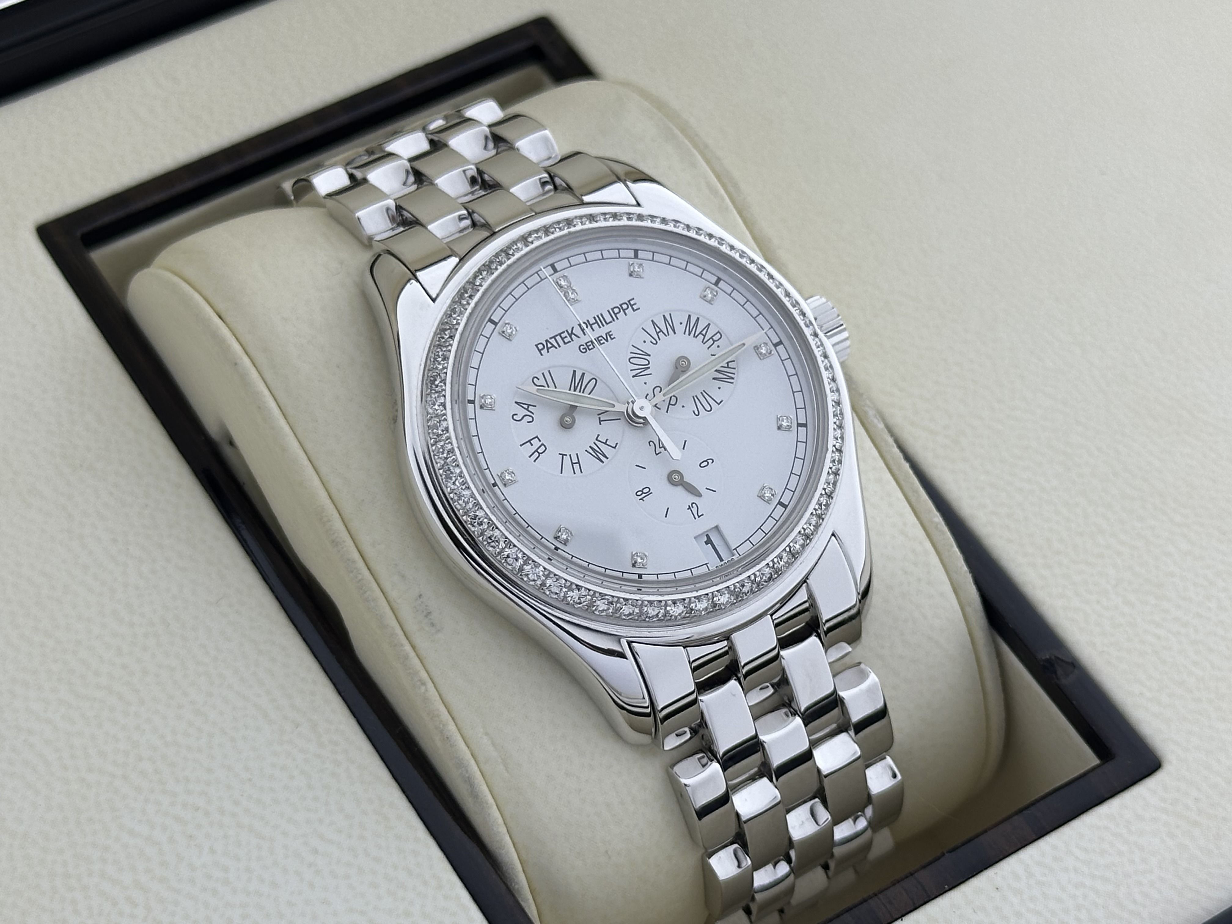 Eine weißgoldene Patek Philippe Annual Calendar, Ref. 5037/1G-001. Die Patek Philippe Uhr hat ein 37-mm-Gehäuse aus 18 Karat Weißgold mit einer Diamantlünette und ist an einem Armband aus 18 Karat Weißgold befestigt. Die Uhr hat ein weißes Zifferblatt mit 11 Diamanten im Brillantschliff und 3 Hilfszifferblätter für den Tag, den Monat, die 24-Stunden-Anzeige und ein Datumsfenster bei 6 Uhr. Die Uhr ist mit einem Kaliber 315/198 ausgestattet und wurde bei Patek Philippe einem kompletten Service unterzogen. Diese 5037 ist ein einzigartiges Modell. Sie ist die einzige Patek Philippe Annual Calendar mit einer Diamantlünette und wird an einem Edelmetallarmband geliefert. Dieses Modell wurde zwischen 1998 und 2004 hergestellt. Die Uhr wurde auch in der Serie "Soprano's" gesehen, in der der Hauptdarsteller Tony Soprano die Uhr seinem Cousin schenkt.