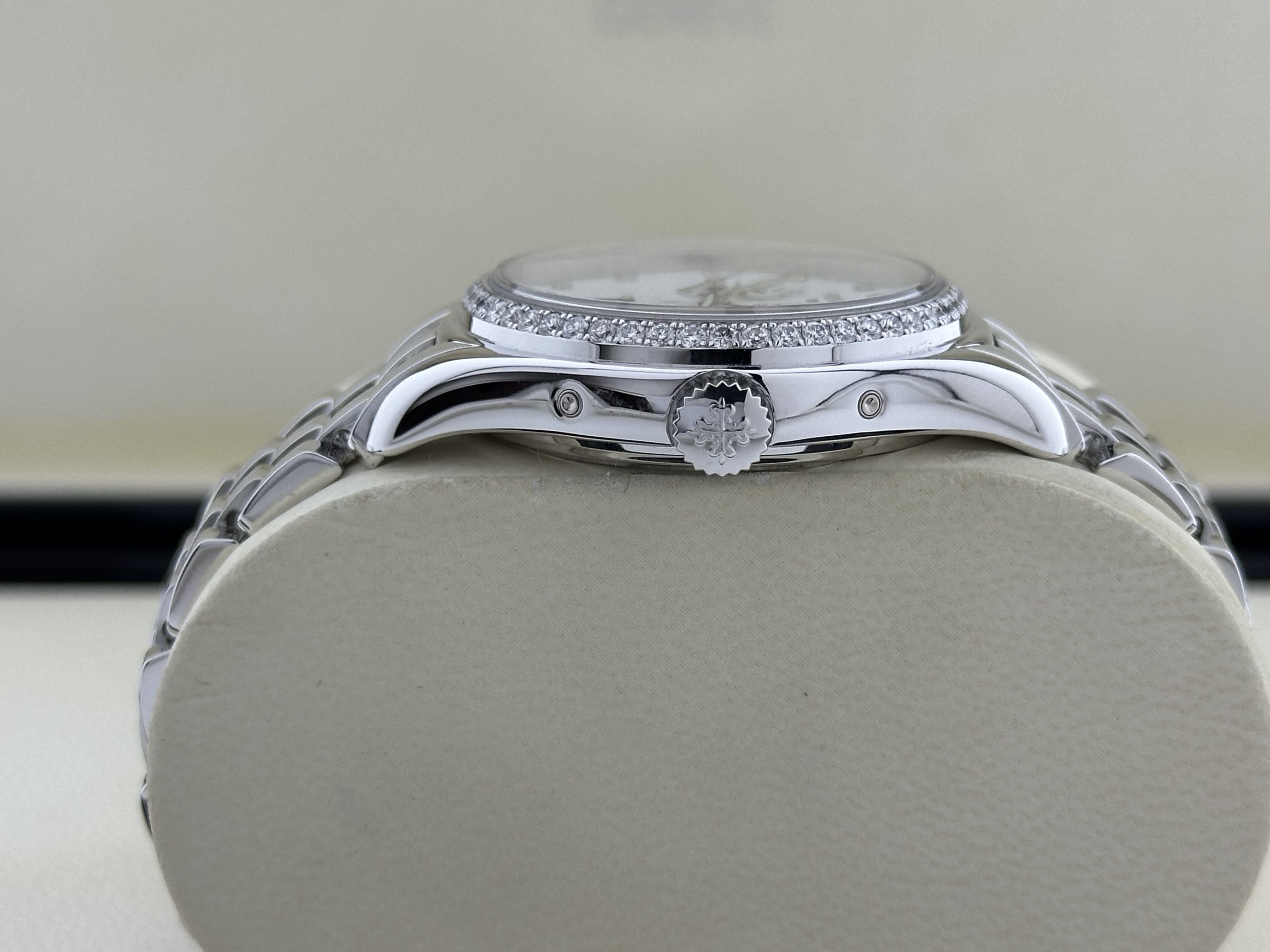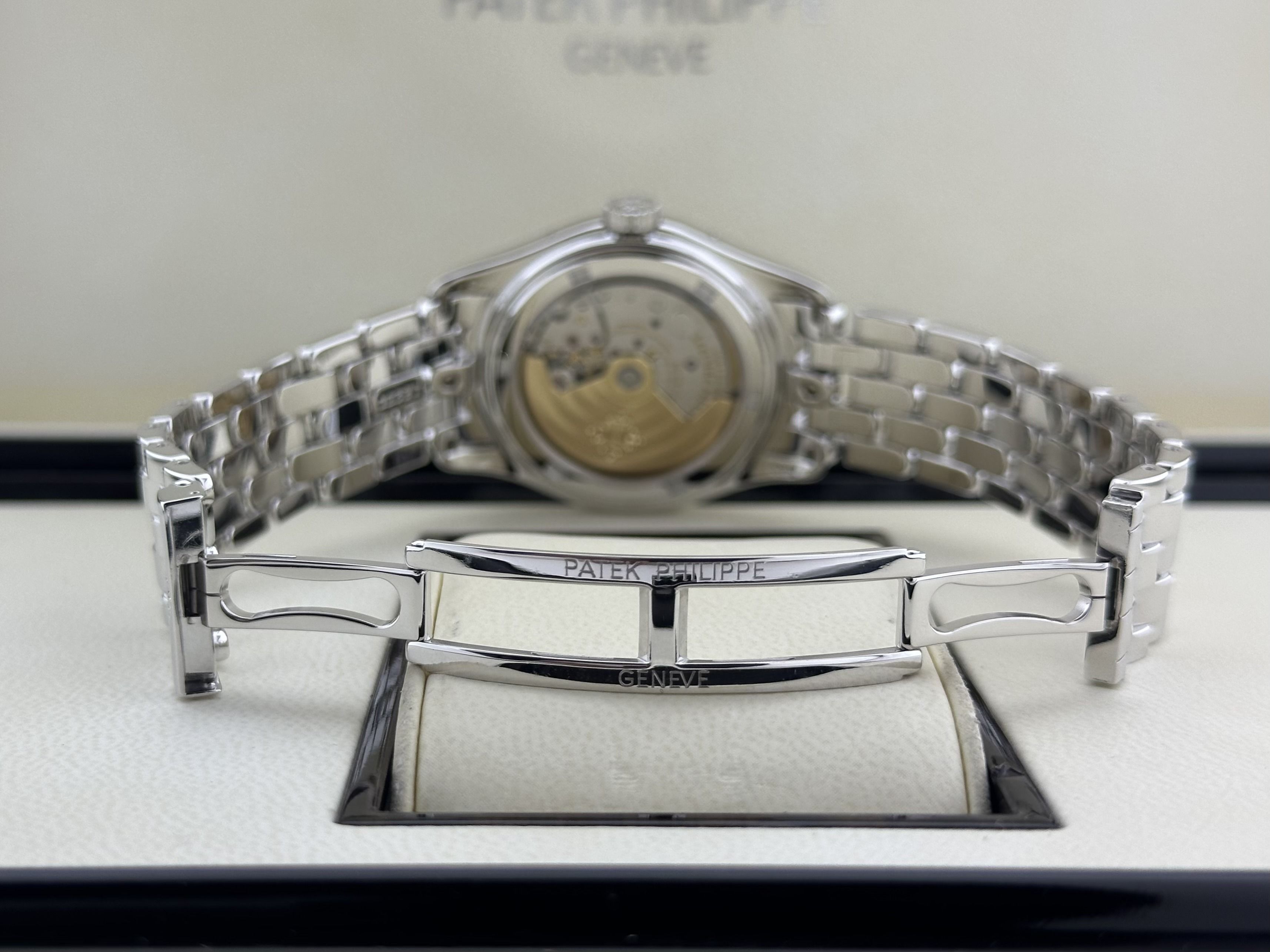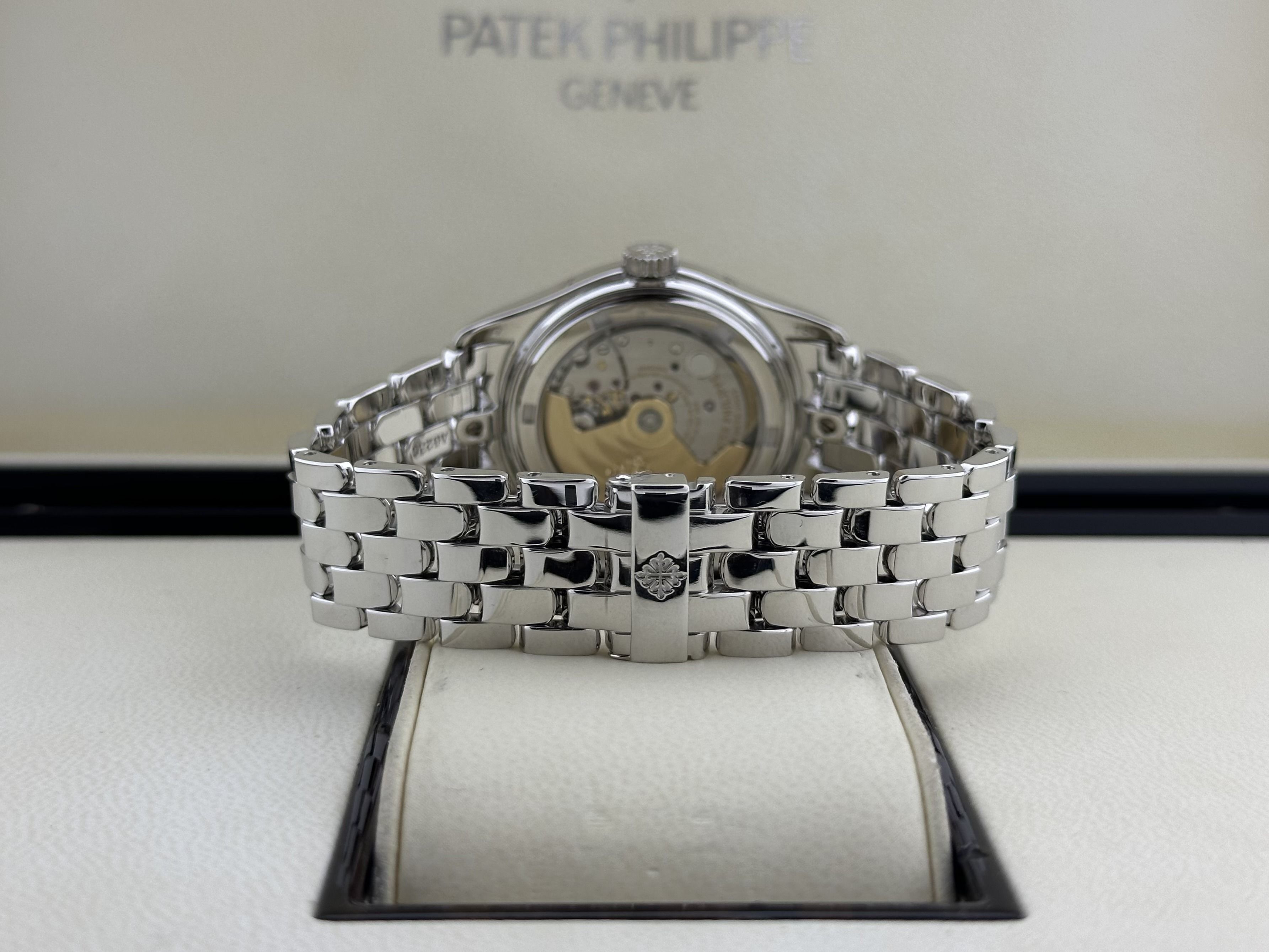 Eine weißgoldene Patek Philippe Annual Calendar, Ref. 5037/1G-001. Die Patek Philippe Uhr hat ein 37-mm-Gehäuse aus 18 Karat Weißgold mit einer Diamantlünette und ist an einem Armband aus 18 Karat Weißgold befestigt. Die Uhr hat ein weißes Zifferblatt mit 11 Diamanten im Brillantschliff und 3 Hilfszifferblätter für den Tag, den Monat, die 24-Stunden-Anzeige und ein Datumsfenster bei 6 Uhr. Die Uhr ist mit einem Kaliber 315/198 ausgestattet und wurde bei Patek Philippe einem kompletten Service unterzogen. Diese 5037 ist ein einzigartiges Modell. Sie ist die einzige Patek Philippe Annual Calendar mit einer Diamantlünette und wird an einem Edelmetallarmband geliefert. Dieses Modell wurde zwischen 1998 und 2004 hergestellt. Die Uhr wurde auch in der Serie "Soprano's" gesehen, in der der Hauptdarsteller Tony Soprano die Uhr seinem Cousin schenkt.