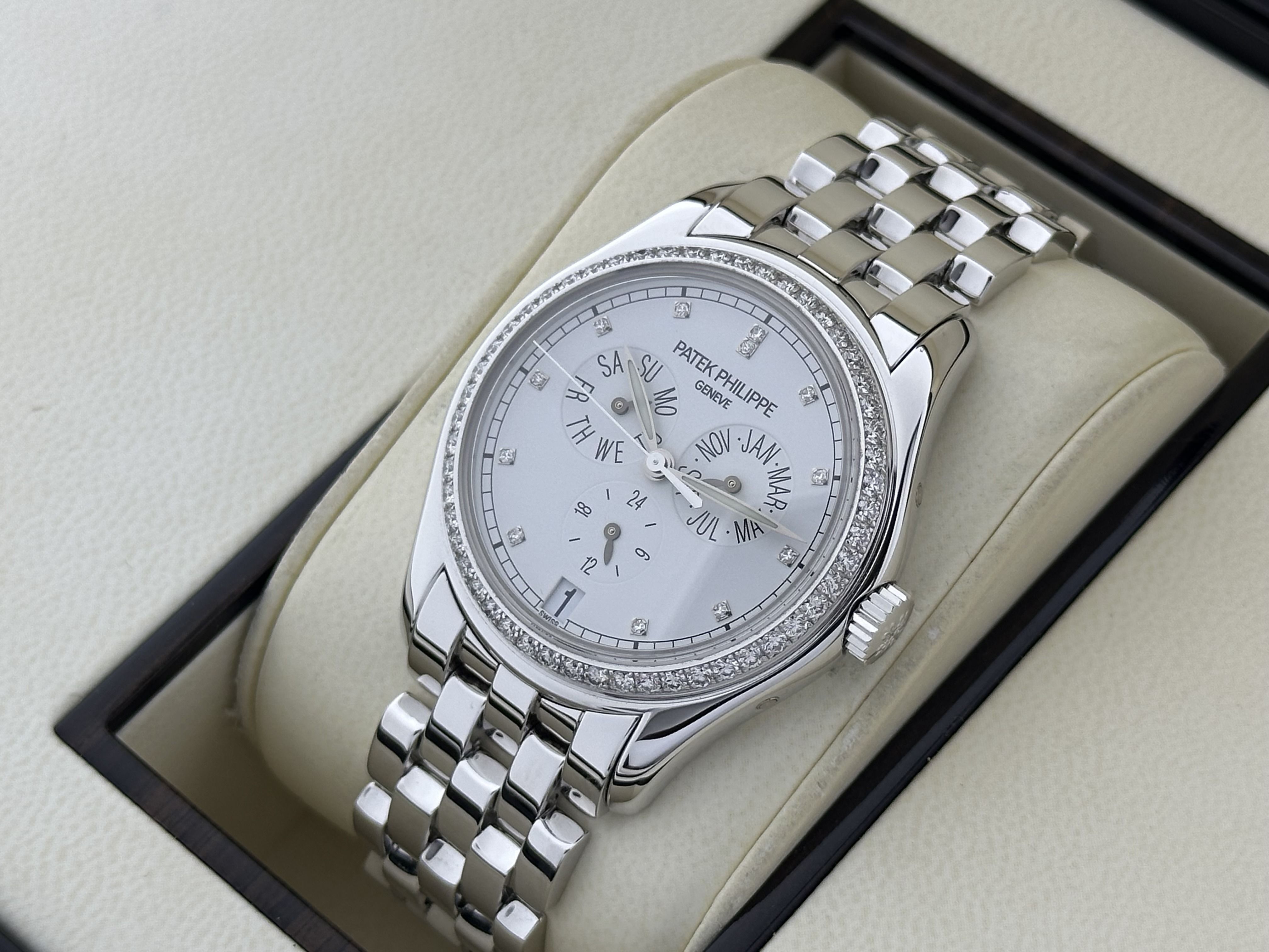 The Patek Philippe comes with 24 months of warrantyA whitegold Patek Philippe Annual Calendar, ref. 5037/1G-001. The Patek Philippe watch has an 18k white gold 37mm case with a diamond bezel and is fitted on an 18k white gold bracelet. The watch has a white dial with 11 brilliant cut diamonds and 3 subdials for the day, month, 24-hours indication and a date-window at 6 o'clock. The watch has a cal. 315/198 movement and has undergone a full service at Patek Philippe. This 5037 is a unique model. This is the only Patek Philippe Annual Calendar with a diamond bezel and delivered on a precious metal bracelet. This model was made between 1998 and 2004. The watch has also been spotted in the show 'Soprano's' where the main character, Tony Soprano gifts the watch to his cousin.