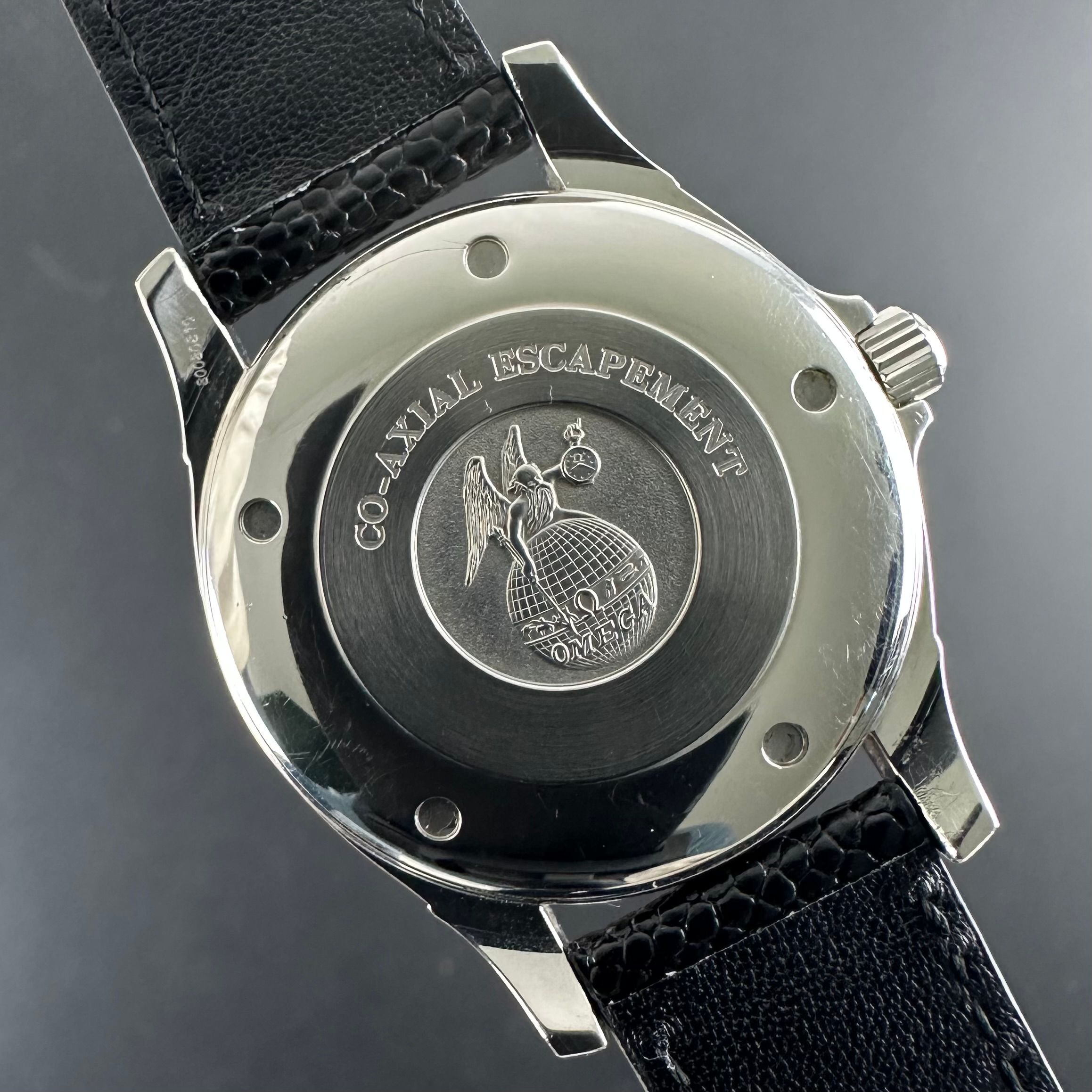 The piece is accompanied by its original Omega international warranty card and the Co-Axial escapement three-year warranty tag. Originally purchased from a Japanese jeweler, this watch stands out for its remarkable condition, originality, and timeless appeal.
