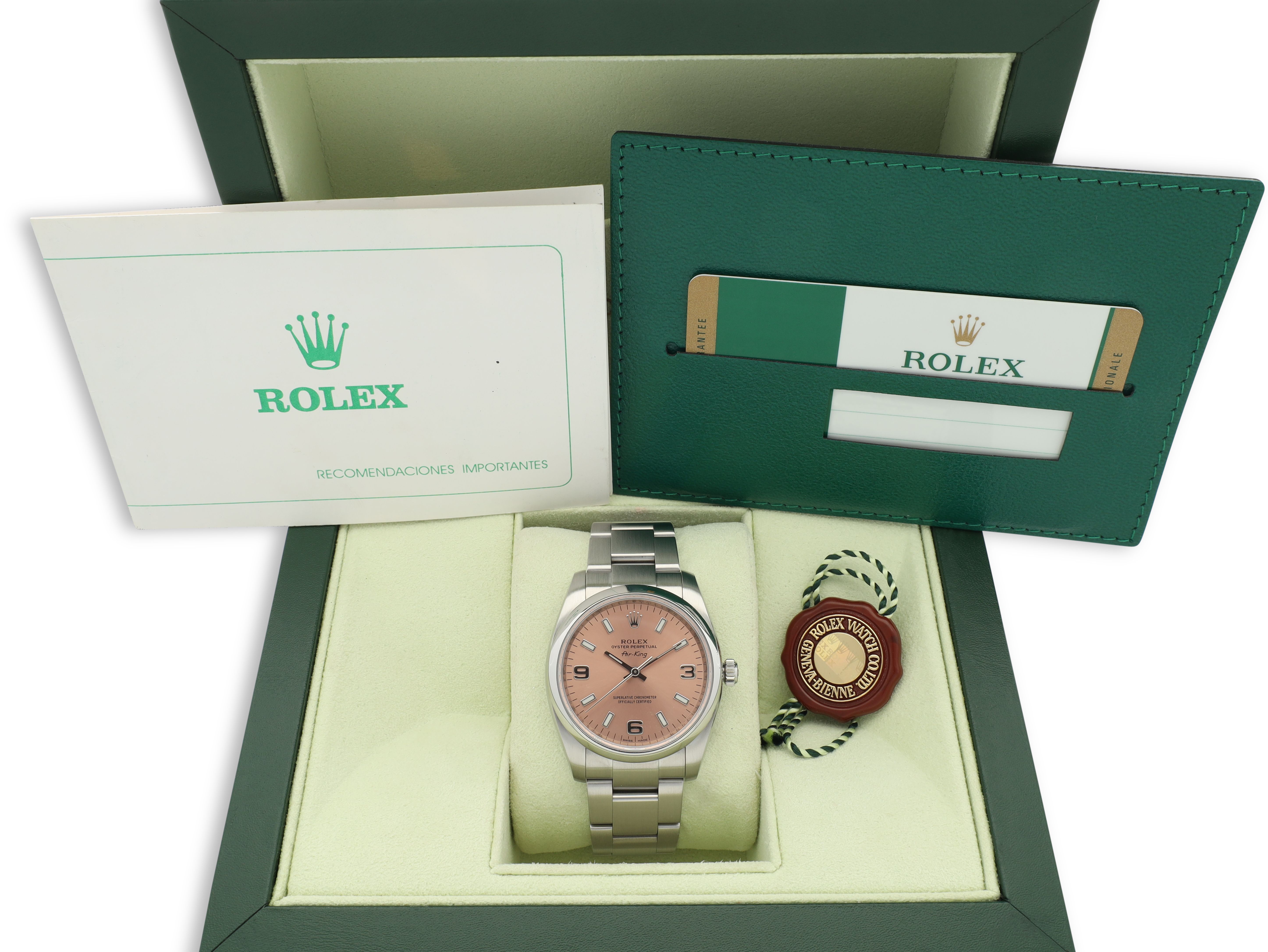 The Rolex Oyster Perpetual with reference 114200 from 2014 comes as a full set, including the original box, papers, booklets, hang tag, and Rolex warranty card. This rare and elegant configuration features a soft pink dial, giving the watch a subtle yet refined presence that stands out through simplicity.The 34 mm Oystersteel case is fitted with a smooth bezel and paired with the Oyster bracelet, known for its solid construction and sporty feel. Its versatile size makes it a perfect fit for both men and women.
