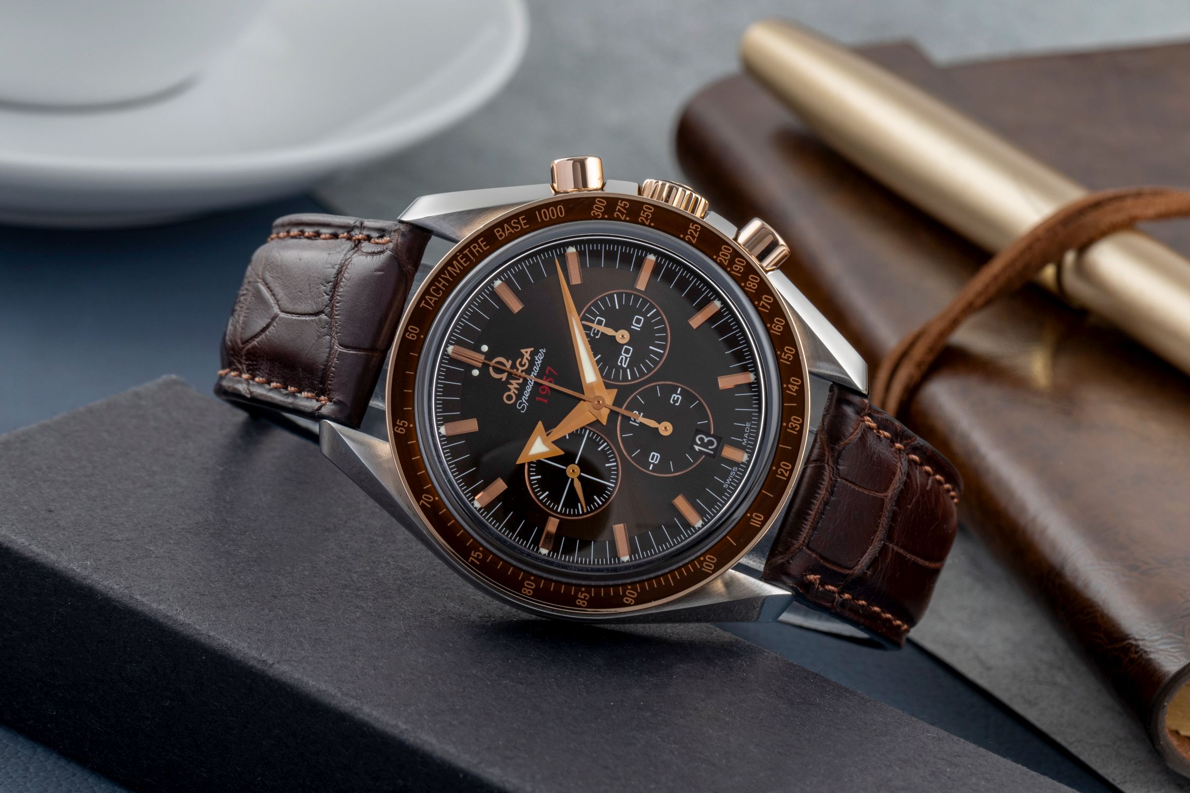 Alternative title: Omega 321.93.42.50.13.001 Speedmaster Broad Arrow 1957 Stainless Steel / Red Gold / Brown; Omega Speedmaster Broad Arrow Chronograph Stahl / Gold Ref. 321.93.42.50.13.001 [2504754]