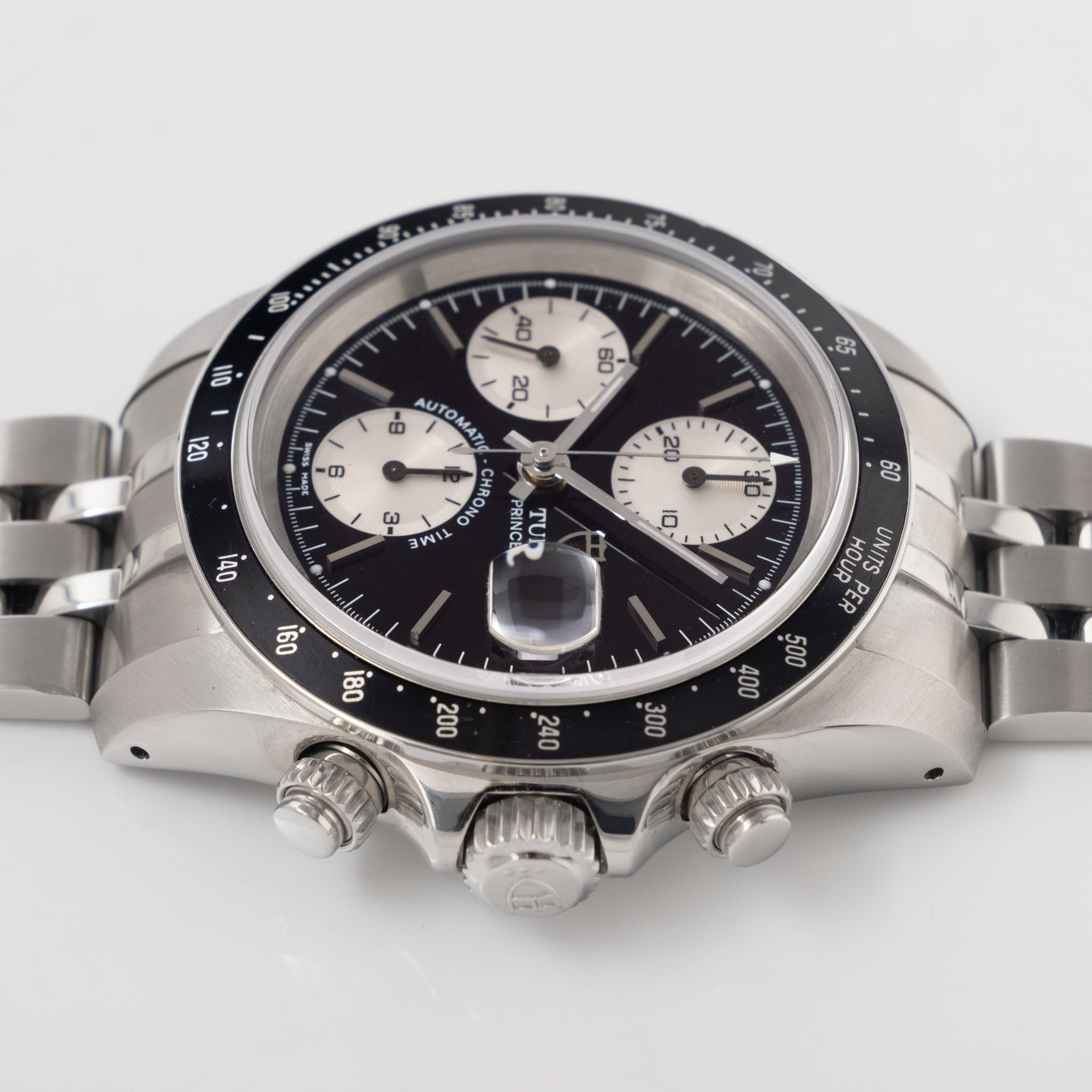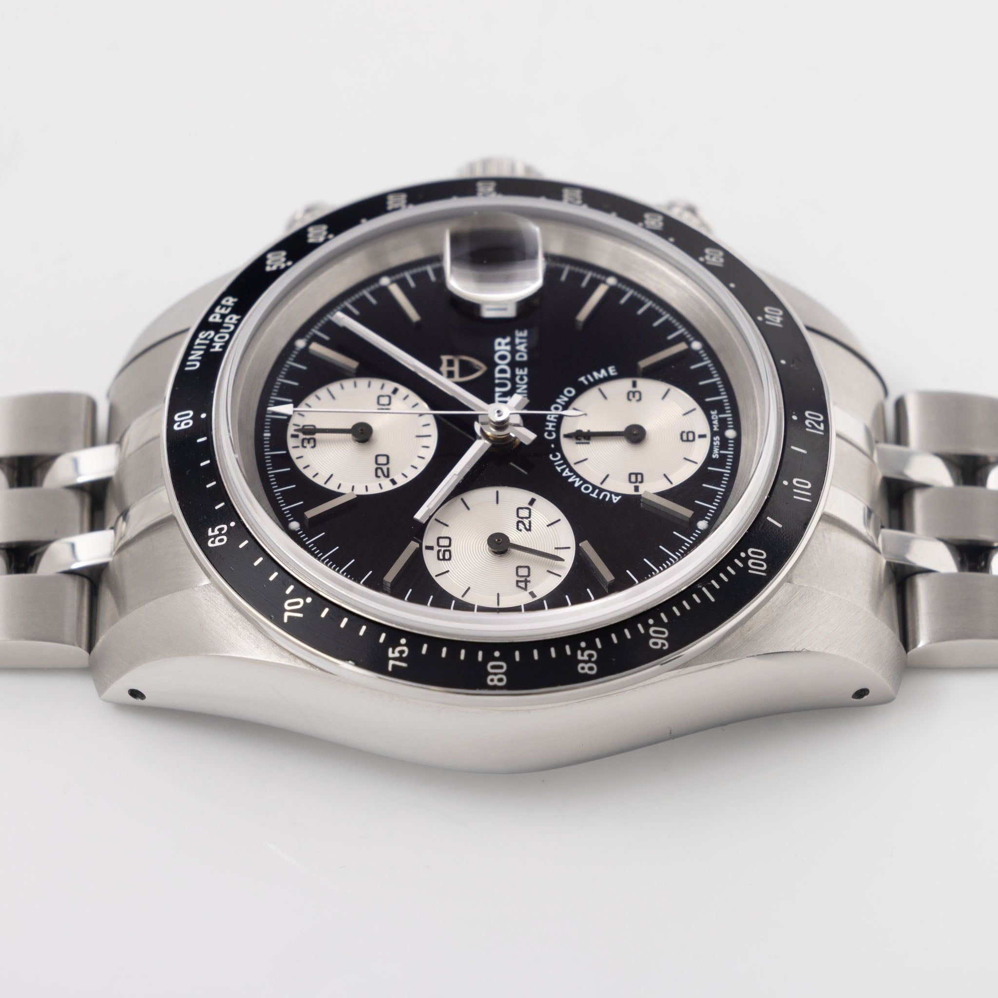 In 1995, Tudor introduced the Prince Chronograph, marking a significant shift in the design of its chronograph line. Prior models, including the well-known Big Block series, were characterized by their chunky cases, flat sides, and bold wrist presence. With the launch of the Prince Chronograph, Tudor moved in a new direction — the case was completely reworked with softer contours and a more refined silhouette, closely echoing the design language of the Rolex Daytona. This updated look was complemented by the addition of a sapphire crystal, which gave the watch a sleeker profile and a more modern feel on the wrist. This Ref. 79260 features a lovely case, an unmolested black "Units per Hour" fixed tachymeter bezel, and a stunning gloss black dial with three silver gloss sub-dials. The “Jubilee”-style five-row link bracelet is a Ref. 62490, with solid end links and a clasp marked “AB4.” This cool Small Block has been fully checked by our watchmaker, and its Tudor-modified Valjoux 7750 automatic movement has been regulated. Often considered something of a ‘sleeping giant’, these fourth-series chronographs are finally gaining traction as collectors begin to appreciate their modern aesthetics and exceptional build quality. Get in touch! Specifications: Tudor Chronograph Prince Date reference 79260 “Small block “black dial 40mm steel case Serial h35xxxx dating to 2002 Black tachymeter bezel Black gloss dial with applied hours and silver sub dials Steel Tudor “jubilee “ style bracelet ref 62490 with solid end links Fully checked by our watchmaker One-year mechanical warranty Free worldwide Fedex Priority shipping