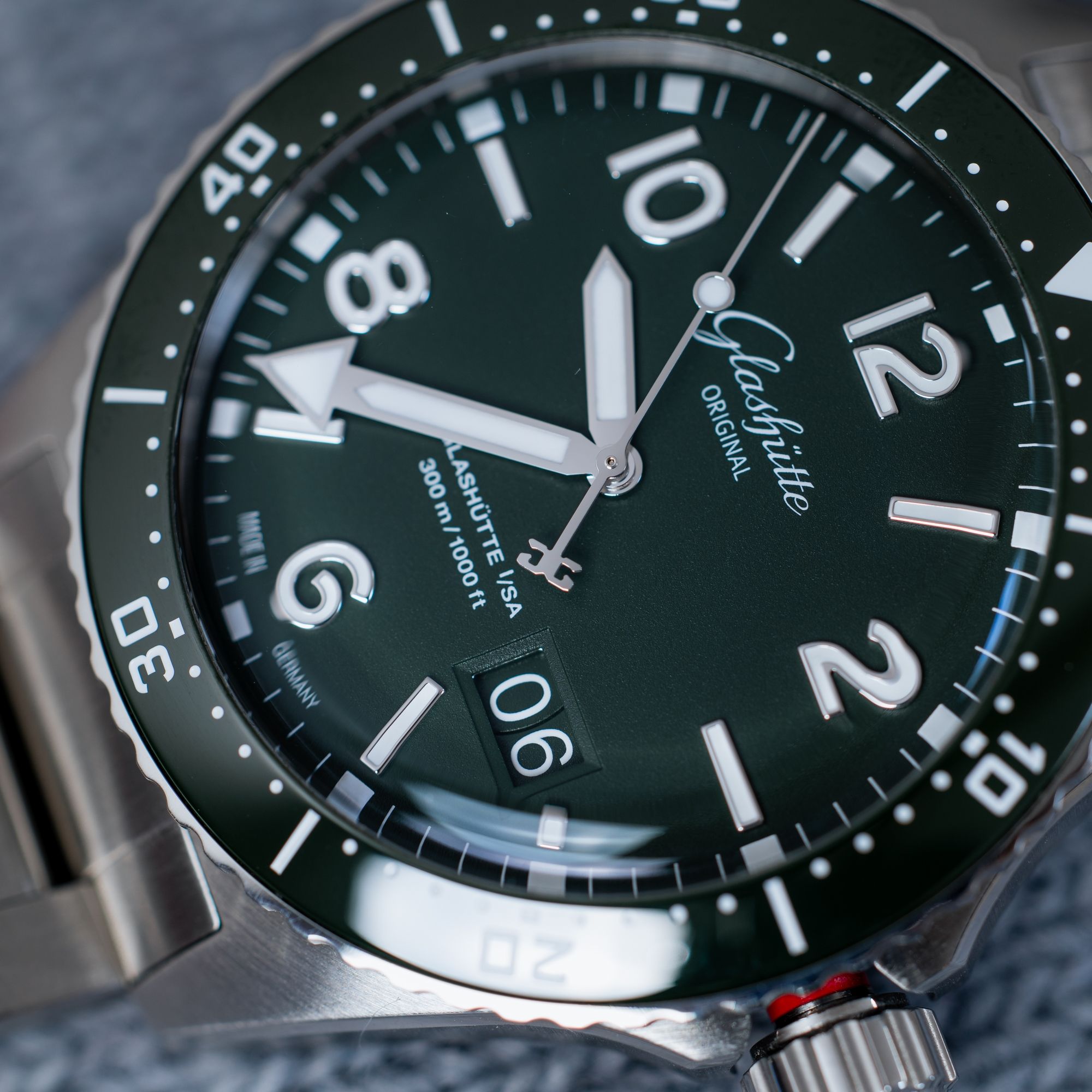 I am pleased to present one of the most desirable versions of this model – the 43.2 mm green dial edition, paired with the latest-generation fully brushed bracelet with micro-adjustment.Introduced in 2019, the SeaQ takes inspiration from the historic “Spezimatic Type RP TS 200”, while being fully modernized to meet today’s technical standards. The Panorama Date combines vintage diver aesthetics with Glashütte Original’s signature large date display, making it both highly functional and uniquely elegant.