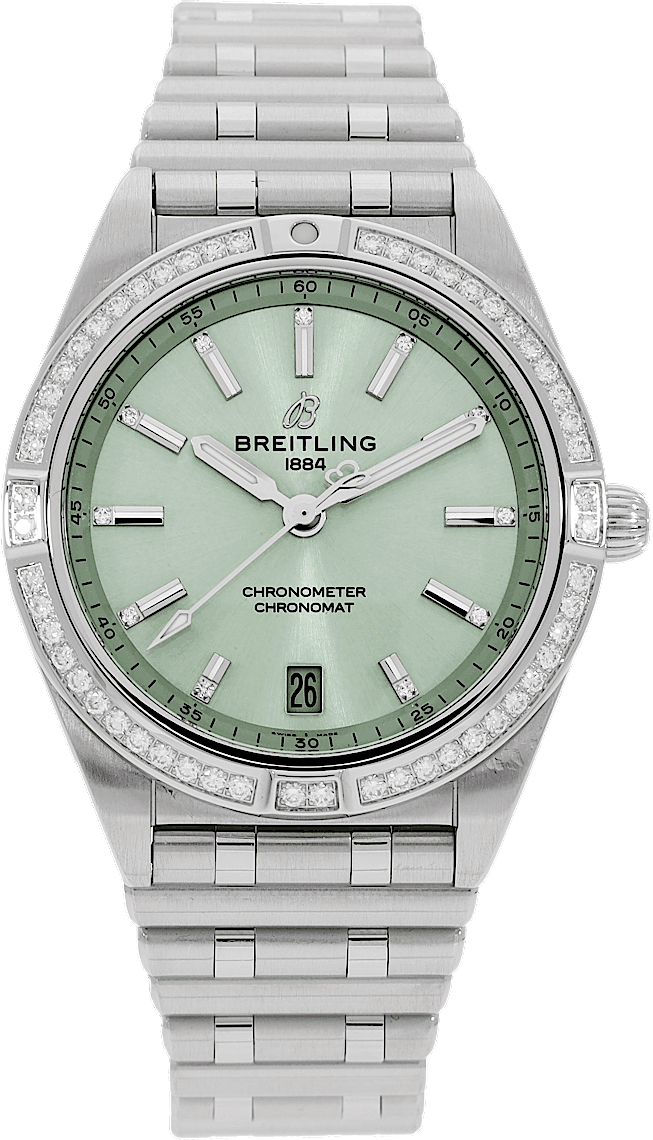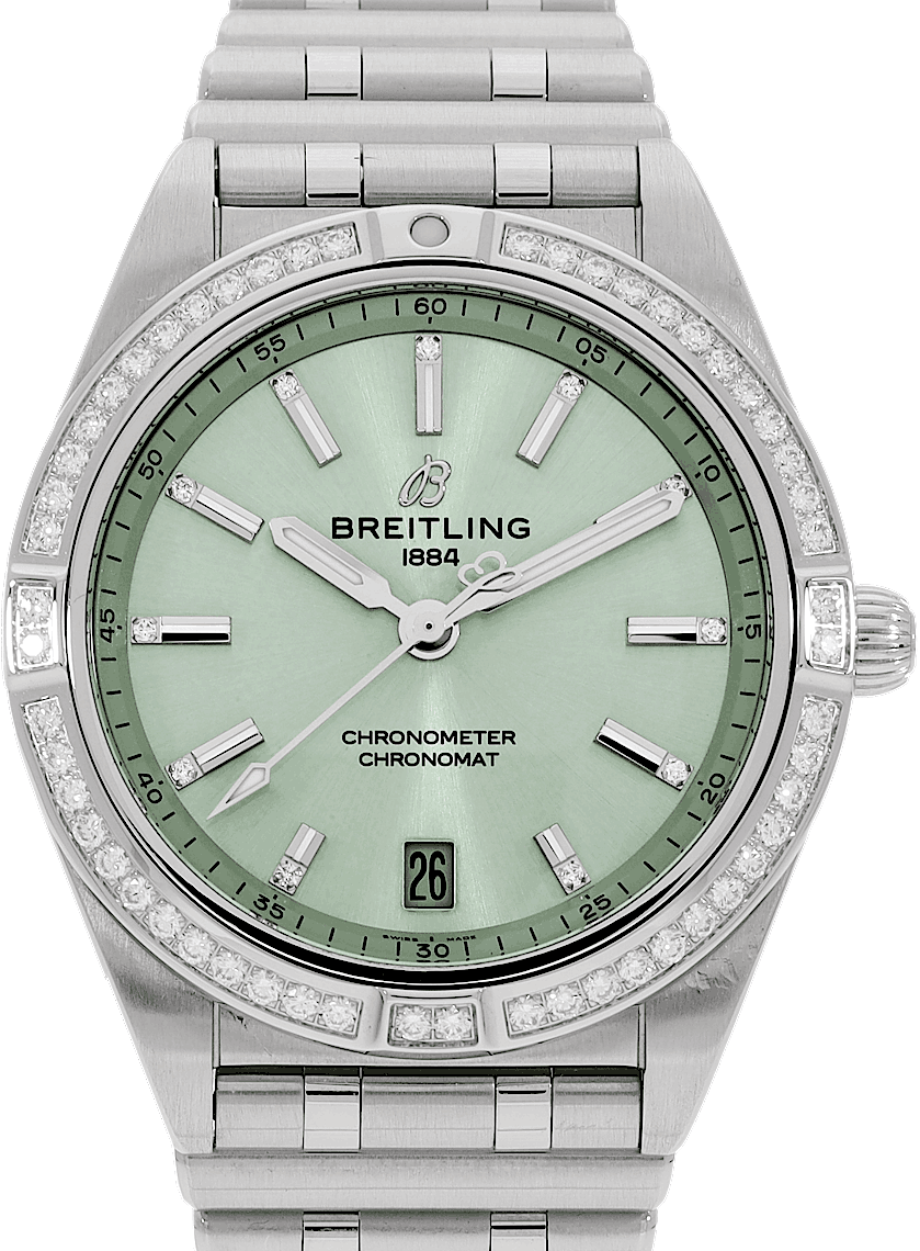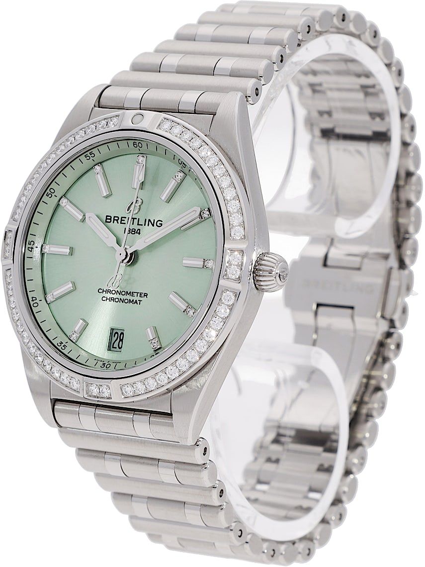 Breitling Chronomat 36, Reference: A10380611L1P1, Gender: Unisex, Size: 36mm, Dial color: Green, Strap material: Stainless Steel, Movement: Automatic, Year: 2023, Condition: Previously worn with some signs of usage. The movement is flawless and the case has been cleaned. watch tested to ensure full functionality. An inspection by our certified watchmakers guarantees its authenticity., Documents: Original papers, CHRONEXT Certificate
