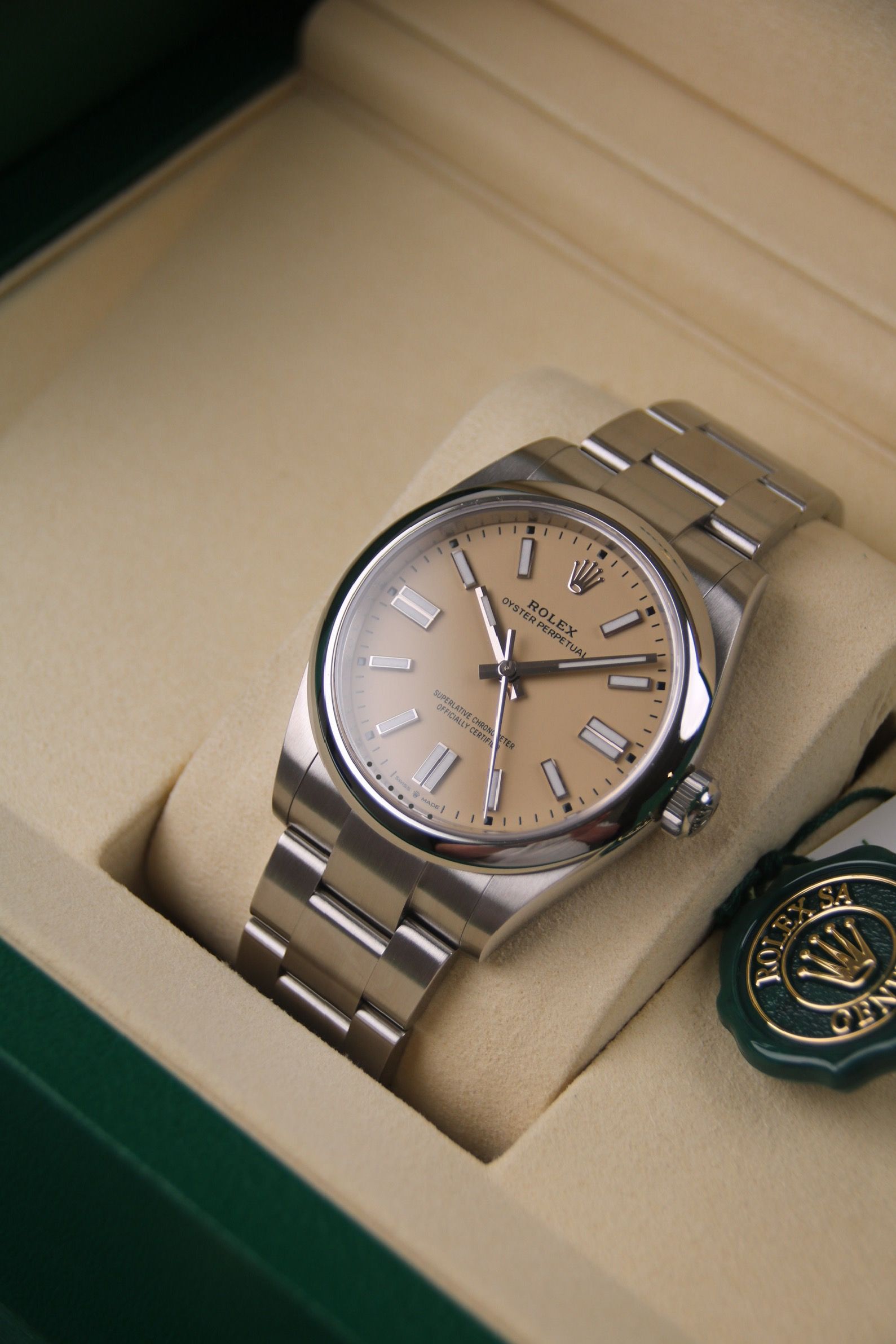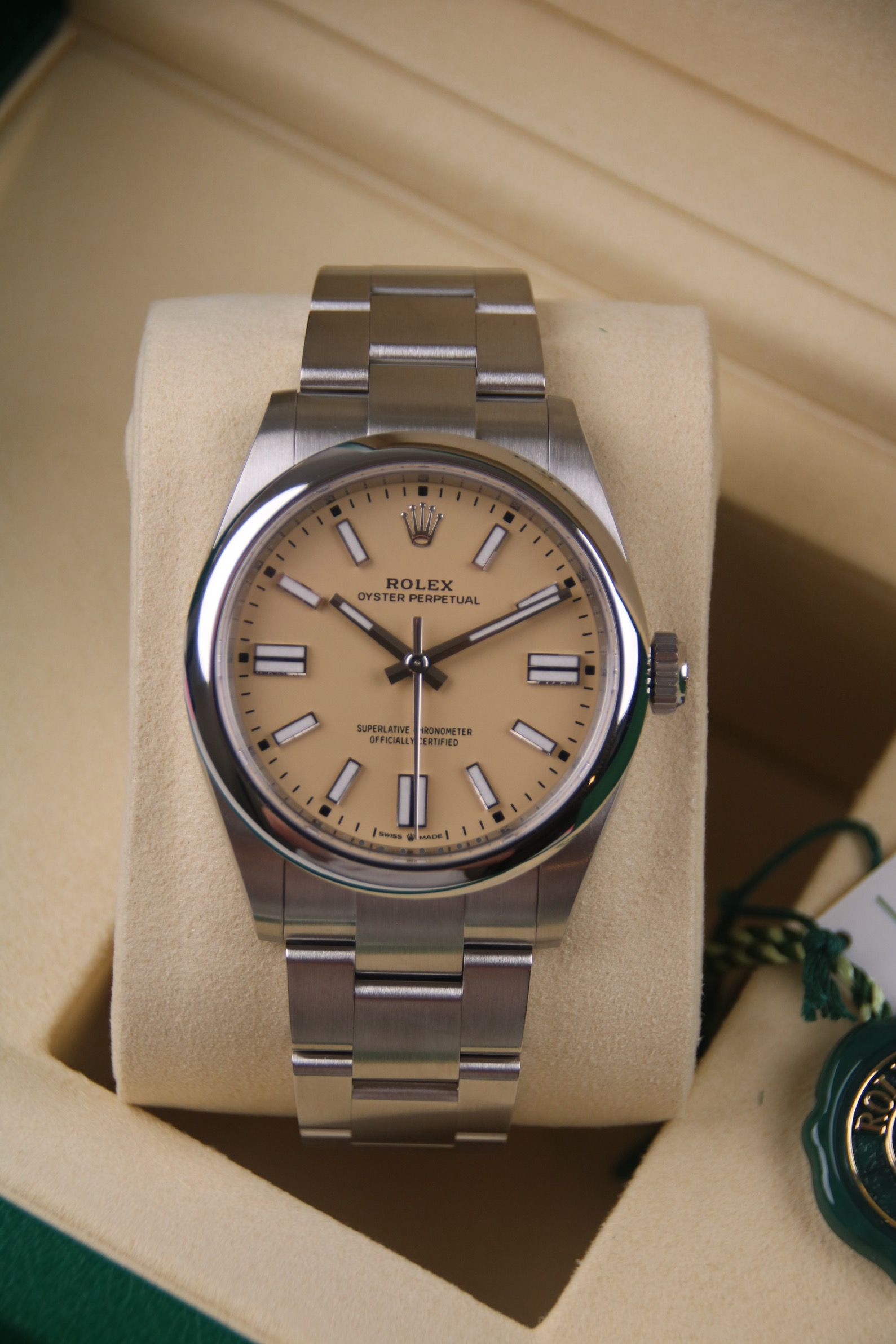 Zum Verkauf steht eine brandneue und neu veröffentlichte Rolex Oyster Perpetual 41 mit 'beige' Zifferblatt. Die Uhr kommt als komplettes Set inklusive Lünette-Schutz, Box, Papiere usw. Gekauft bei einem autorisierten Rolex-Händler im September 2025, weltweite Rolex-Garantie bis 2030.