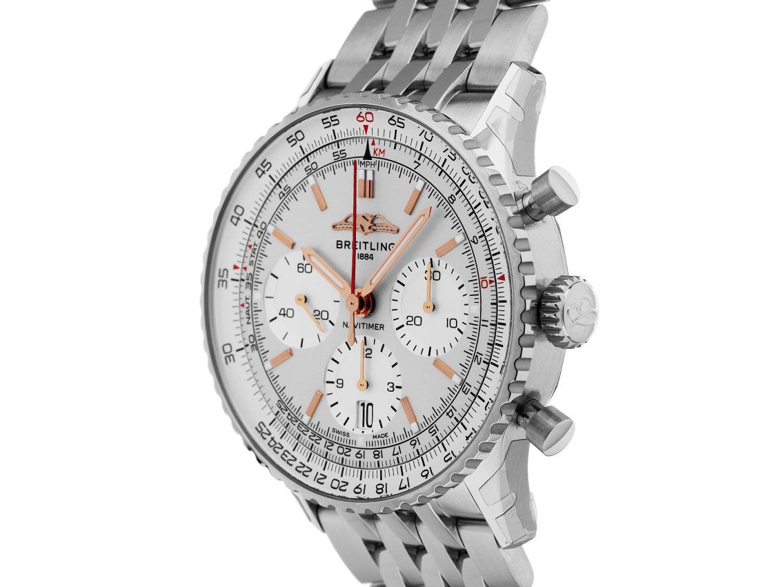 Gehäuse aus poliertem Edelstahl, Gehäusedurchmesser ohne Krone 41mm, Gehäusehöhe 13,6mm. Lünette aus Edelstahl, geriffelt, beidseitig drehbar mit Unterglas-Rechenschieber. Armband aus poliertem und satiniertem Edelstahl, verdeckte Doppelsicherheitsfaltschließe aus Edelstahl mit Hersteller-Logo. Zifferblatt in Silber mit aufgesetzten roségoldenen Leuchtindexen und Leuchtpunkten sowie roségoldenen Leuchtzeigern. Uhrwerk Automatik, Chronograph, Chronometer mit Zeugnis, Breitling Manufakturkaliber 01 mit 47 Edelsteinen, Gangreserve ca. 70 Stunden. Anzeige von Stunde und Minute über Zeiger aus der Mitte, kleine Sekunde mit Sekundenstopp zur sekundengenauen Einstellung der Uhrzeit bei 9 Uhr, Datumsanzeige mit Schnellverstellung bei 6 Uhr. Saphirglas kratzfest, doppelseitig entspiegelt und bombiert. Krone mit Hersteller-Logo. Boden aus Edelstahl, verschraubt und graviert mit Saphirglas-Sichtfenster. Gewicht der Uhr inklusive Armband 150g, Länge des Armbandes inklusive Gehäuse 215mm. Wasserdicht bis 3 ATM. Referenznummer: AB0139211G1A1, ID: ST5806133200925H-9850, Artikelnummer: 10000082459. Original Breitling Box und Garantie-Papiere von 2025 sowie Beschreibung, Full Set. Ungetragen. Lieferzeit sofort.