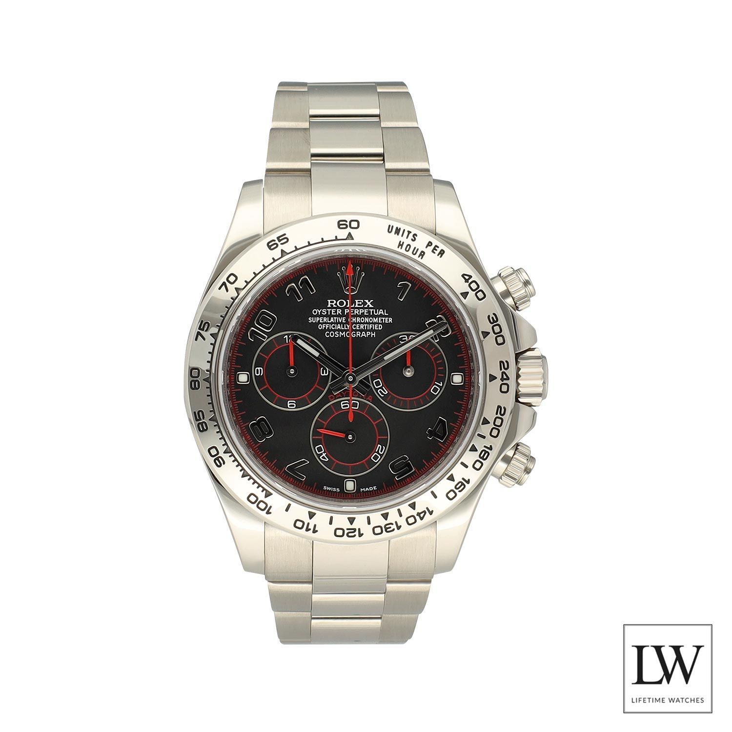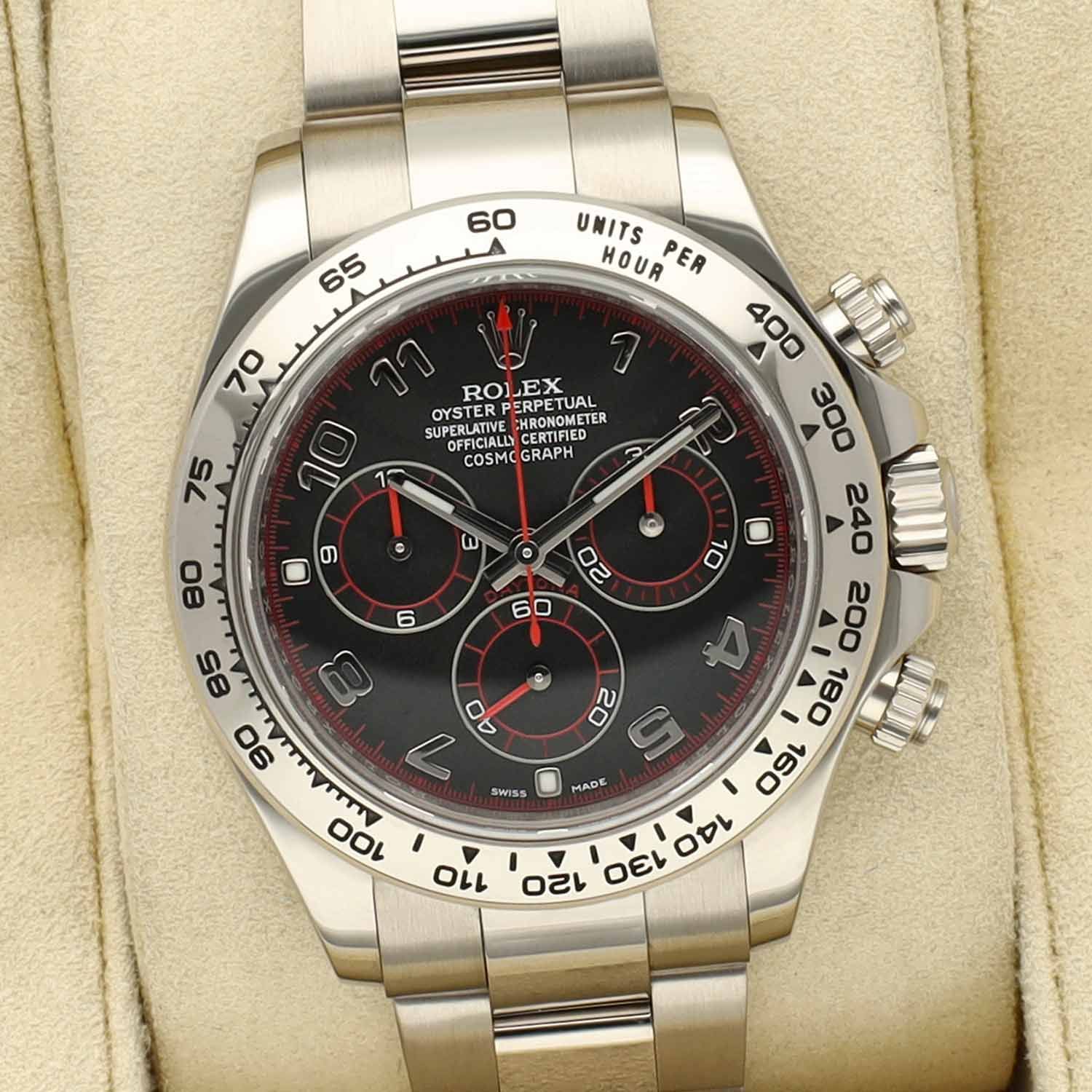 The Rolex Cosmograph Daytona with reference 116509 from 2016 comes as a set, including the original box, papers, booklets and hang tag. This luxurious and sporty chronograph is crafted entirely from 18-carat white gold, offering exceptional weight, presence, and refinement on the wrist.This particular model features the highly sought-after Grey Racing dial with contrasting subdials, combining excellent legibility with a bold, distinctive aesthetic. The 40 mm case is fitted with a white gold tachymeter bezel, completing the iconic Daytona look.