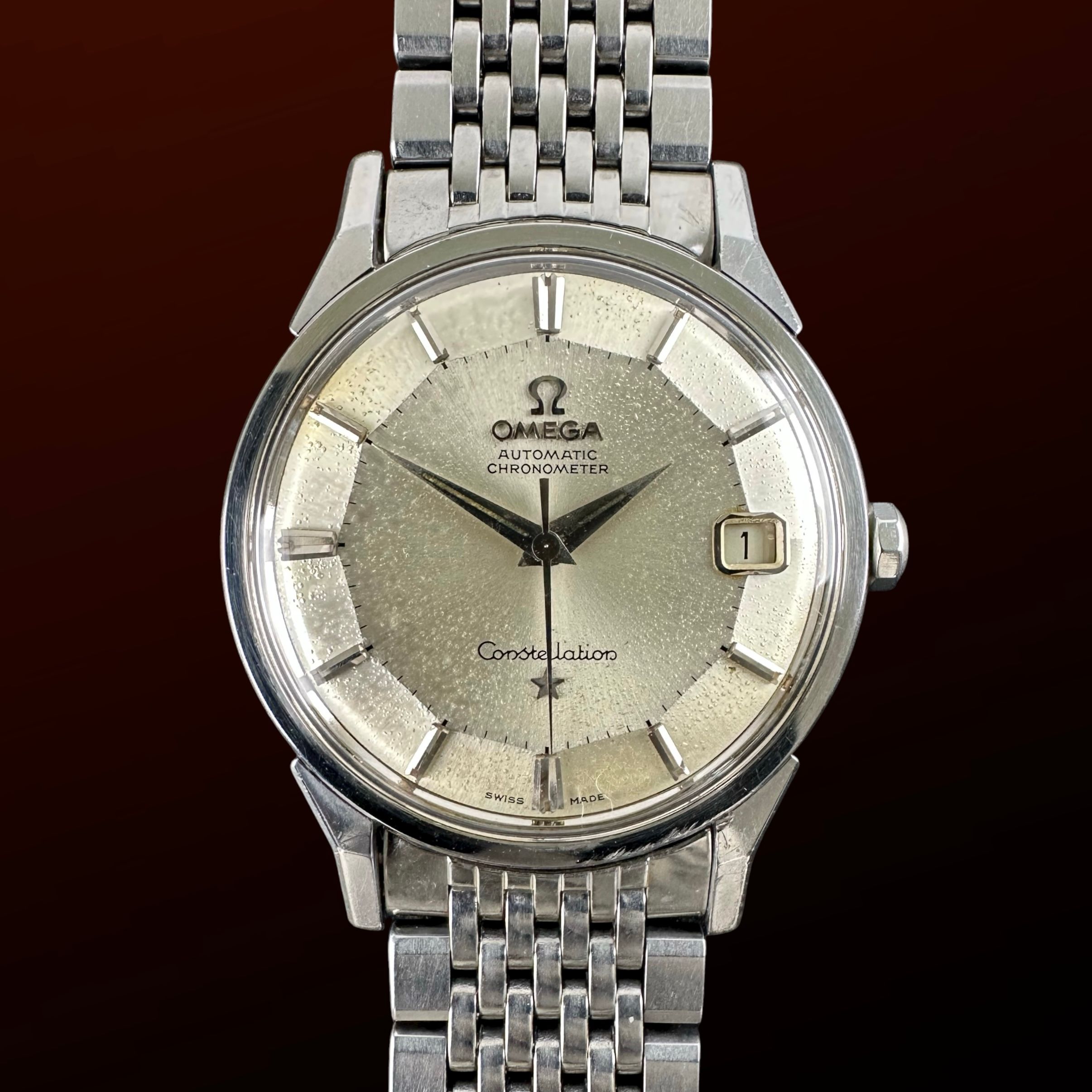 Diese Vintage Omega Constellation Chronometer aus dem Jahr 1962 verfügt über eine klassische Pie-Pan-Wijzerplaat und elegante Dog-Leg-Anstöße, Eigenschaften, die von Sammlern sehr geschätzt werden. Ein besonderes Detail: Sie ist an ihrem originalen Omega "Beads of Rice"-Armband montiert, was das Gesamtpaket seltener und begehrenswerter macht.