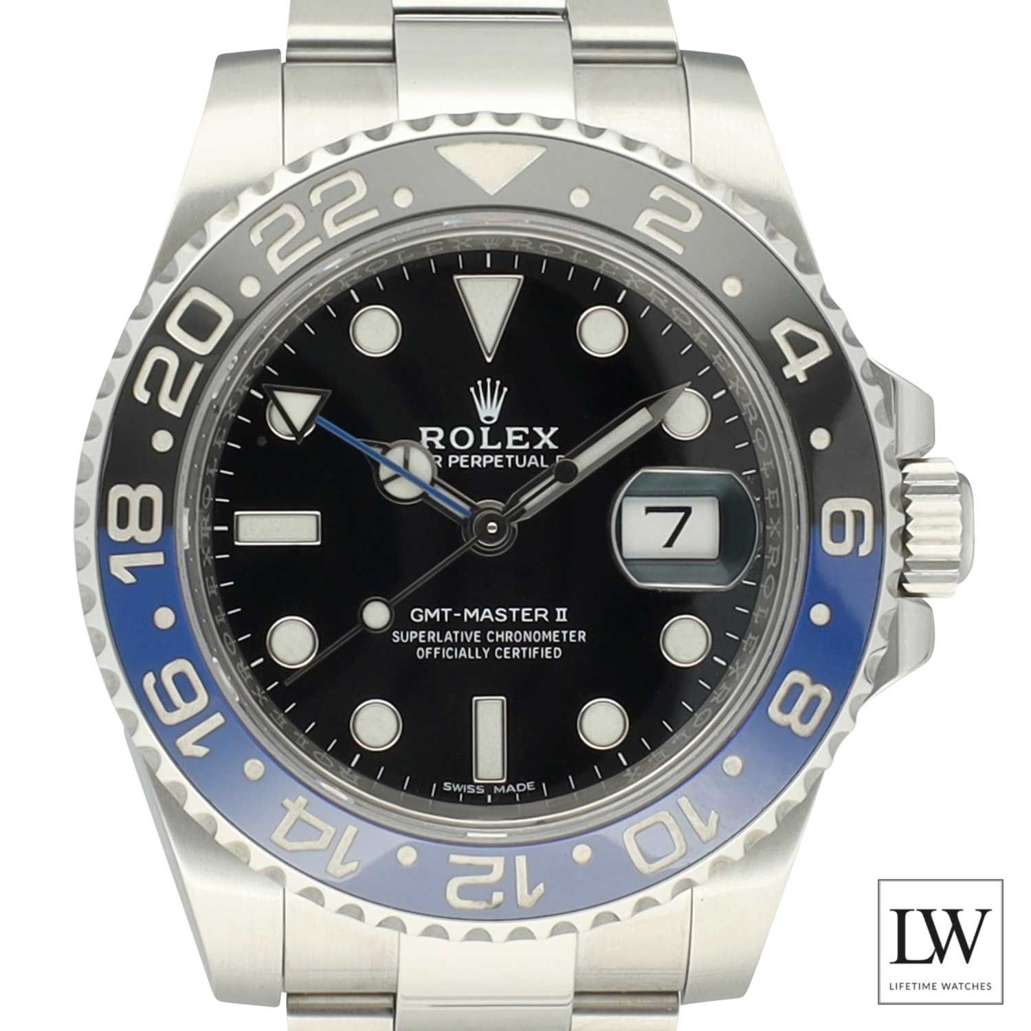 The Rolex GMT-Master II with reference 116710BLNR from 2018 comes as a full set without papers, including the original Rolex box, booklets, and hang tag. This highly sought-after model, known as the “Batman”, features a black dial paired with a distinctive black and blue Cerachrom bezel insert in ceramic. The 40 mm case is crafted from corrosion-resistant Oystersteel and is fitted with the classic Oyster bracelet.Originally designed for professional pilots, the GMT-Master II allows tracking of a second time zone via the independent 24-hour hand and bidirectional rotatable bezel. It is powered by the automatic Rolex Caliber 3186, offering a 48-hour power reserve, quickset date, and exceptional accuracy.