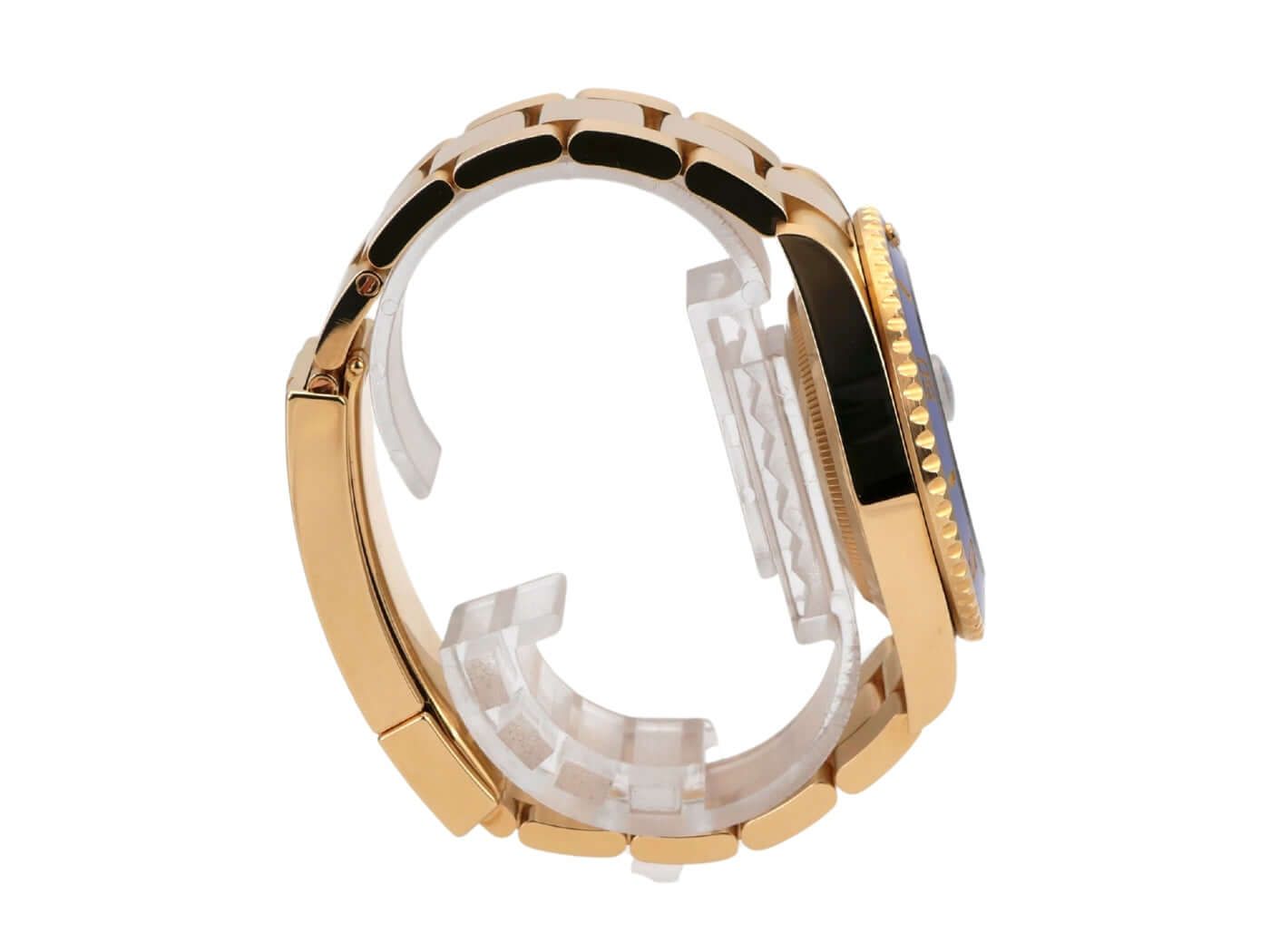 Gehäuse aus 18 Karat Gelbgold, poliert und satiniert, Gehäusedurchmesser 41 mm, Gehäusehöhe 12,5 mm, 18 Karat Gelbgold-Lünette mit blauer Keramikeinlage, 60-Minuten-Skala und leuchtendem Punkt drehbar, Oyster-Armband aus 18 Karat Gelbgold, poliert und satiniert mit Sicherheits-Faltschließe, blaue Zifferblatt mit aufgebrachten leuchtenden Indizes und leuchtenden Punkten, leuchtende Zeiger, automatisches Uhrwerk, Kaliber Rolex 3235 mit 31 Edelsteinen, 28.800 A/h, 70 Stunden Gangreserve, Datumsanzeige mit Schnellverstellung und Lupe, Chronometer, Saphirglas, verschraubte Krone mit Kronenschutz, verschraubter Gehäuseboden aus 18 Karat Gelbgold, wasserdicht bis 30 bar.