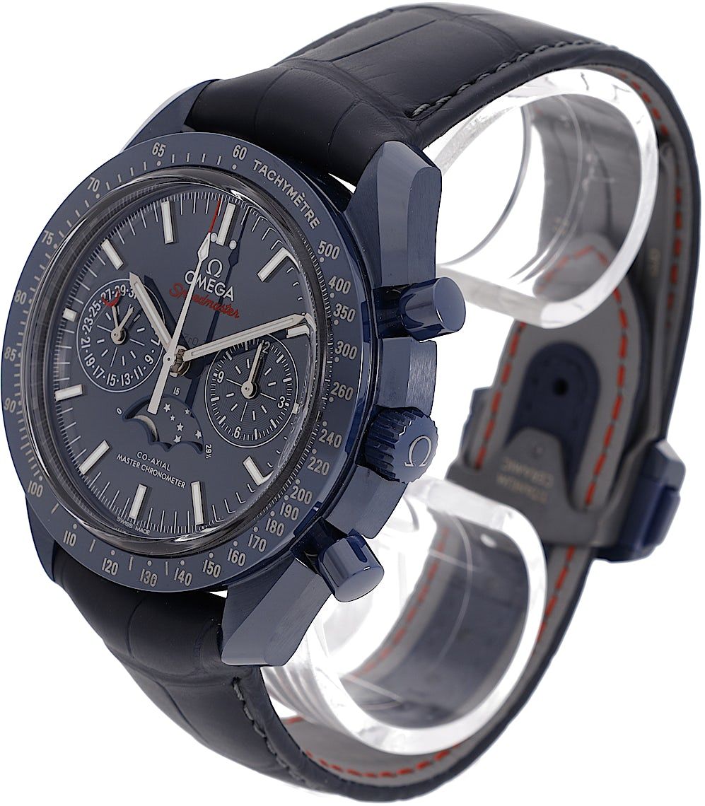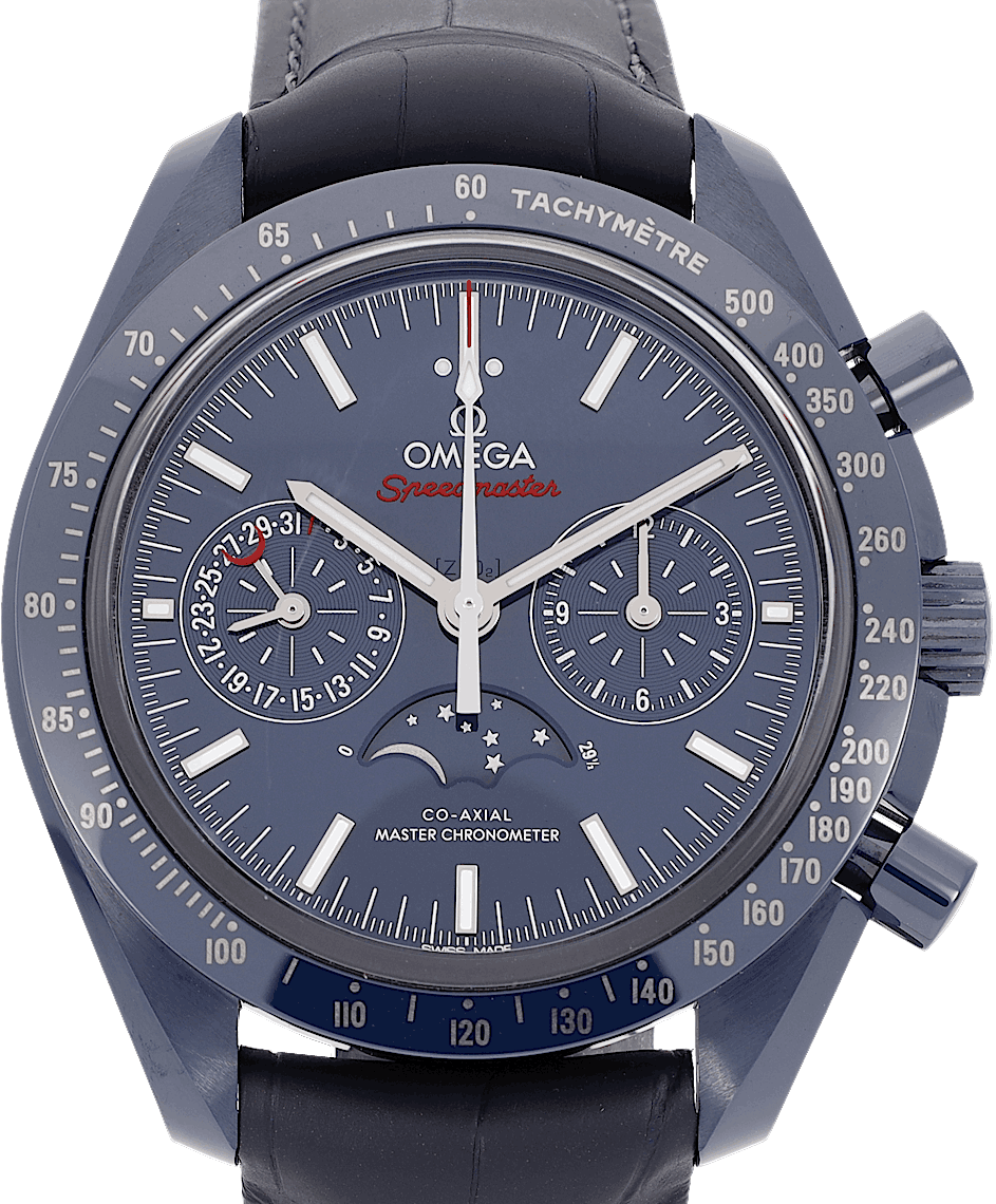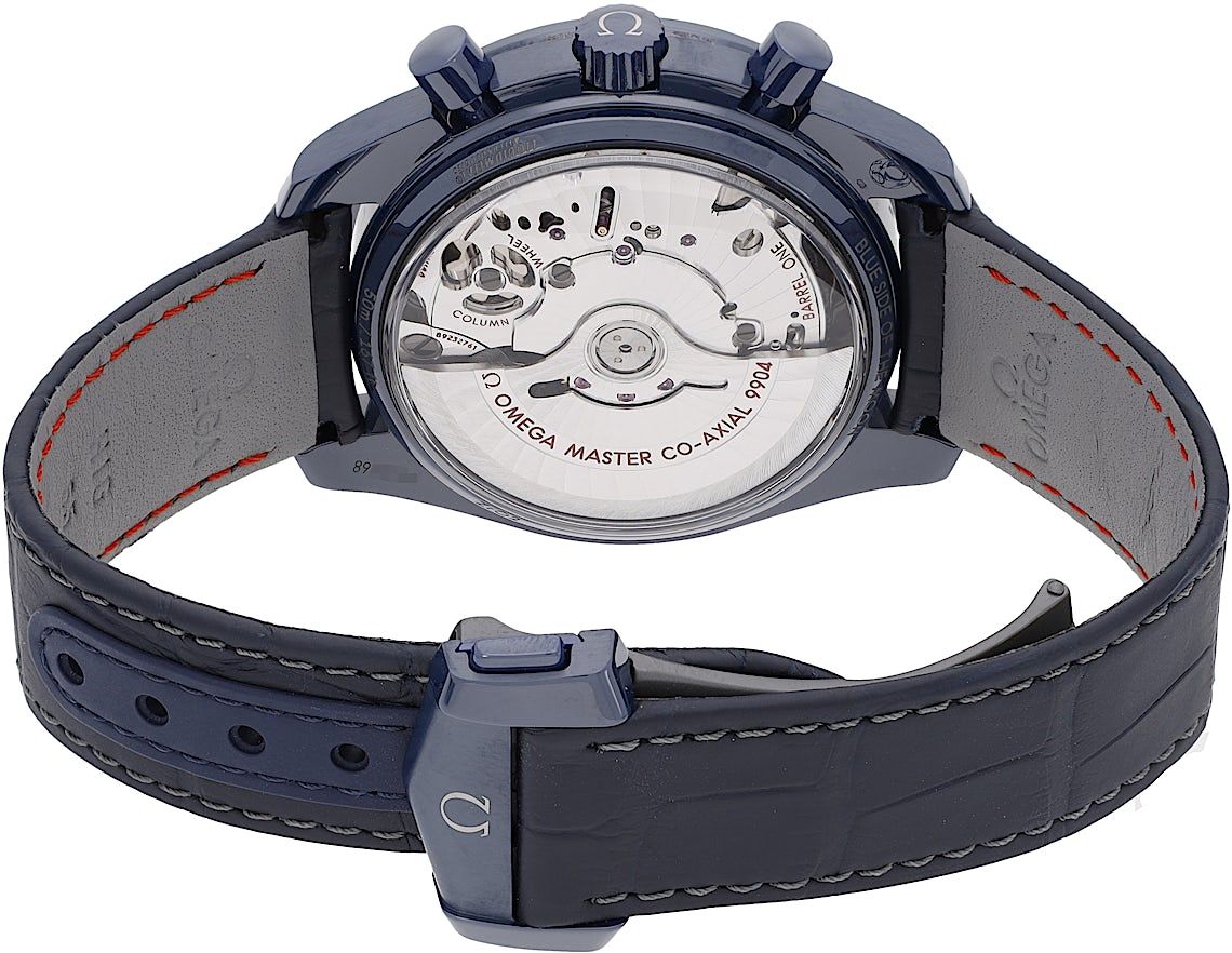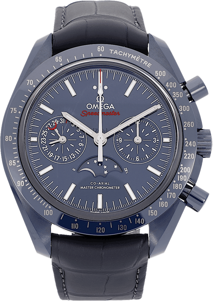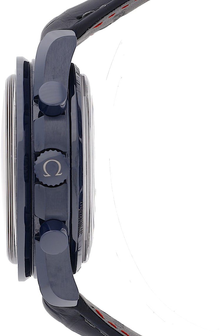 Omega Speedmaster Moonwatch - "Blue Side of the Moon", Reference: 304.93.44.52.03.001, Gender: Male, Size: 44.25mm, Dial color: Blue, Strap material: Alligator Leather, Movement: Automatic, Year: 2022, Condition: Previously worn with some signs usage. The movement is flawless and case has been cleaned. watch tested to ensure full functionality. An inspection by our certified watchmakers guarantees its authenticity., Documents: Original papers, CHRONEXT Certificate