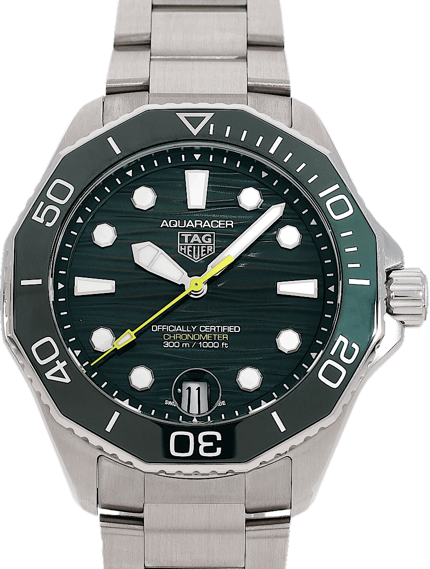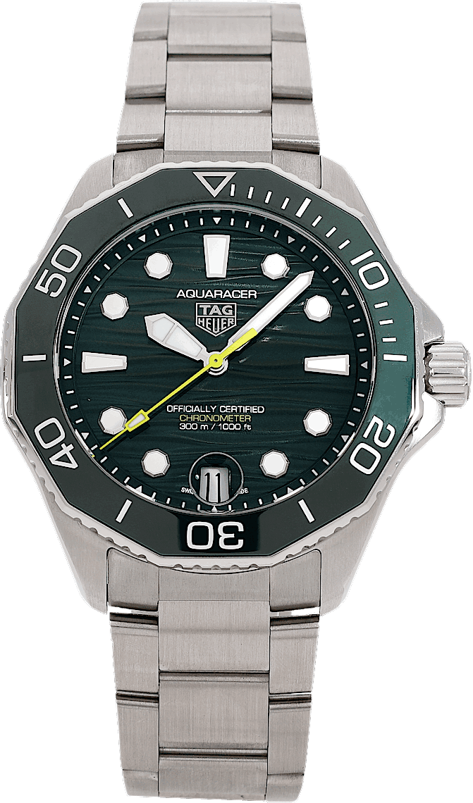 TAG Heuer Aquaracer, Reference: WBP5116.BA0013, Gender: Male, Size: 42mm, Dial color: Green, Strap material: Stainless Steel, Movement: Automatic, Year: 2025, Condition: Previously worn, minor to no signs of usage. The movement is flawless and the case has been cleaned. watch tested ensure full functionality. An inspection by our certified watchmakers guarantees its authenticity., Documents: Original papers, CHRONEXT Certificate
