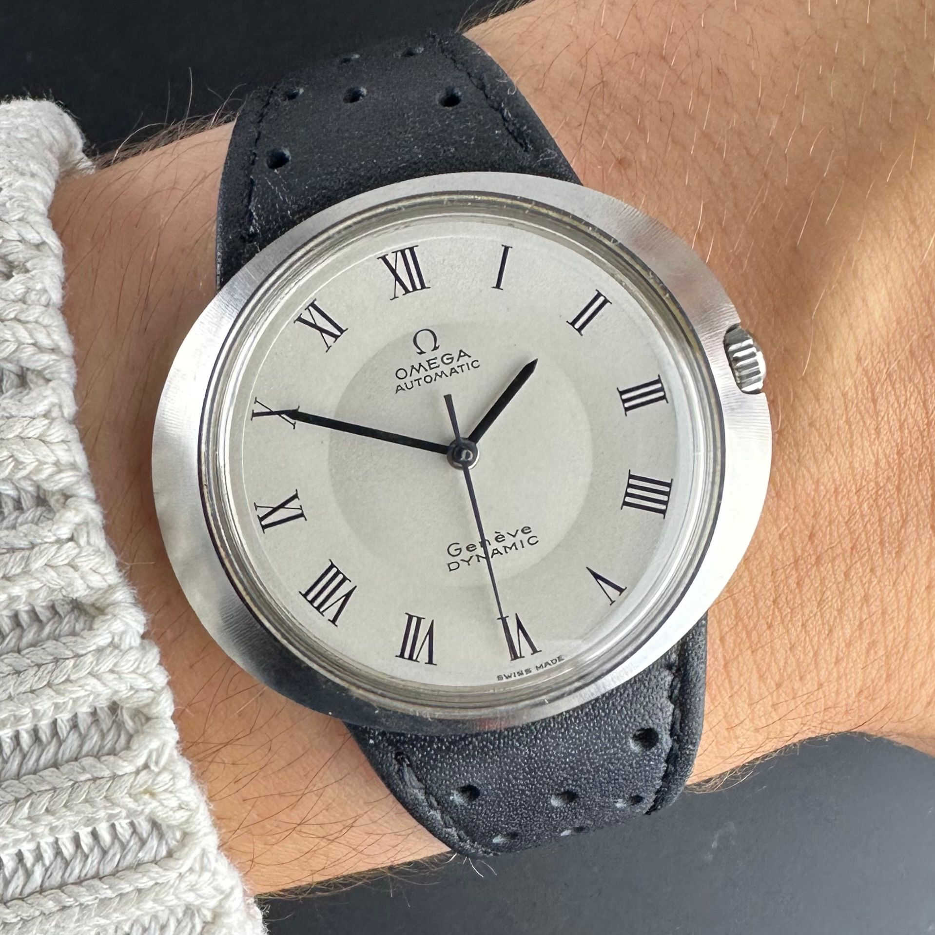 This vintage Omega Genève Dynamic, produced in 1972, features a white dial with Roman numerals and black accents. It houses a caliber 552 automatic movement, serviced in October 2025 and currently running great. The watch is paired with a brand-new calf leather strap made specifically for the Dynamic model. Overall condition is great, with traces of the original polish still visible, especially on the case back. This piece is ideal as a daily wearer.Year of production: 1972