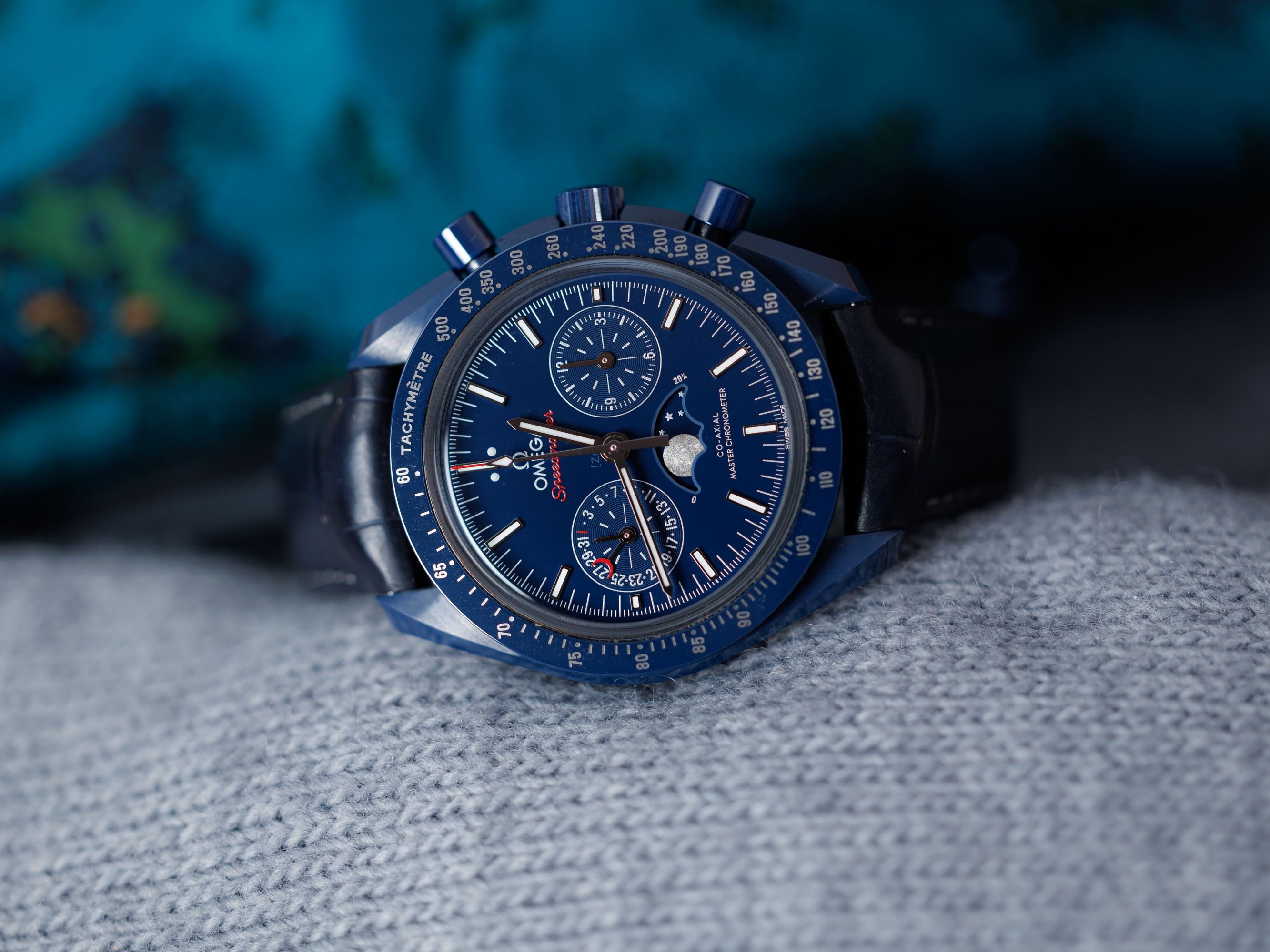 A truly exceptional version of the legendary Omega Speedmaster “Moonwatch” – the watch that made history by going to the Moon.This model is a masterpiece of modern watchmaking, featuring a full blue ceramic case, a mesmerizing moonphase complication, and a deep blue dial that changes its tone beautifully depending on the light.