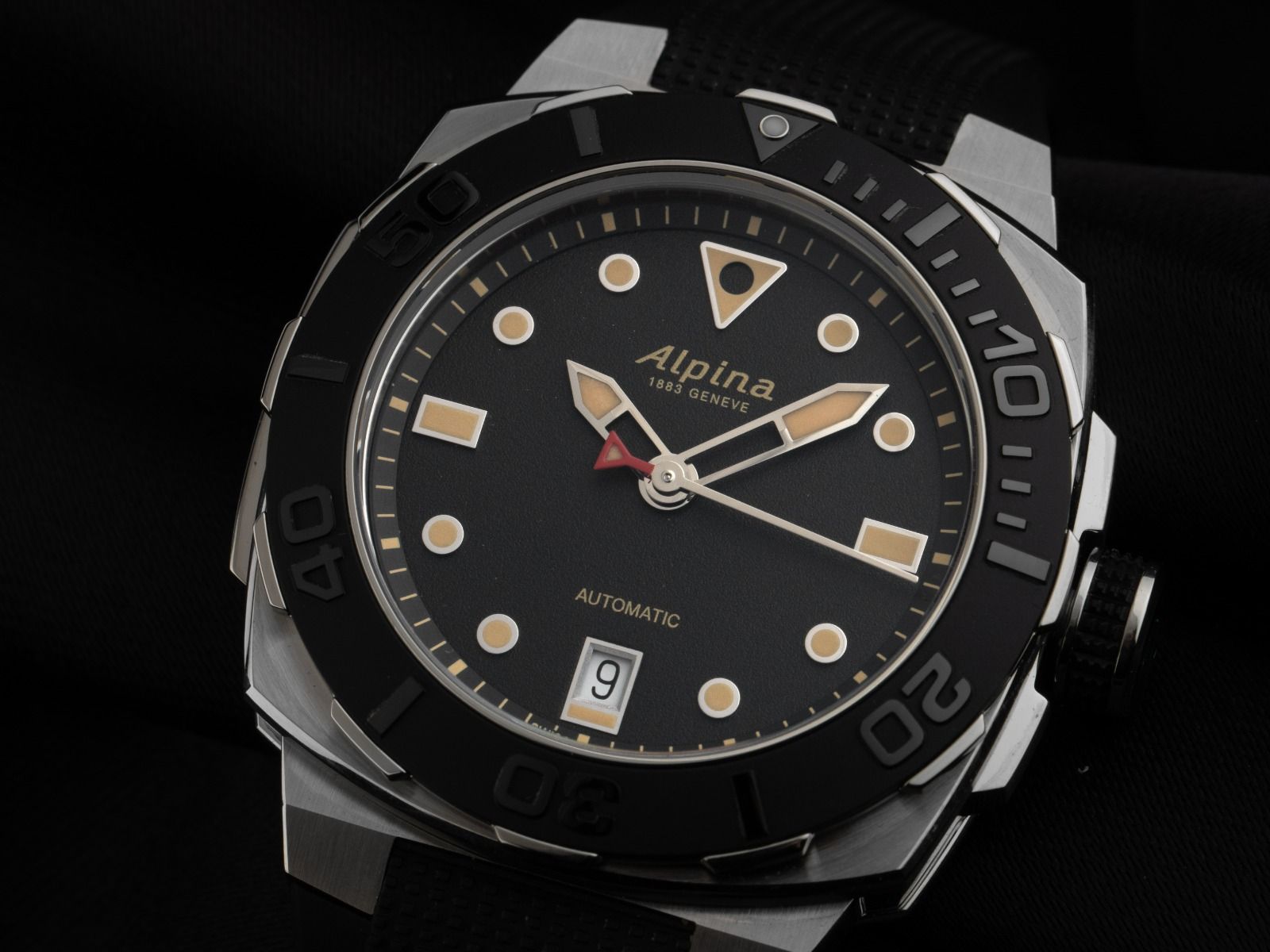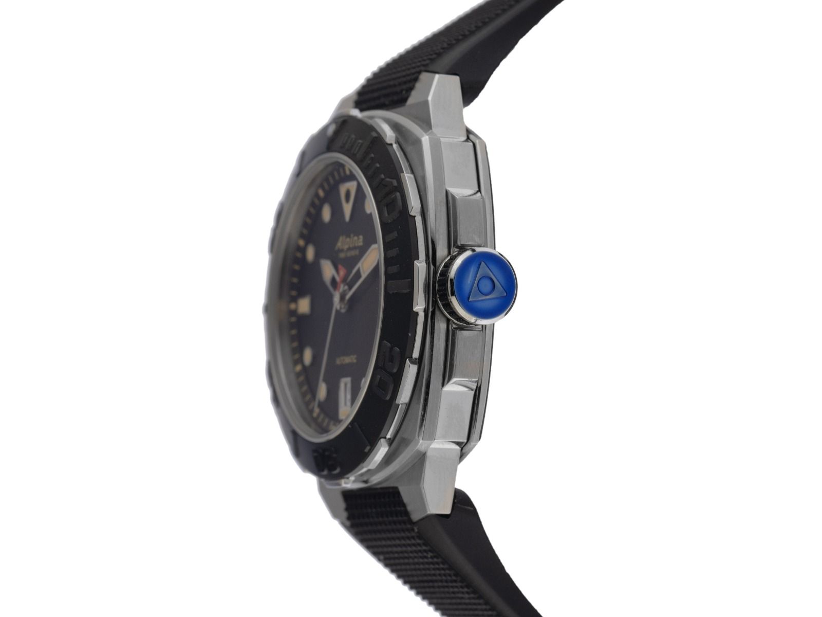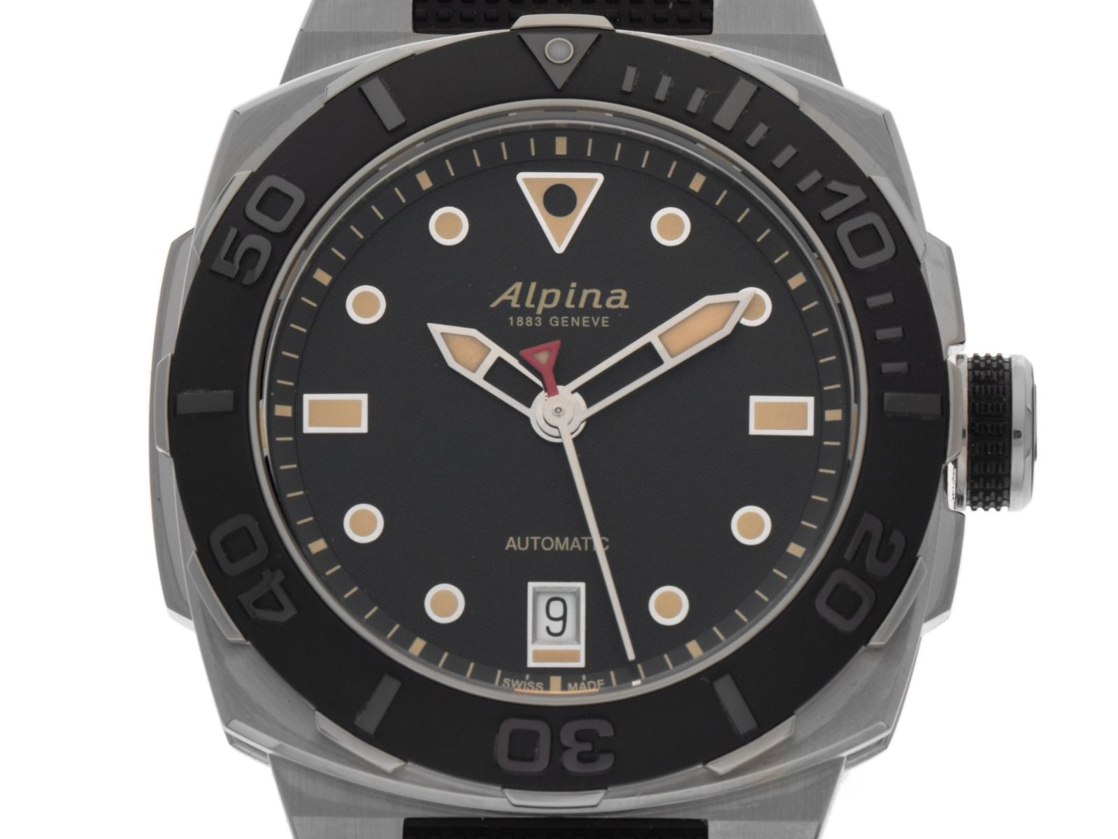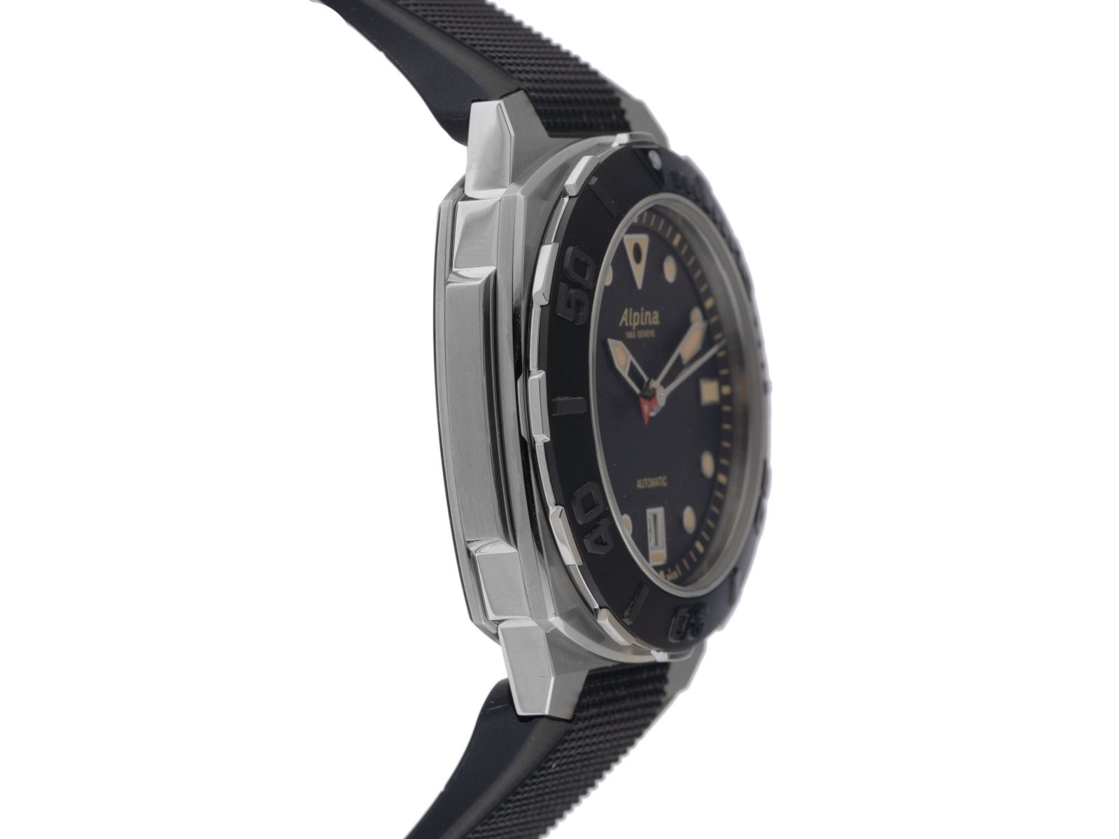 Gehäuse Edelstahl poliert und satiniert, Gehäusemaße ohne Krone (L x B x H) 40,5 x 39 x 12,8mm. Lünette Edelstahl mit schwarzem Inlay und 60-Minuten Skala, einseitig drehbar. Armband Kautschuk schwarz, Anstoßbreite 25mm, Sicherheitsfaltschließe Edelstahl mit Hersteller-Logo. Zifferblatt schwarz matt mit aufgesetzten Edelstahl Leuchtindexen und Edelstahl Leuchtzeigern. Uhrwerk Automatik, Kaliber Alpina AL 525 mit 26 Edelsteinen, Gangreserve ca. 38 Stunden. Anzeige von Stunde, Minute und Sekunde über Zeiger aus der Mitte mit Sekundenstopp zur sekundengenauen Einstellung der Uhrzeit, Datumsanzeige mit Schnellverstellung bei 6 Uhr. Saphirglas kratzfest. Krone verschraubbar mit Hersteller-Logo. Boden Edelstahl 6-fach verschraubt und graviert. Gewicht der Uhr inklusive Armband 119g. Wasserdicht bis 30 ATM. Referenznummer: AL-525B3VE6, ID: ST254639921025H-1995, Artikelnummer: 10000082729. Original Alpina Box mit Umkarton und Garantie Papiere von 2025 sowie Beschreibung, Full Set. Neu. Lieferzeit sofort.