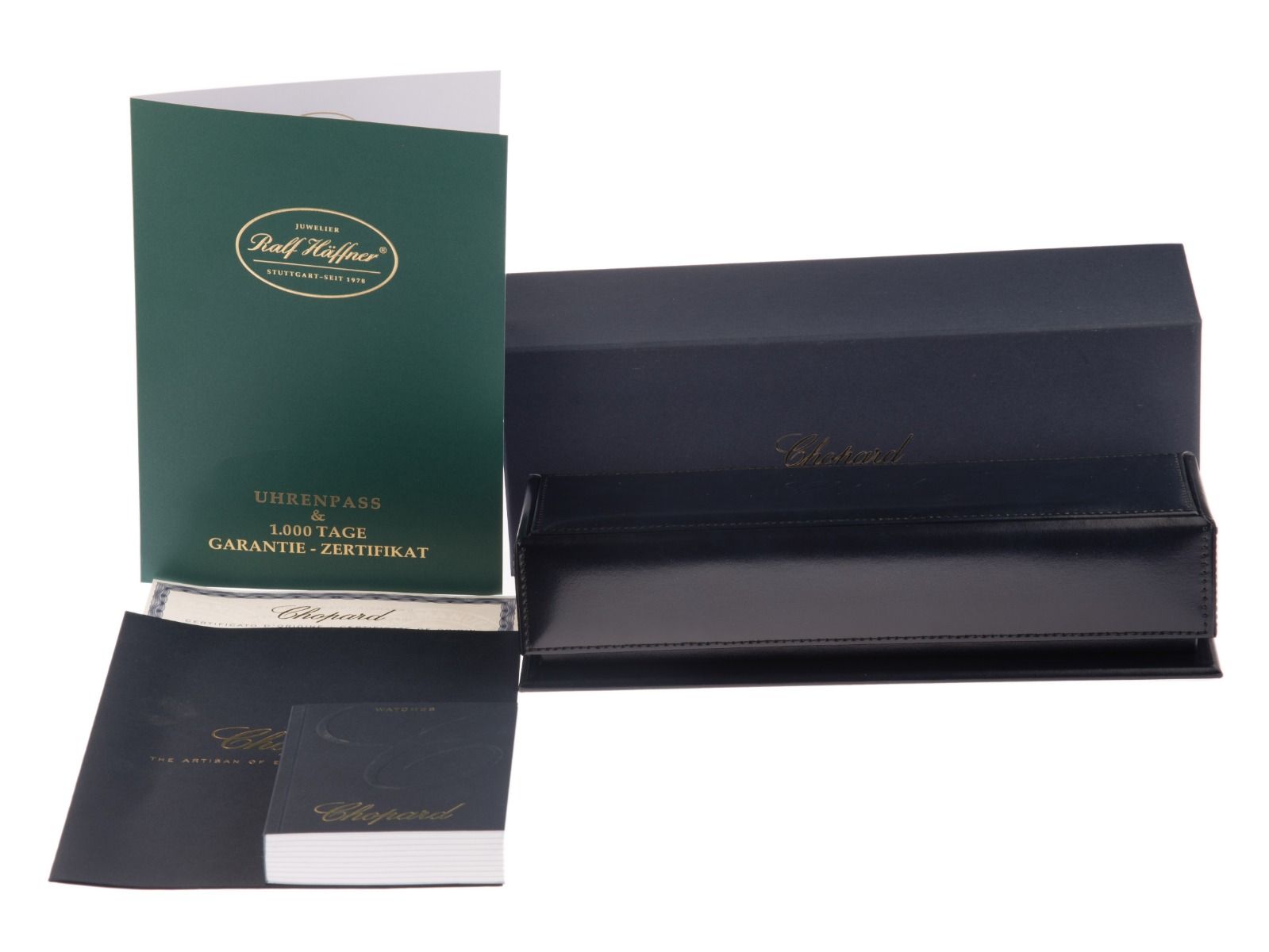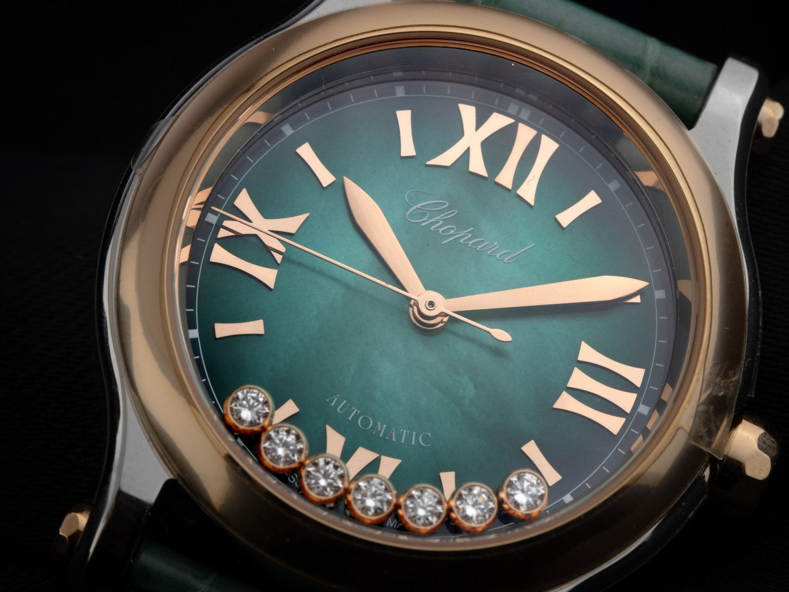 Edelstahl poliert, Gehäusedurchmesser ohne Krone 36mm, Gehäusehöhe 12,5mm. Lünette 18kt Roségold glatt und poliert. Armband Krokoleder grün mit Ziernaht, Anstoßbreite 18mm, Chopard Stiftschließe Edelstahl mit Hersteller-Logo. Zifferblatt Perlmutt grün mit 7 beweglichen Brillanten 0,35ct, aufgesetzten roségoldenen römischen Ziffern und Indexen sowie roségoldenen Zeigern. Uhrwerk Automatik, Kaliber SW300 mit 25 Edelsteinen, Gangreserve ca. 42 Stunden. Anzeige von Stunde, Minute und Sekunde über Zeiger aus der Mitte mit Sekundenstopp zur sekundengenauen Einstellung der Uhrzeit. Saphirglas kratzfest. Krone mit Tsavorit Cabochon, 0,17ct. Boden Edelstahl 6-fach verschraubt und graviert mit Saphirglas Sichtfenster. Wasserdicht bis 3 ATM. Gewicht der Uhr inklusive Armband 64g. Referenznummer: 278578-6002, ID: ST1160174581025H-13100, Artikelnummer: 10000082739. Original Chopard Box mit Umkarton und Garantie Papiere von Oktober 2025 sowie Beschreibung, Full Set. Ungetragen. Lieferzeit sofort.