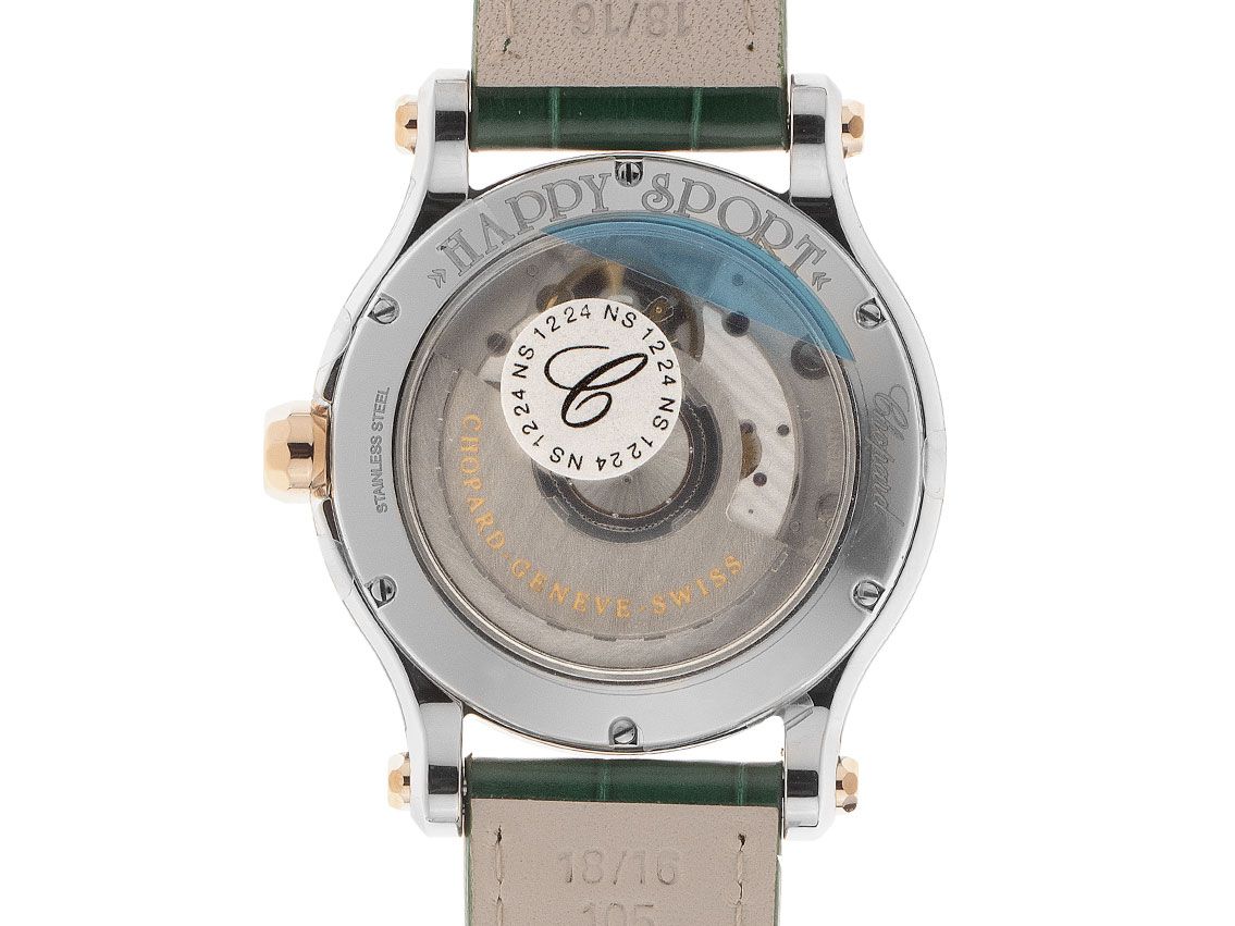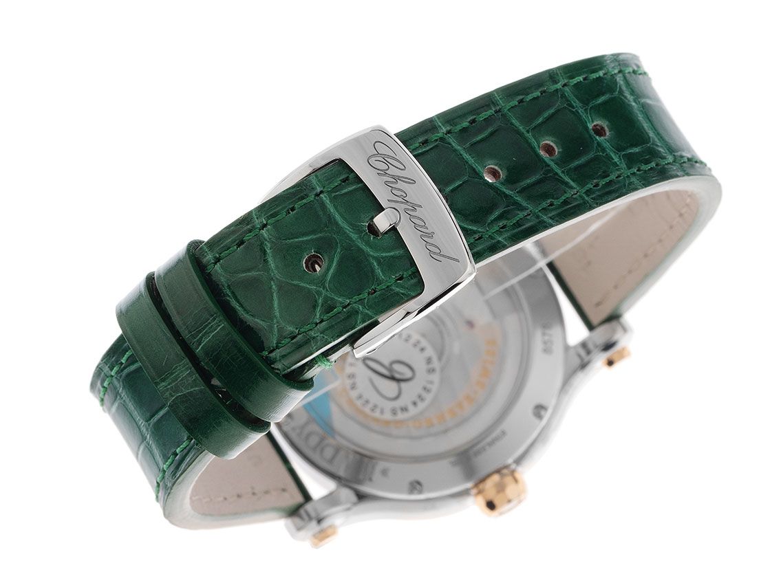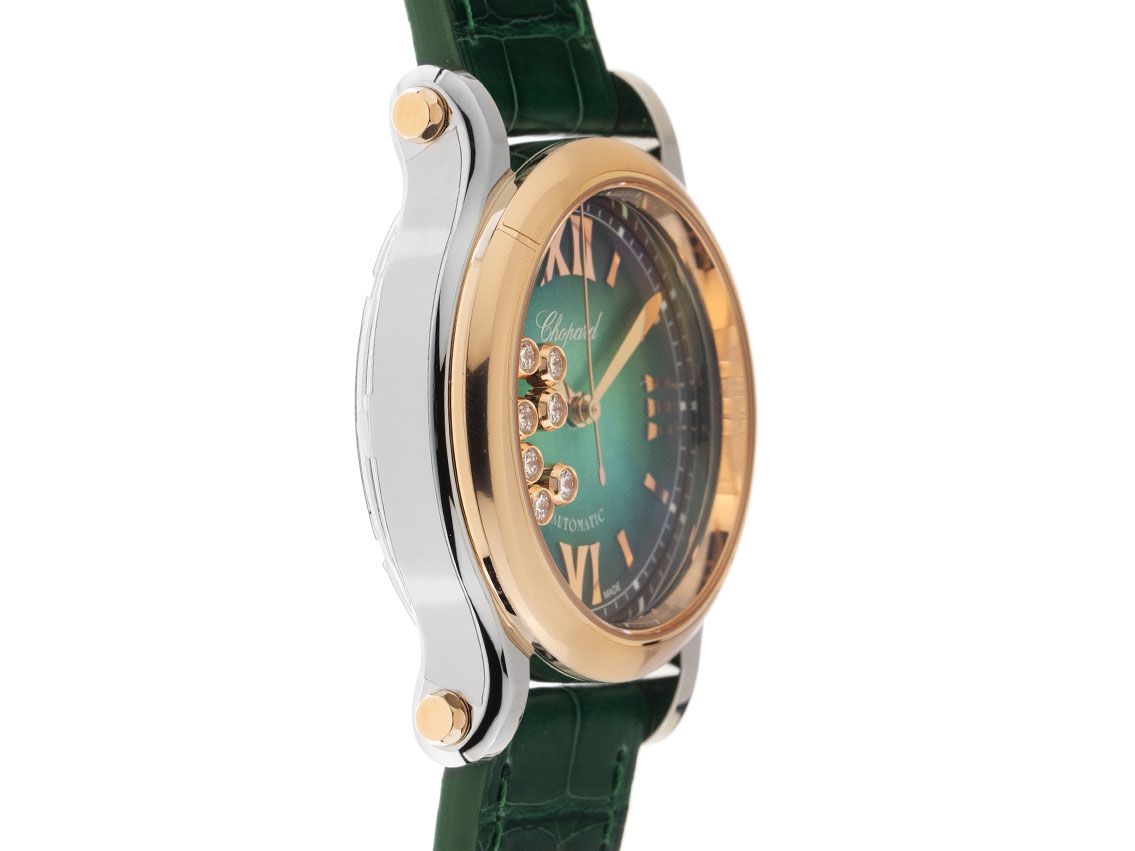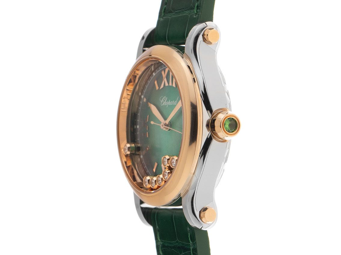 Chopard Happy Sport Stahl / 18kt Roségold Diamanten Perlmutt Automatik Armband KrokolederEdelstahl poliert, Gehäusedurchmesser ohne Krone 36mm, Gehäusehöhe 12,5mm. Lünette 18kt Roségold glatt und poliert. Armband Krokoleder grün mit Ziernaht, Anstoßbreite 18mm, Chopard Stiftschließe Edelstahl mit Hersteller-Logo. Zifferblatt Perlmutt grün mit 7 beweglichen Brillanten 0,35ct, aufgesetzten roségoldenen römischen Ziffern und Indexen sowie roségoldenen Zeigern. Uhrwerk Automatik, Kaliber SW300 mit 25 Edelsteinen, Gangreserve ca. 42 Stunden. Anzeige von Stunde, Minute und Sekunde über Zeiger aus der Mitte mit Sekundenstopp zur sekundengenauen Einstellung der Uhrzeit. Saphirglas kratzfest. Krone mit Tsavorit Cabochon, 0,17ct. Boden Edelstahl 6-fach verschraubt und graviert mit Saphirglas Sichtfenster. Wasserdicht bis 3 ATM. Gewicht der Uhr inklusive Armband 64g. Referenznummer: 278578-6002, ID: ST1160174581025H-13100, Artikelnummer: 10000082739. Original Chopard Box mit Umkarton und Garantie Papiere von Oktober 2025 sowie Beschreibung, Full Set. Ungetragen. Lieferzeit sofort.