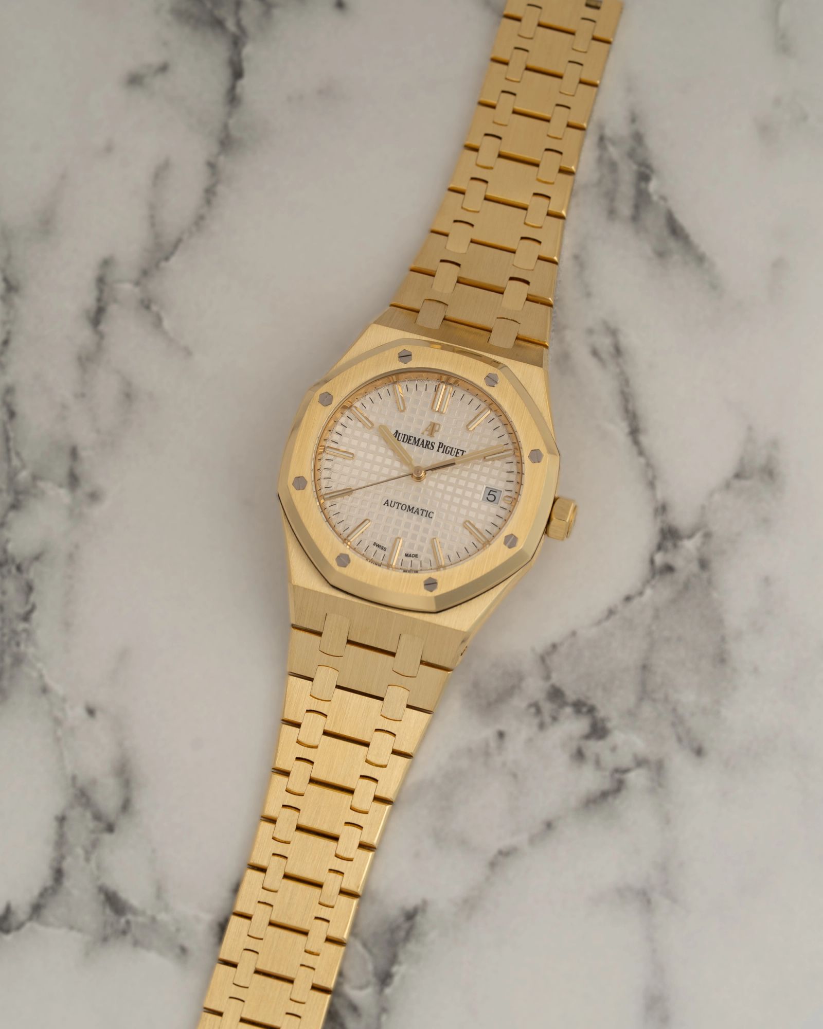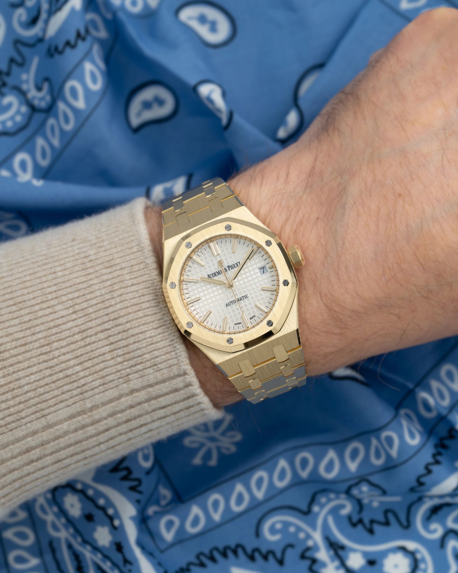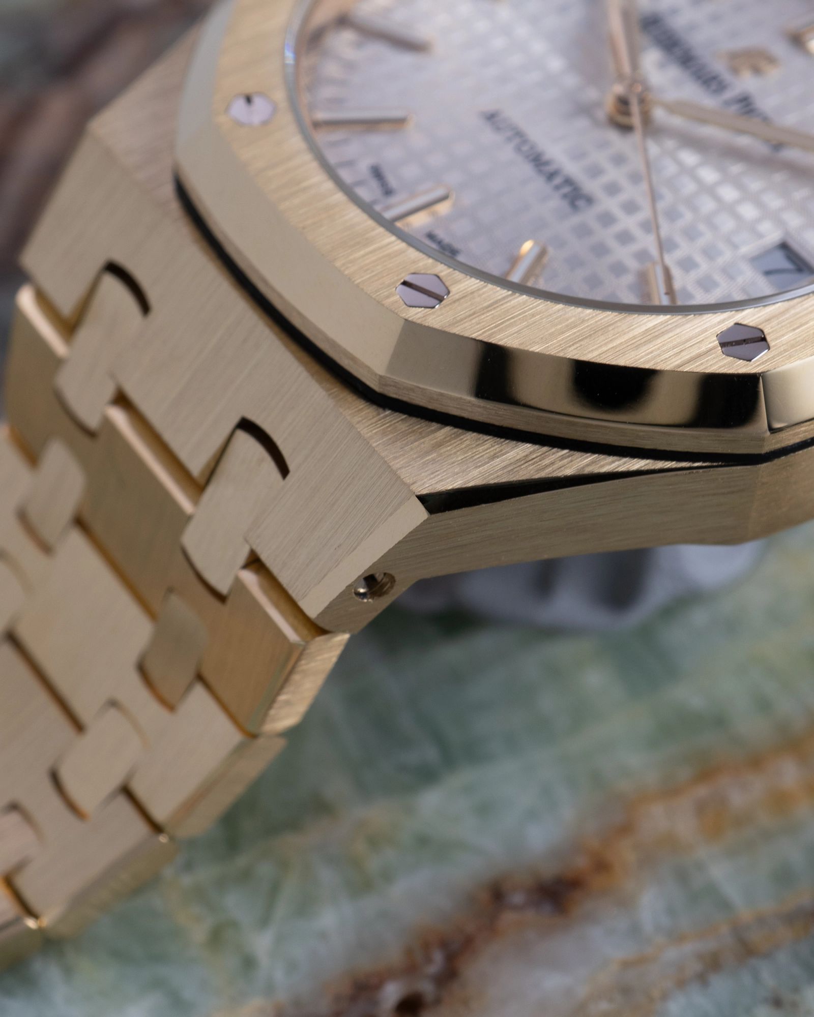 Das integrierte Armband besteht aus abwechselnd satinierter und polierter Glieder, die einen bequemen Sitz für Handgelenke bis zu etwa 17 cm gewährleisten (zusätzliche Armbandglieder können auf Anfrage bei Audemars Piguet bestellt werden).