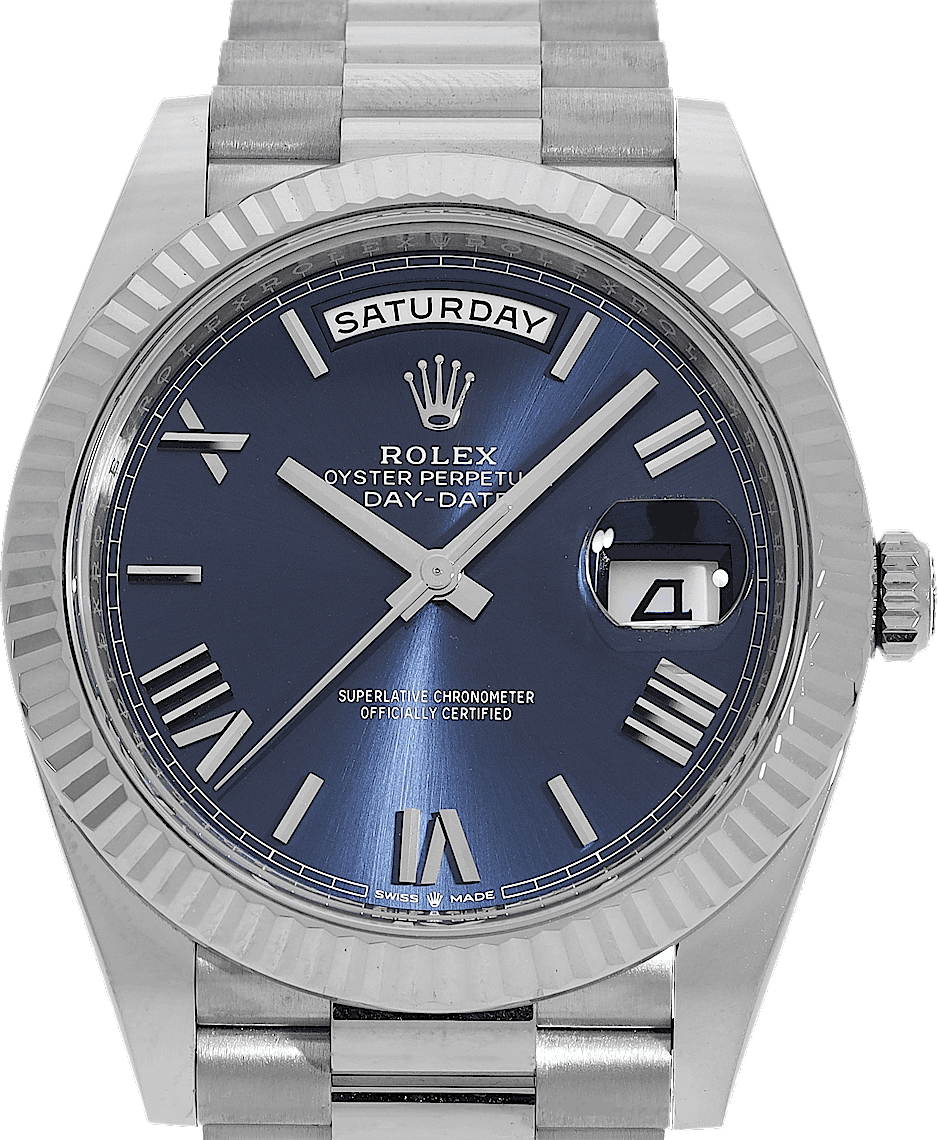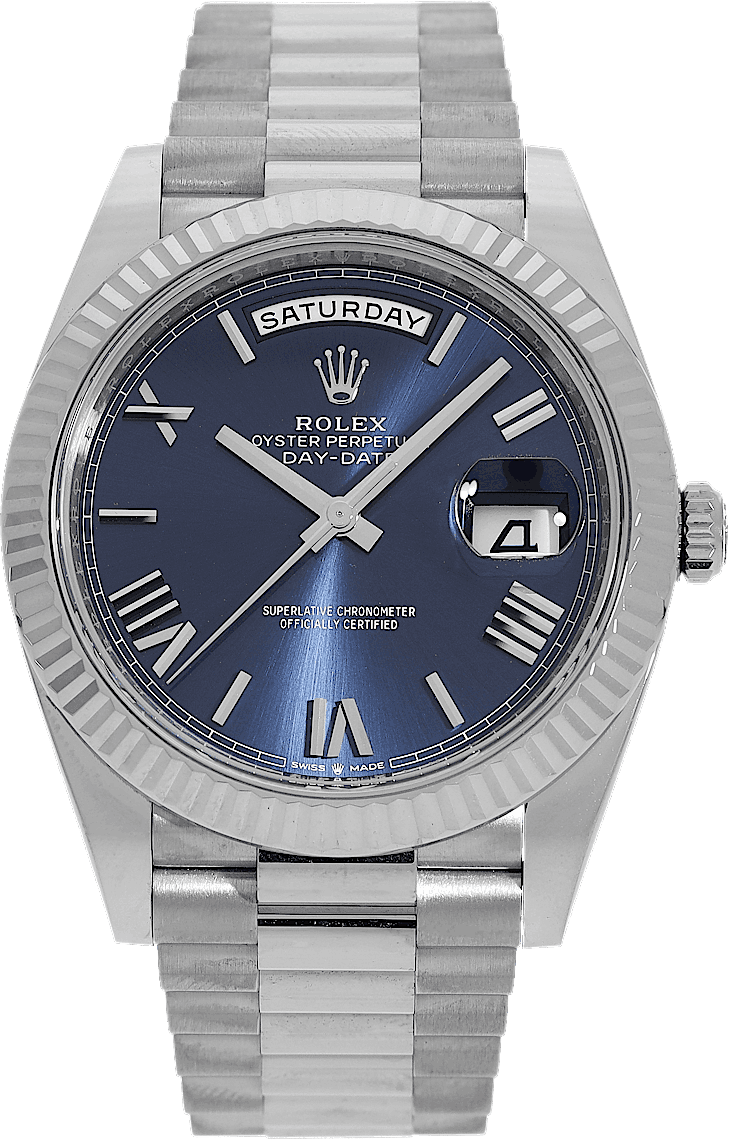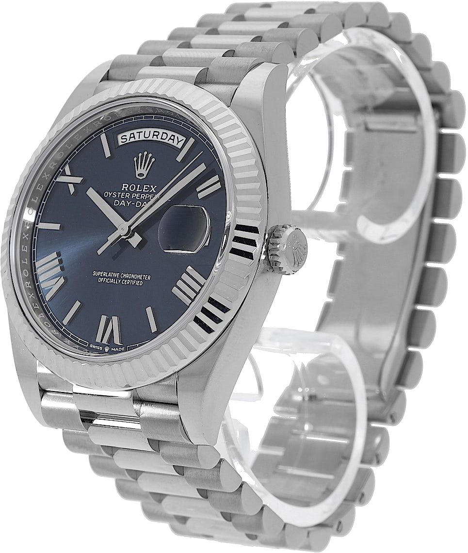 Rolex Day-Date, Reference: 228239, Gender: Male, Size: 40mm, Dial color: Blue, Strap material: White Gold, Movement: Automatic, Year: 2023, Condition: Previously worn, minor to no signs of usage. The movement is flawless and the case has been cleaned. watch tested ensure full functionality. An inspection by our certified watchmakers guarantees its authenticity., Documents: Original papers, CHRONEXT Certificate