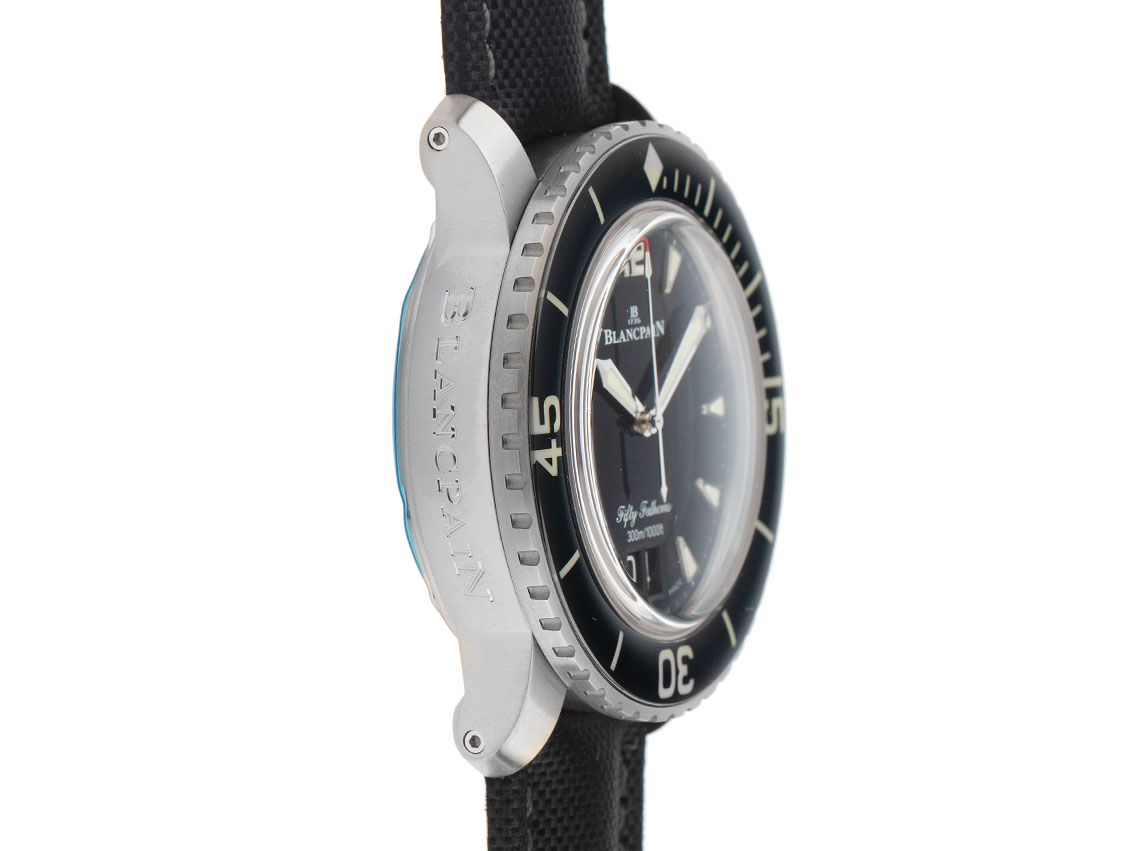 Gehäuse Titan satiniert mit Logo-Gravur auf der linken Gehäuseseite, Gehäusedurchmesser ohne Krone 45mm, Gehäusehöhe 16,2mm. Lünette Titan gerädelt mit schwarzem Keramik-Inlay, 60-Minuten-Skala und Leuchtpunkt, einseitig drehbar. Armband Segeltuch schwarz mit Ziernaht, Anstoßbreite 23mm, Stiftschließe Titan mit Hersteller-Logo. Zifferblatt schwarz mit aufgesetzten arabischen Leuchtziffern und Leuchtindexen sowie Edelstahl-Leuchtzeigern. Uhrwerk Automatik, Kaliber Blancpain 6918B mit 44 Edelsteinen, Gangreserve ca. 120 Stunden. Anzeige von Stunde, Minute und Sekunde über Zeiger aus der Mitte mit Sekundenstopp zur sekundengenauen Einstellung der Uhrzeit, Großdatumsanzeige mit Schnellverstellung bei 6 Uhr. Saphirglas kratzfest, gewölbt und doppelseitig entspiegelt. Krone verschraubbar mit Flankenschutz und Hersteller-Logo. Boden Titan verschraubt und graviert mit Saphirglas-Sichtfenster. Gewicht der Uhr inklusive Armband 111g. Wasserdicht bis 30 ATM. Referenznummer: 5050 12B30 B52A, ID: ST1160279681025H-20300, Artikelnummer: 10000082857. Original Blancpain Box mit Umkarton und Garantie-Papieren von August 2025 sowie Beschreibung, Full Set. Ungetragen. Lieferzeit sofort.