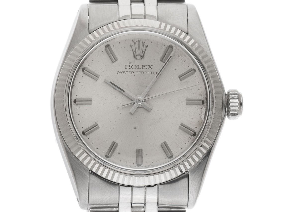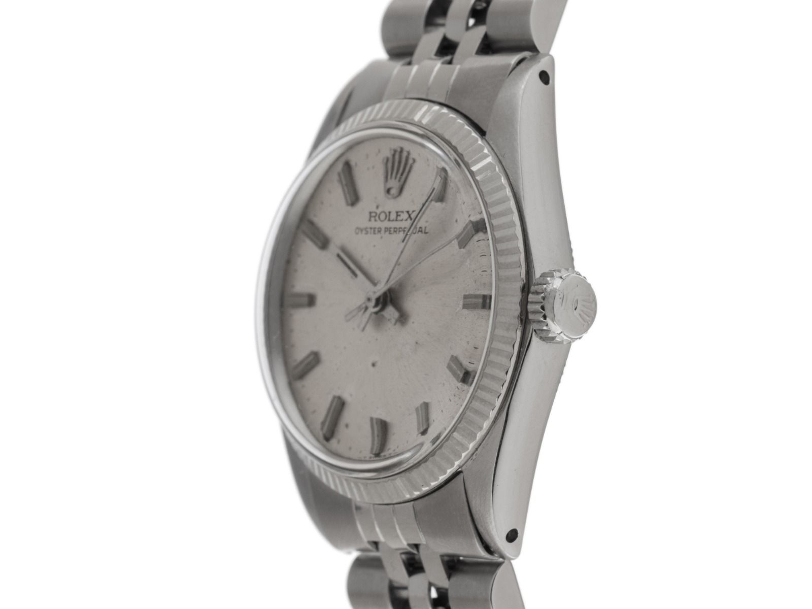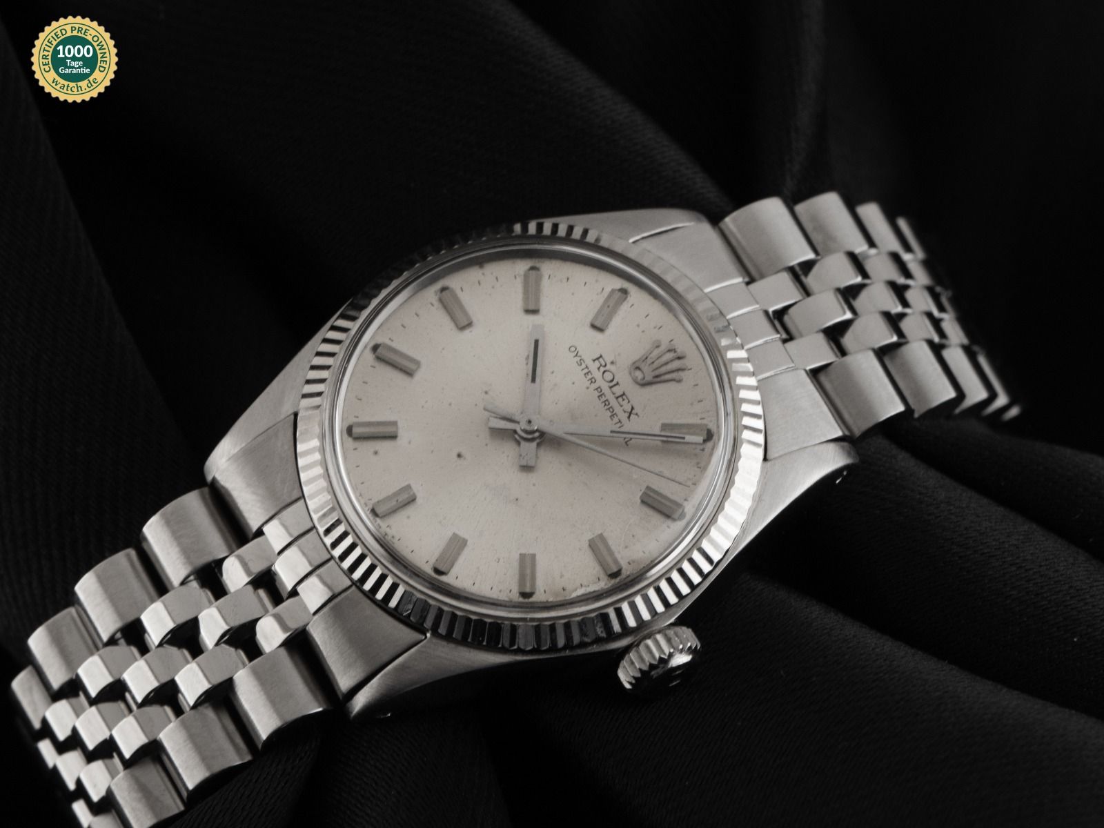 Rolex Oyster Perpetual Medium Stahl 18kt Weißgold Automatik Armband JubiléGehäuse Edelstahl poliert und satiniert, Gehäusedurchmesser ohne Krone 31mm, Gehäusehöhe 10,6mm. Lünette 18kt Weißgold geriffelt und poliert. Armband Jubilé Edelstahl, Faltschließe Edelstahl mit Hersteller-Logo. Zifferblatt silberfarben mit Patina, aufgesetzten Edelstahl Indexen und Edelstahl Zeigern. Uhrwerk Automatik, Rolex Manufakturkaliber 1151 mit 26 Edelsteinen. Anzeige von Stunde, Minute und Sekunde über Zeiger aus der Mitte. Plexiglas. Krone verschraubbar mit Hersteller-Logo. Boden Edelstahl verschraubt. Gewicht der Uhr inklusive Armband 59g, Länge des Armbandes inkl. Gehäuse 175mm. Referenznummer: 6551, Baujahr: 1970, Gehäusenummer: 2423XXX, ID: P178336001025H-5950, Artikelnummer: 10000082803. Mit Gangkontrolle und kompletter äußerlicher Aufarbeitung von Oktober 2025. Original Rolex Box mit Umkarton und Beschreibung, Rolex Chronometer-Siegel, Tag sowie Watchregister Auszug von Oktober 2025, The Watch Register Zertifikat / ohne Eintrag (Internationale Datenbank für verlorene oder gestohlene Uhren). Superschnäppchen, Kapitalanlage mit Wertsteigerungspotenzial, sehr seltenes Sammlerstück. Sehr guter Zustand. Lieferzeit sofort.
