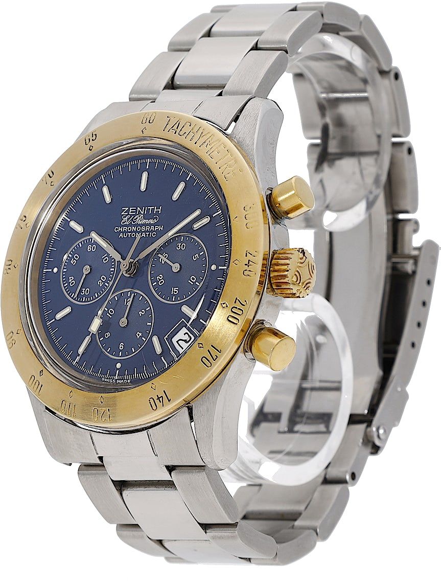 Zenith El Primero De Luca, Reference: 38.0300.400, Gender: Male, Size: 40mm, Dial color: Blue, Strap material: Stainless Steel, Movement: Automatic, Condition: Previously worn with some signs of usage. The movement is flawless and the case has been cleaned. watch tested to ensure full functionality. An inspection by our certified watchmakers guarantees its authenticity., Documents: Chronext Certificate