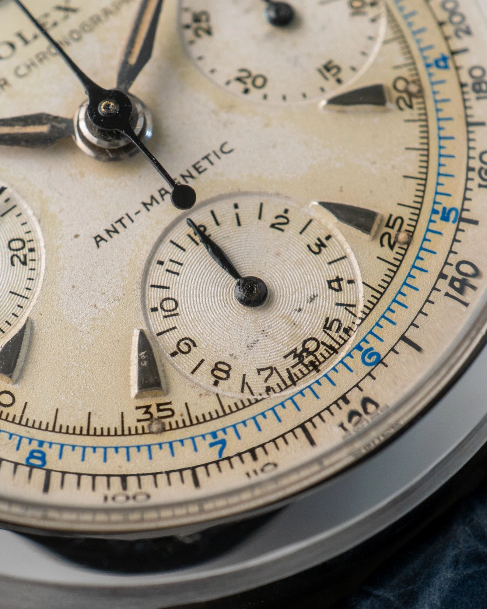 Die wunderschön patinierte cremefarbene Zifferblatt zeigt eine auffällige blaue Telemeterskala neben einem Tachymeter, eine Kombination, die einst von Rennfahrern bevorzugt wurde, um sowohl Entfernung als auch Geschwindigkeit zu messen.
