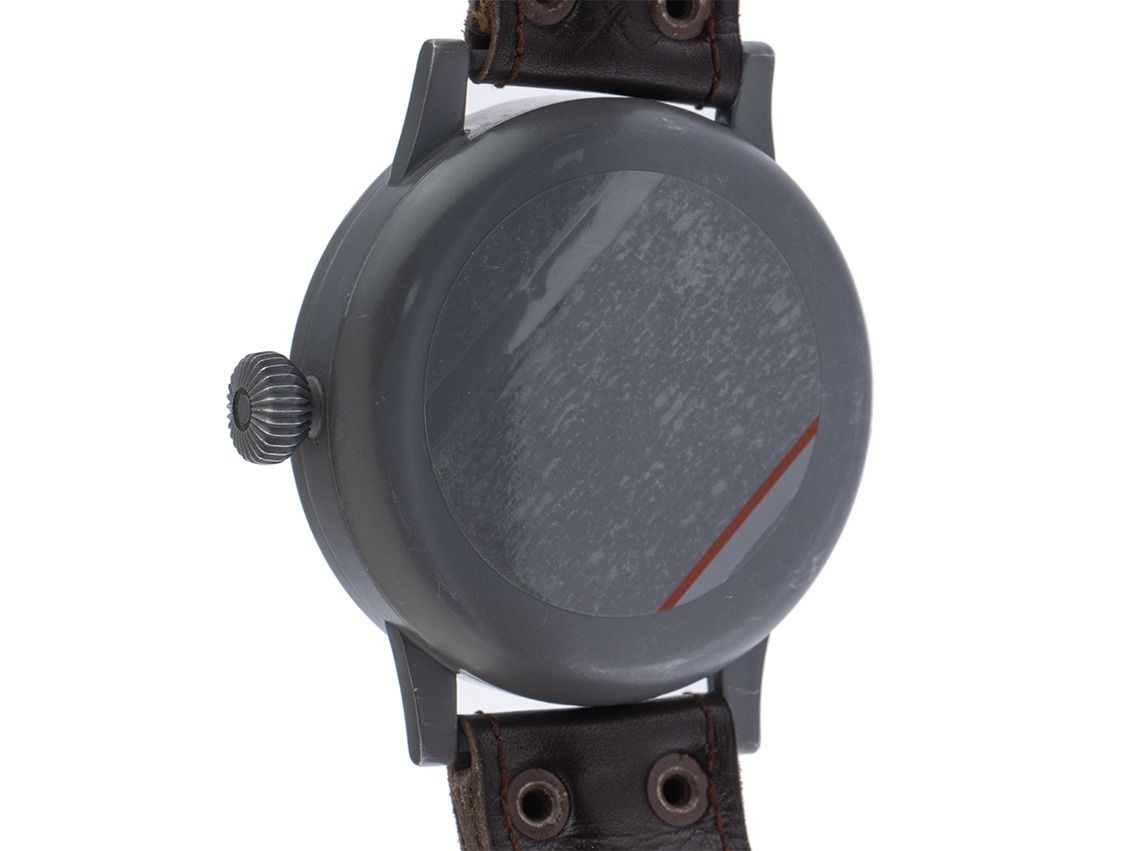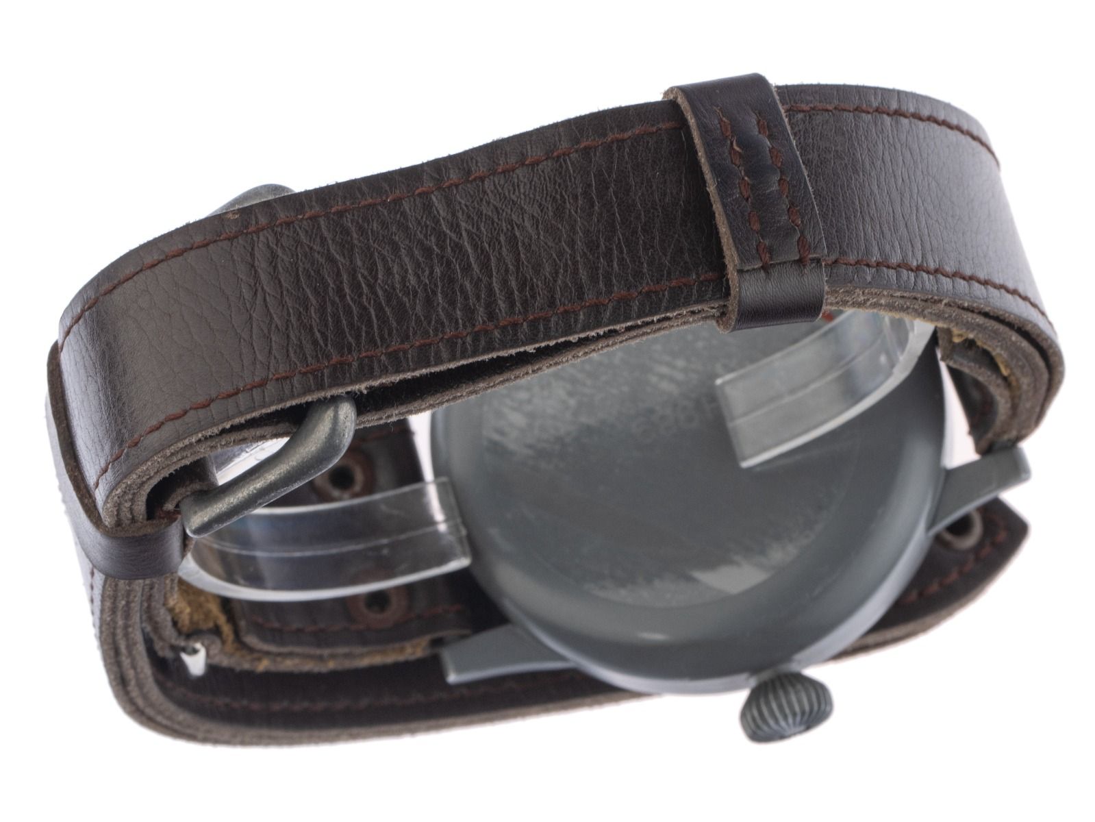 Gehäuse aus grau lackiertem und satiniertem Stahl, Gehäusedurchmesser ohne Krone 55mm, Gehäusehöhe 19,8mm, seitliche Gravur FL23883. Armband aus braunem Leder mit Ziernaht und Nieten, Anstoßbreite 26mm, Stiftschließe aus Edelstahl. Zifferblatt schwarz mit arabischen Ziffern und Indexen sowie gebläuten Zeigern. Uhrwerk Handaufzug, Kaliber Durowe mit 22 Edelsteinen. Anzeige von Stunde, Minute und Sekunde über Zeiger aus der Mitte mit Sekundenstopp zur sekundengenauen Einstellung der Uhrzeit. Gewölbtes Plexiglas. Zwiebelkrone geriffelt. Boden aus grau lackiertem und graviertem Stahl. Gewicht der Uhr inklusive Armband 191g. Referenznummer: 23883, Gehäusenummer: HXXX, Baujahr: 1945, ID: P183960001125H-8900, Artikelnummer: 10000082978. Original Laco Box mit Umkarton und Watchregister Auszug von November 2025, The Watch Register Zertifikat / ohne Eintrag (Internationale Datenbank für verlorene oder gestohlene Uhren). Sehr guter Zustand. Lieferzeit sofort.