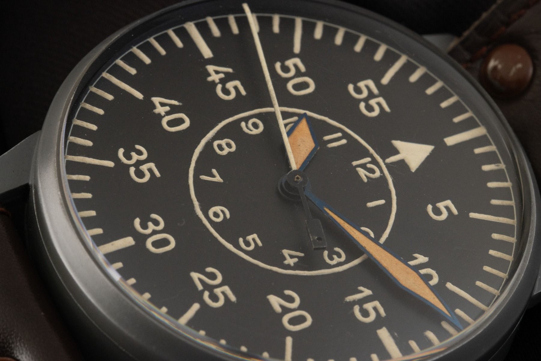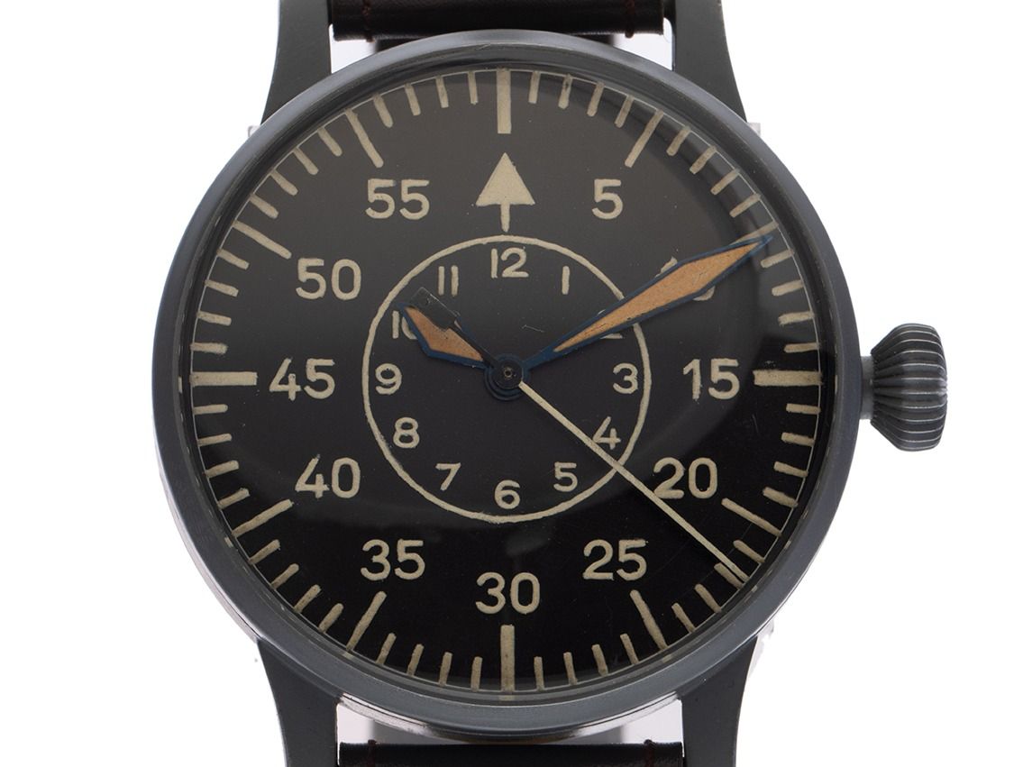 Laco Fliegeruhr B-Uhr WW2 Navigator Stahl Handaufzug Armband LederGehäuse Stahl grau lackiert und satiniert, Gehäusedurchmesser ohne Krone 55mm, Gehäusehöhe 19,8mm, seitliche Gravur FL23883. Armband Leder braun mit Ziernaht und Nieten, Anstoßbreite 26mm, Stiftschließe Edelstahl. Zifferblatt schwarz mit arabischen Ziffern und Indexen sowie gebläuten Zeigern. Uhrwerk Handaufzug, Kaliber Durowe mit 22 Edelsteinen. Anzeige von Stunde, Minute und Sekunde über Zeiger aus der Mitte mit Sekundenstopp zur sekundengenauen Einstellung der Uhrzeit. Plexiglas gewölbt. Zwiebelkrone geriffelt. Boden Stahl grau lackiert und graviert. Gewicht der Uhr inklusive Armband 191g. Referenznummer: 23883, Gehäusenummer: HXXX,, Baujahr: 1945, ID: P183960001125H-8900, Artikelnummer: 10000082978. Original Laco Box mit Umkarton und Watchregister Auszug von November 2025, The Watch Register Zertifikat / ohne Eintrag (Internationale Datenbank für verlorene oder gestohlene Uhren). Sehr guter Zustand. Lieferzeit sofort.