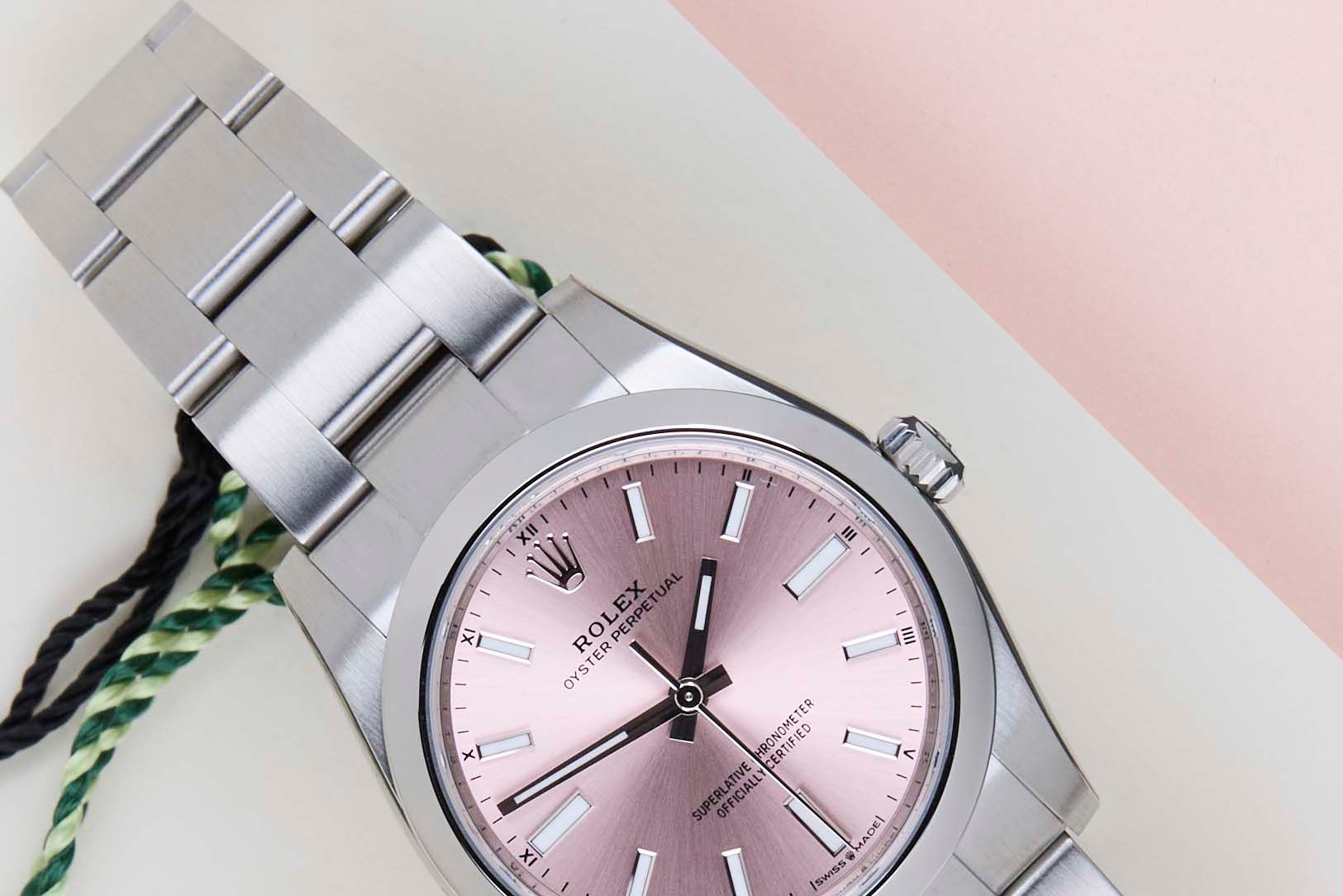 New & Unworn (Fully Stickered) | Full Set | International Rolex Warranty until March 2029 The Rolex Oyster Perpetual was first introduced by Rolex in the 1930s. It is characterized by its water-resistant Oyster case and self-winding Perpetual movement. The Rolex Oyster Perpetual is a simple, yet elegant timepiece that is suitable for both casual and formal wear.This Rolex Oyster Perpetual 34 'Pink Dial' was sold for the first time in March 2024.The watch is fully made out of stainless steel. Rolex uses 904L in its steel watches, which is an extremely resistant and highly polishable superalloy.This Rolex Oyster Perpetual 34 is in New & Unworn condition and comes with the original Rolex Warranty Card and box. Furthermore, the watch still has Worldwide Rolex Warranty until March 2029.