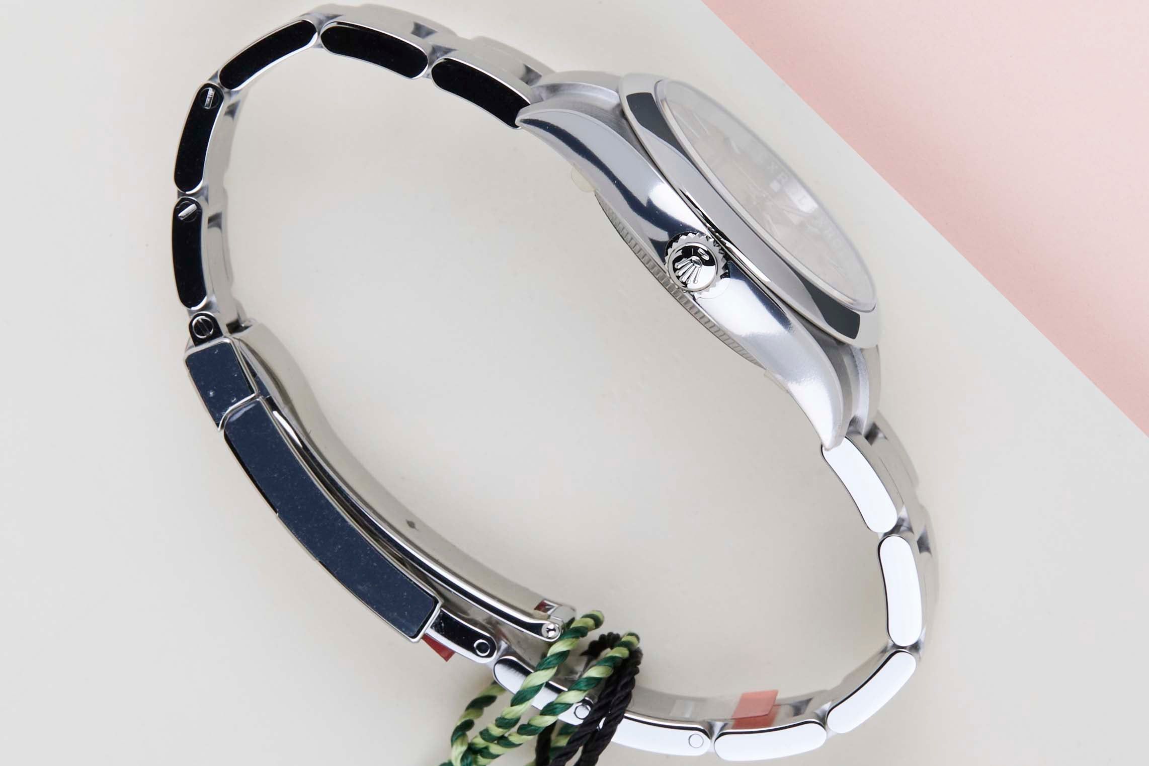 Diese Rolex Oyster Perpetual 34 'Rosa Zifferblatt' wurde erstmals im März 2024 verkauft. Die Uhr besteht vollständig aus Edelstahl. Rolex verwendet 904L in seinen Stahluhren, das ist eine extrem widerstandsfähige und hochpolierbare Superlegierung.