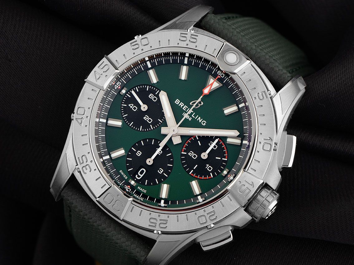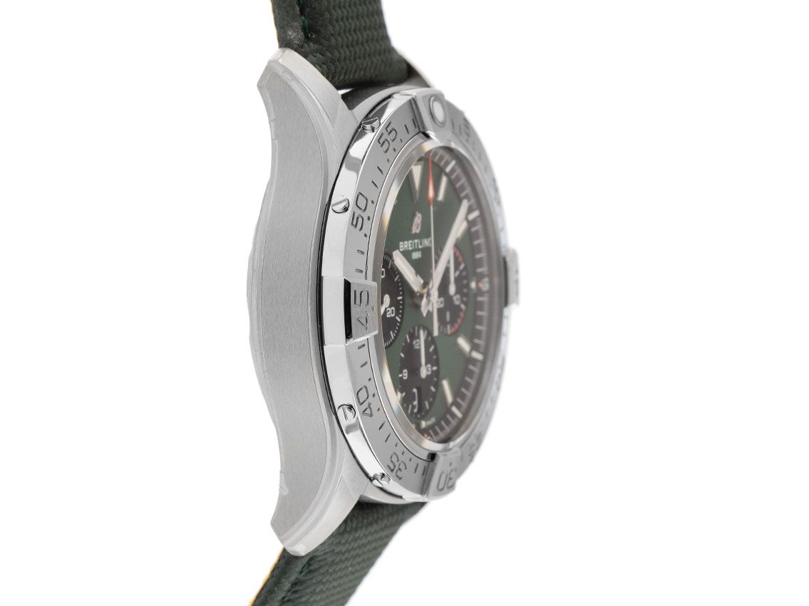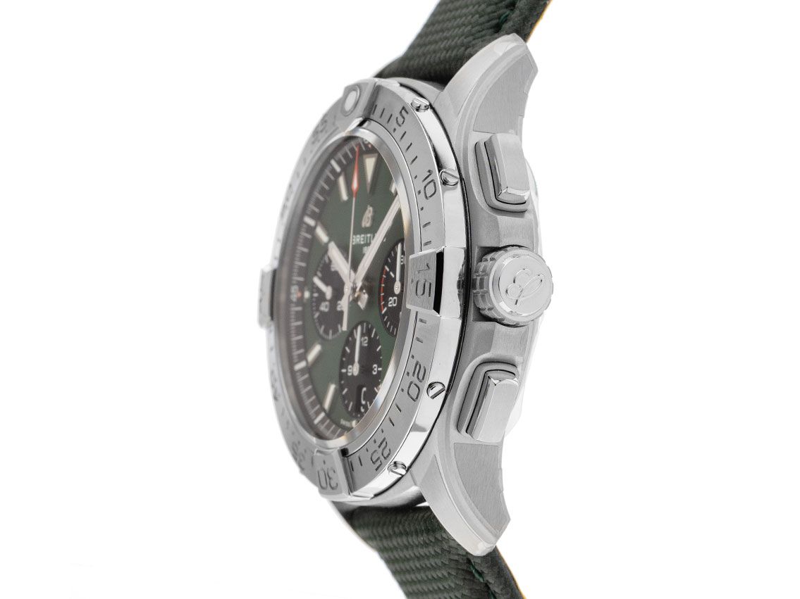 Breitling Avenger B01 Stahl Automatik Armband Leder FaltschließeGehäuse Edelstahl satiniert, Gehäusedurchmesser ohne Krone 42mm, Gehäusehöhe 15,2mm. Lünette Edelstahl poliert und satiniert mit 60-Minuten Skala und Leuchtpunkt, einseitig drehbar. Armband Leder grün mit Ziernaht, Anstoßbreite 22mm, Sicherheitsfaltschließe Edelstahl mit Hersteller-Logo. Zifferblatt grün mit aufgesetzten Leuchtindexen und Leuchtzeigern. Uhrwerk Automatik, Chronograph, Chronometer mit Zeugnis, Breitling Manufakturkaliber 01 mit 45 Edelsteinen, Gangreserve ca. 70 Stunden. Anzeige von Stunde und Minute über Zeiger aus der Mitte, kleine Sekunde mit Sekundenstopp zur sekundengenauen Einstellung der Uhrzeit bei 9 Uhr, Datumsanzeige mit Schnellverstellung bei 6 Uhr. Saphirglas kratzfest und beidseitig entspiegelt. Krone verschraubbar mit Flankenschutz und Hersteller-Logo. Boden Edelstahl verschraubt und graviert mit Saphirglas Sichtfenster. Gewicht der Uhr inklusive Armband 126g. Wasserdicht bis 30 ATM. Referenznummer: AB0146101L1X1, ID: ST116095241125H-6900, Artikelnummer: 10000083078. Original Breitling Box und Garantie Papiere von 2025 sowie Beschreibung, Full Set. Ungetragen. Lieferzeit sofort.