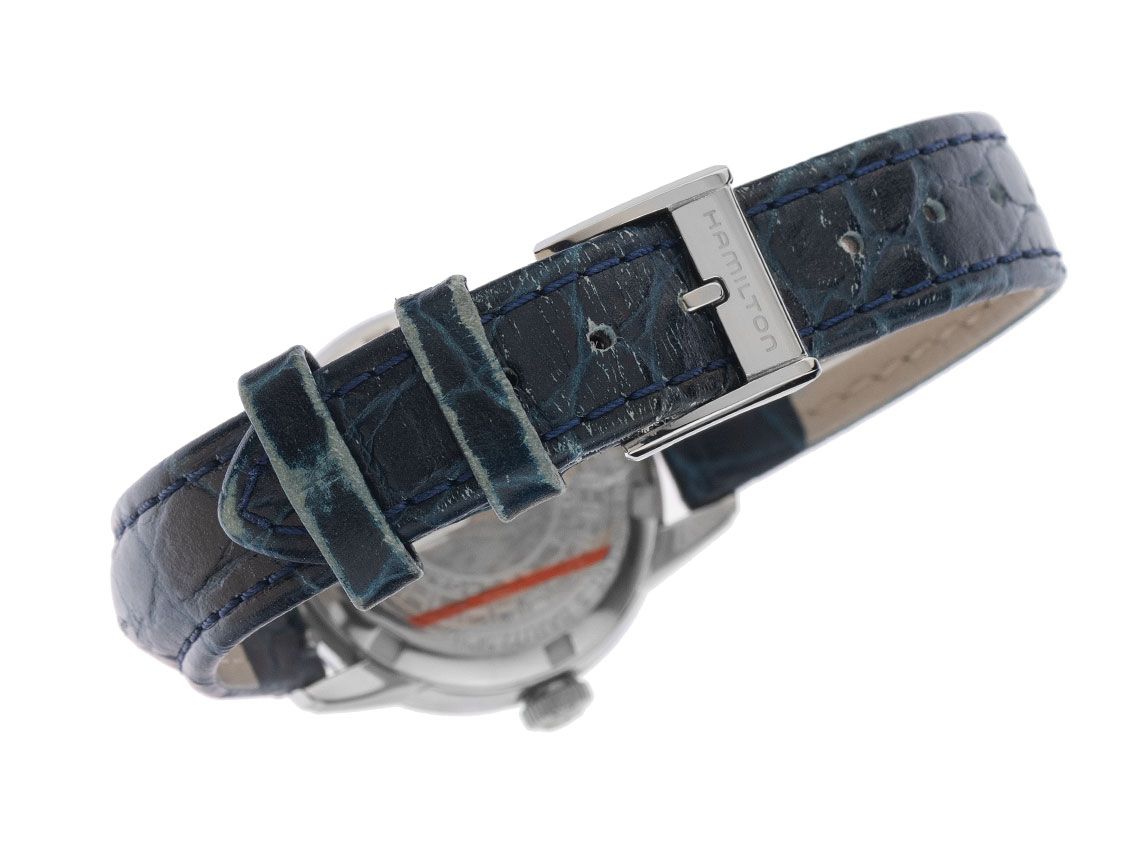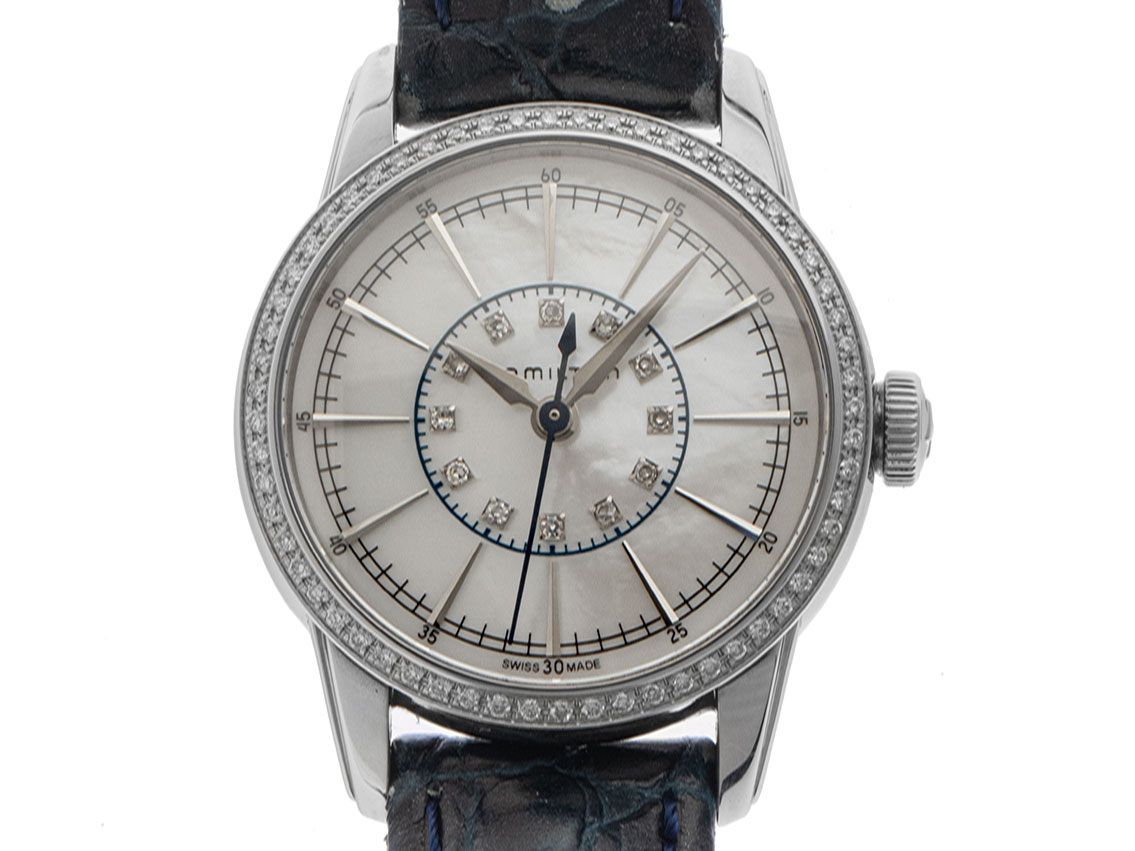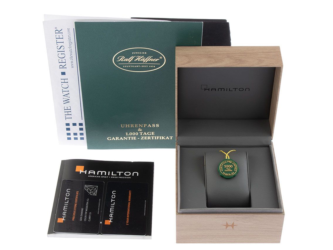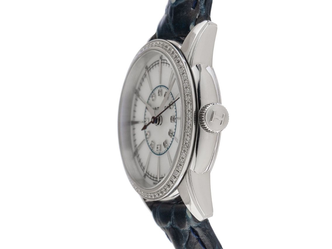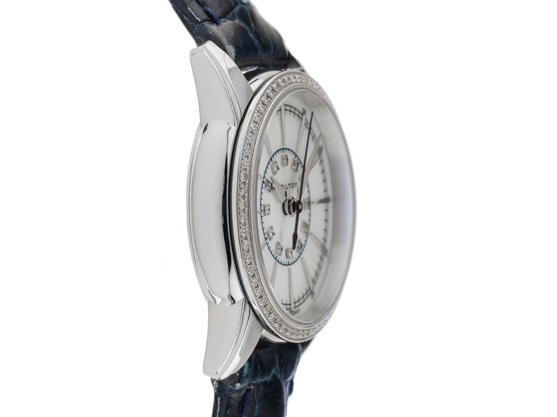 Gehäuse Edelstahl poliert, Gehäusedurchmesser 28mm, Gehäusehöhe 9,2mm. Lünette Edelstahl mit Diamanten besetzt. Armband Leder blau mit Ziernaht, Anstoßbreite 14mm, Stiftschließe Edelstahl mit Hersteller-Logo. Zifferblatt Perlmutt hell mit aufgesetzten Edelstahl Indexen, Diamanten und Edelstahl Zeigern sowie gebläuter Sekundenzeiger. Uhrwerk quarzgesteuert, Kaliber F03101 mit 3 Edelsteinen. Anzeige von Stunde, Minute und Sekunde über Zeiger aus der Mitte mit Sekundenstopp zur sekundengenauen Einstellung der Uhrzeit. Saphirglas kratzfest. Krone mit Hersteller-Logo. Boden Edelstahl verschraubt und graviert. Gewicht der Uhr inklusive Armband 31g. Referenznummer: H40391691, Gehäusenummer: 72.5PSi, ID: P185413001125H-2400, Artikelnummer: 10000083051. Mit Gangkontrolle, neuer Batterie und kompletter äußerlicher Aufarbeitung von November 2025. Original Hamilton Box mit Umkarton und Garantie Papiere von November 2020 sowie Watchregister Auszug von November 2025, The Watch Register Zertifikat / ohne Eintrag (Internationale Datenbank für verlorene oder gestohlene Uhren), Full Set. Superschnäppchen, sehr seltenes Sammlerstück, aus erster Hand. Wie Neu. Lieferzeit sofort.