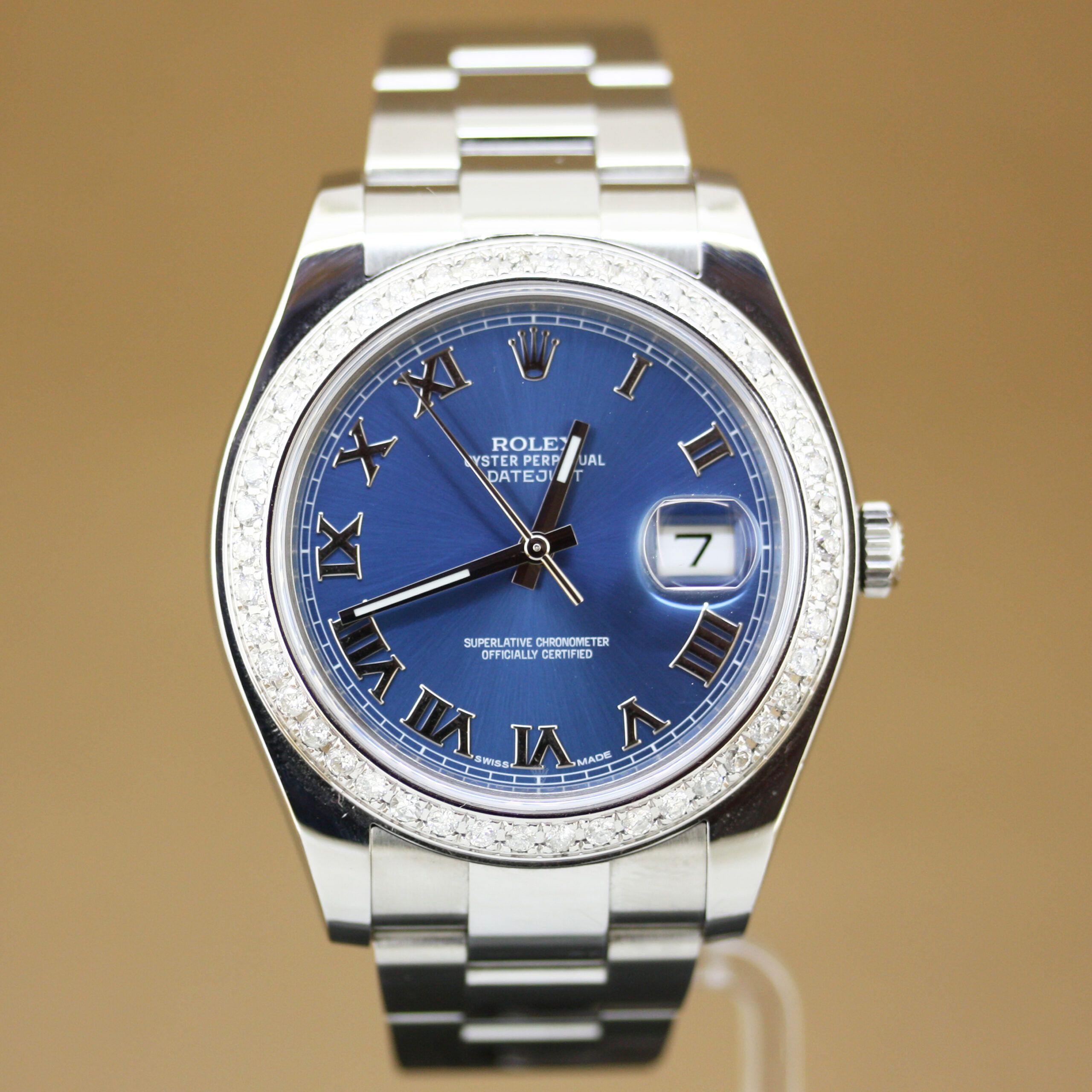 Rolex Datejust – Ref. 116300 For sale: a Rolex Datejust, reference 116300, in very good condition.This elegant and contemporary model features a stainless-steel case and a striking Roman Azur blue dial with Roman numerals – refined, timeless, and unmistakably Rolex. The bezel is set with natural diamonds, adding a luxurious touch to its modern design. The stainless-steel Oyster bracelet with folding clasp ensures comfort and durability. Powered by a reliable automatic Rolex movement with date function, this watch exemplifies precision and craftsmanship. Features & Scope of Delivery:✔ Reference: 116300✔ Case: Stainless steel✔ Bezel: Set with natural diamonds✔ Dial: Roman Azur blue with Roman numerals✔ Bracelet: Stainless-steel Oyster bracelet with folding clasp✔ Movement: Automatic with date function✔ Diameter: 41 mm✔ Condition: Very good✔ Complete with original box & papers (Full Set) A sophisticated and luxurious Rolex Datejust, featuring a Roman Azur blue dial and a natural diamond bezel, perfectly combining elegance, craftsmanship, and timeless appeal.
