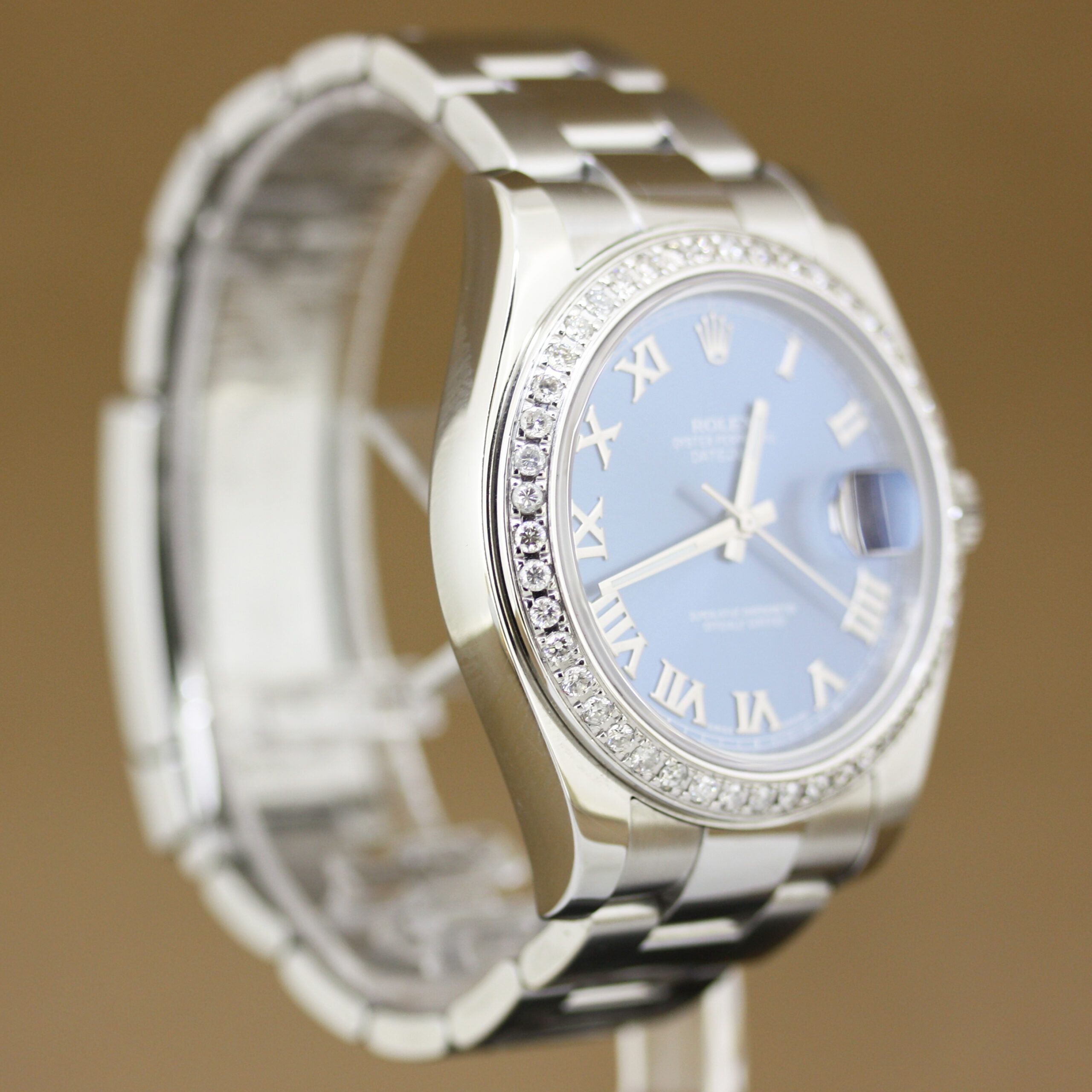 Eine anspruchsvolle und luxuriöse Rolex Datejust, die ein römisch azurblaue Zifferblatt und eine Lünette aus natürlichen Diamanten bietet und Eleganz, Handwerkskunst und zeitlose Anziehungskraft perfekt kombiniert.