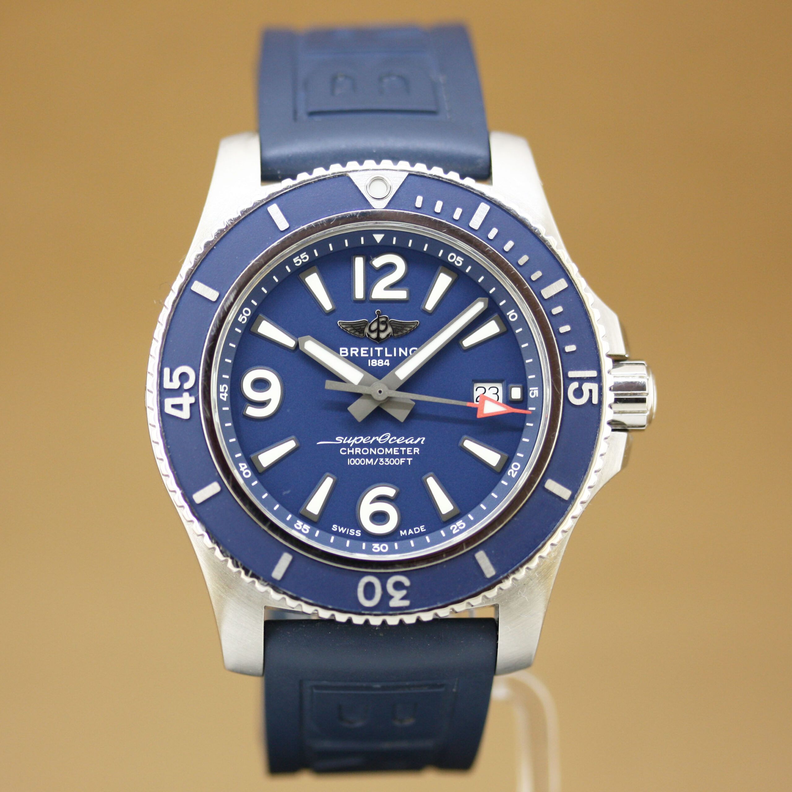 Breitling Superocean 44 Automatic – Ref. A17367 (Full Set) For sale: a Breitling Superocean 44 Automatic, reference A17367, in very good condition.This sporty dive watch features a stainless steel case and a blue dial, giving it a fresh and striking appearance. The rubber strap with folding clasp ensures comfort and durability, making it perfect for both daily wear and sports activities. Inside ticks a reliable automatic movement with date function, as expected from Breitling. Features & Scope of Delivery:✔ Reference: A17367✔ Case: Stainless steel✔ Dial: Blue✔ Strap: Rubber strap with folding clasp✔ Movement: Automatic with date function✔ Diameter: 44 mm✔ Condition: Very good✔ Full Set: original box & papers✔ Original purchase invoice included A sporty and stylish Breitling Superocean 44, highly appreciated by enthusiasts of robust diving watches with a fresh design.