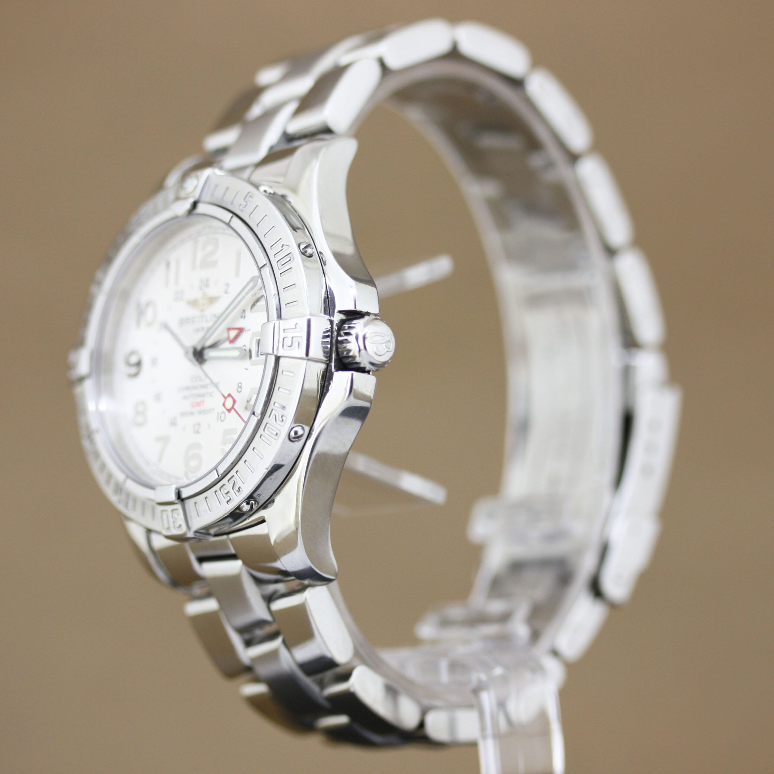 Breitling Colt GMT A32350 in very good condition, equipped with a steel case and silver dial. Watch has a steel strap with folding clasp and an automatic movement with date & GMT function. Comes with box & papers.