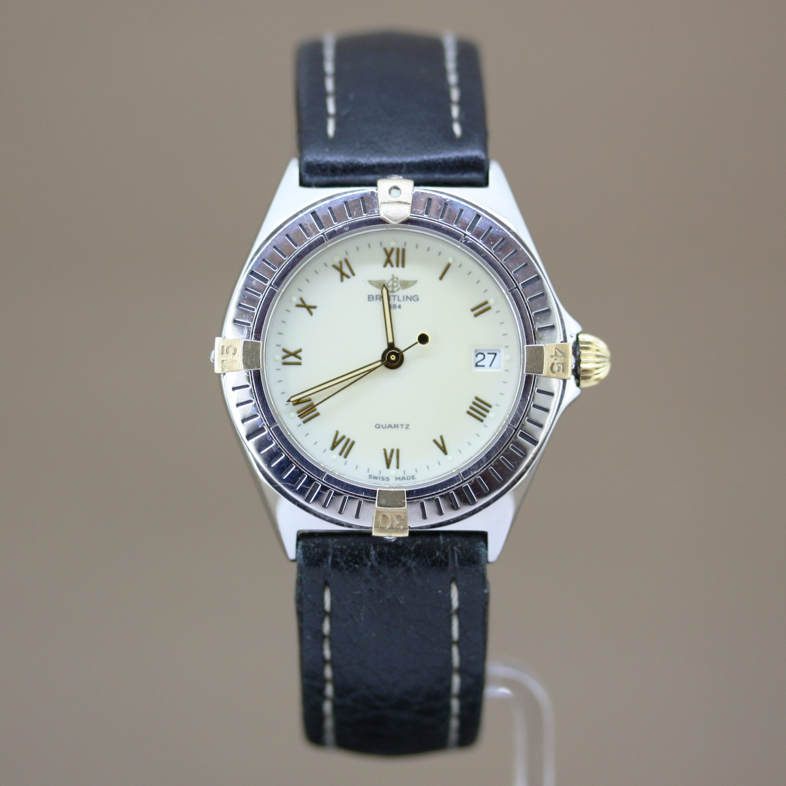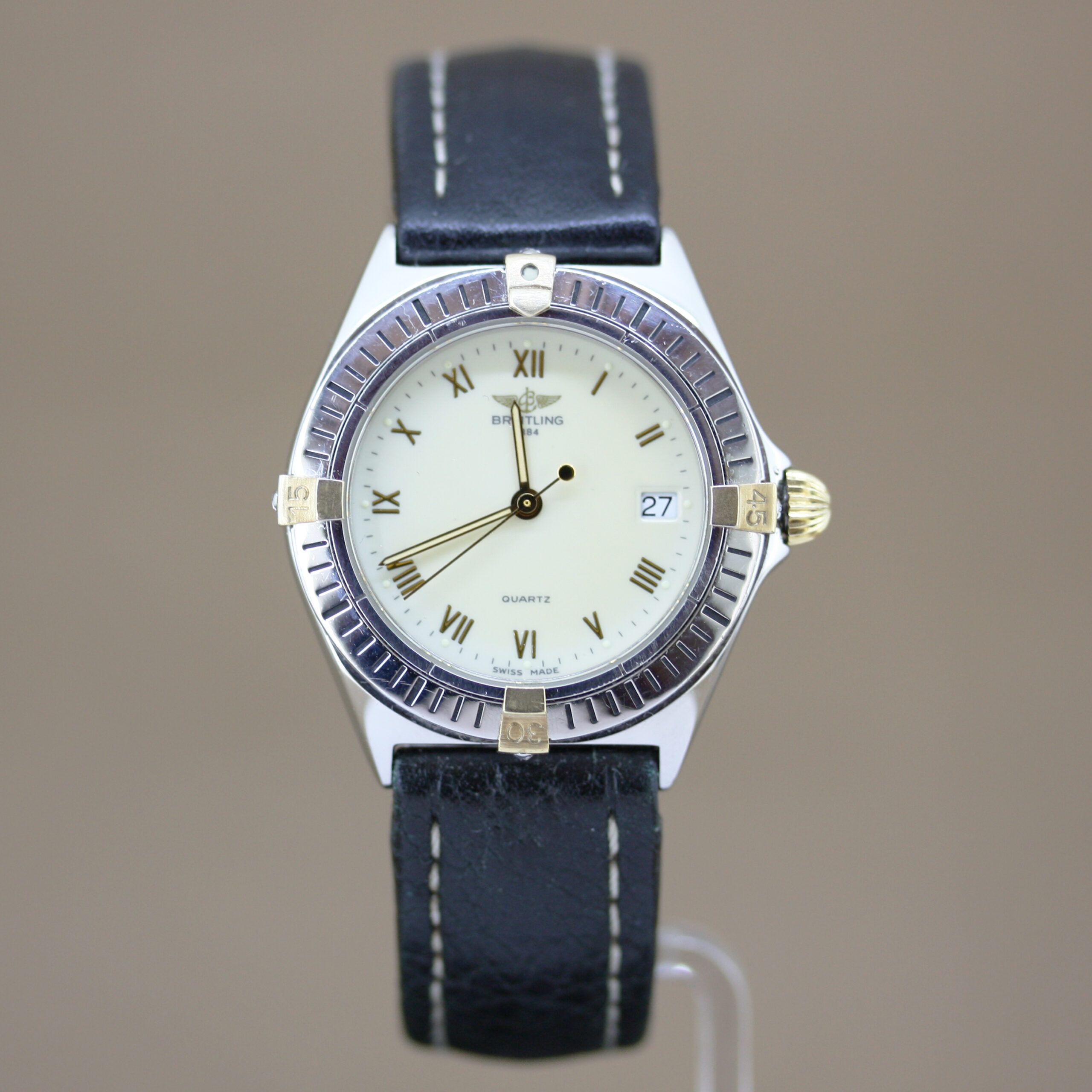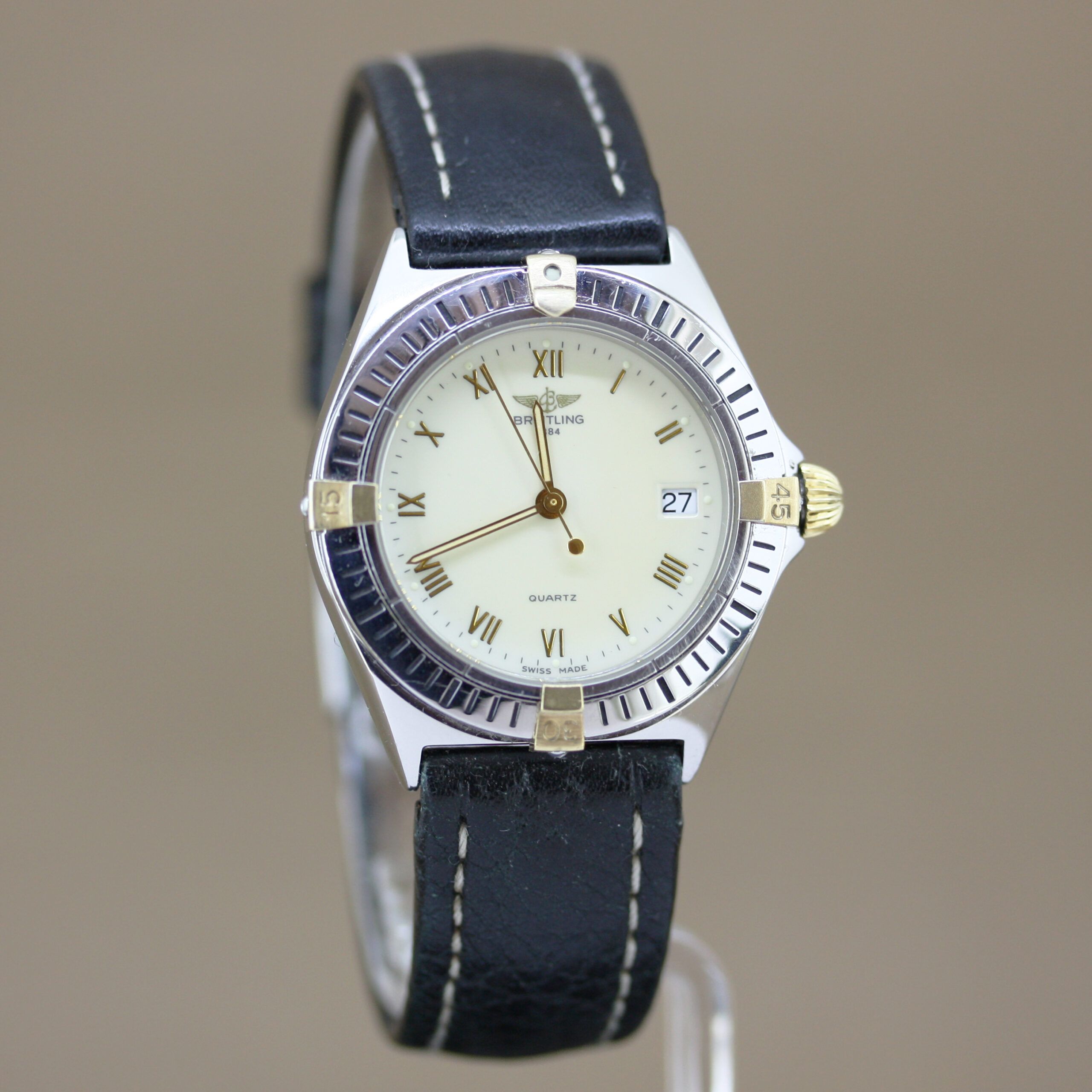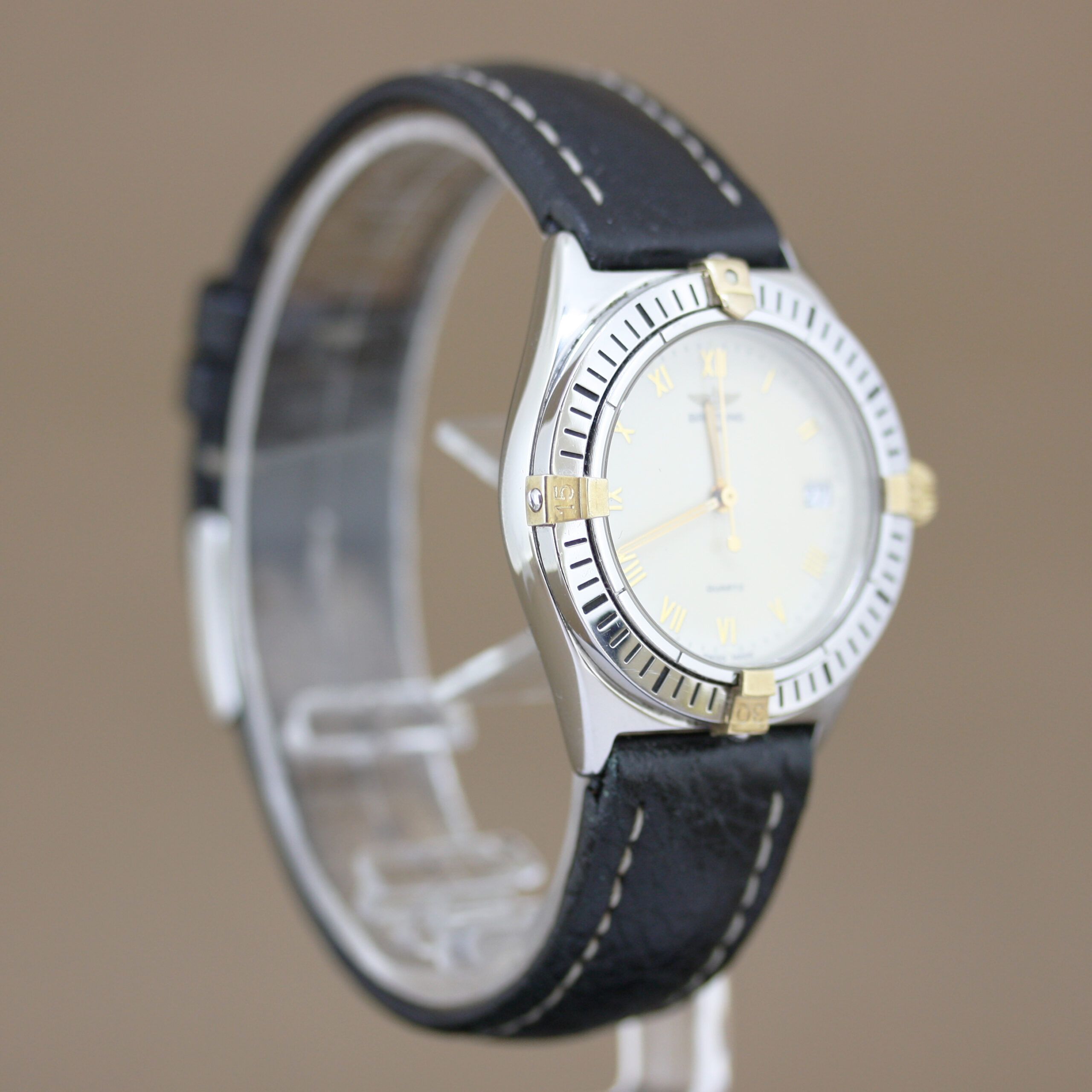 Breitling Callisto ref: B57045 in good condition, the watch has a steel gold case and a cream white dial. The Breitling Callisto has a black leather strap with a buckle clasp and a quartz movement with date function. The watch comes with a watch dealer box and a named valuation report.
