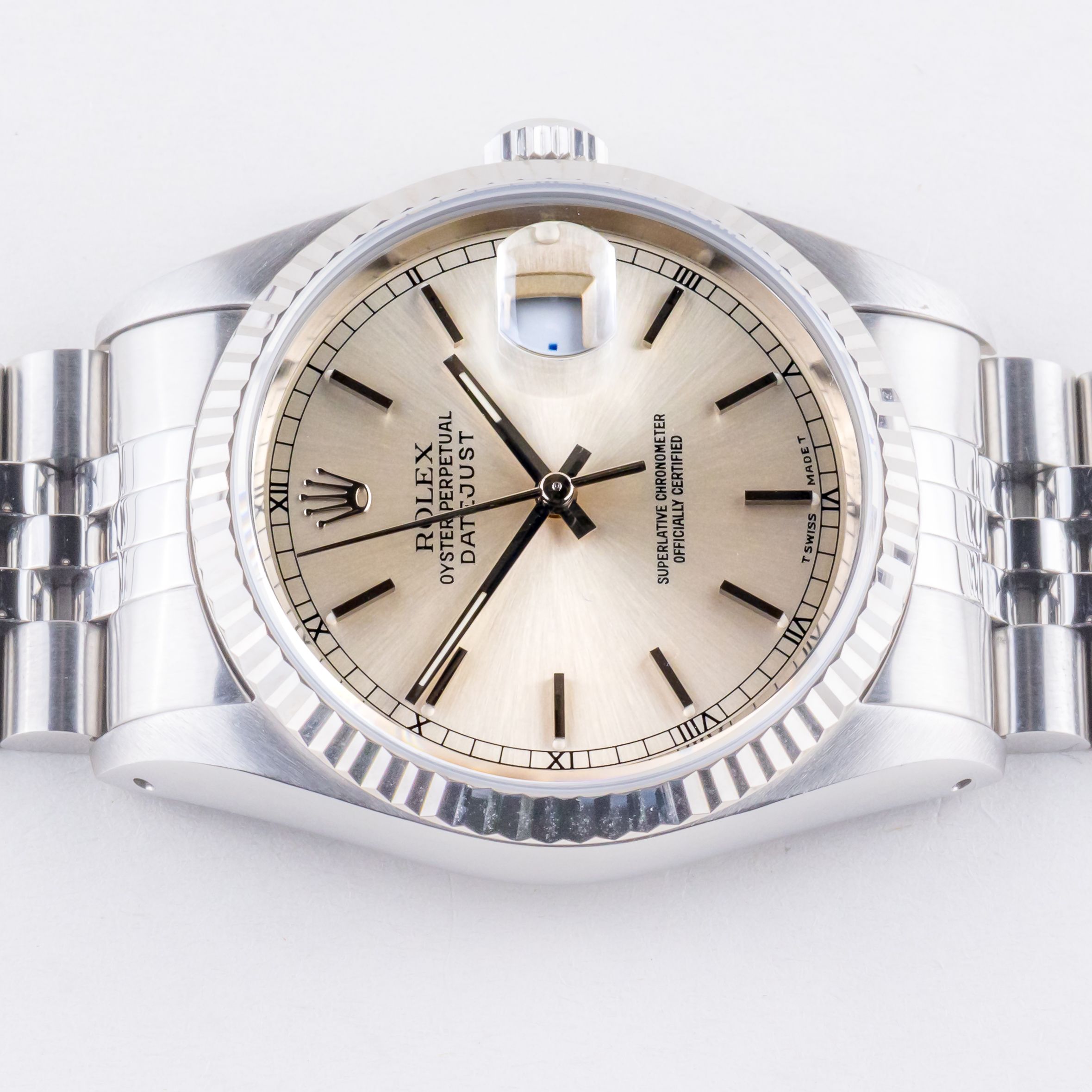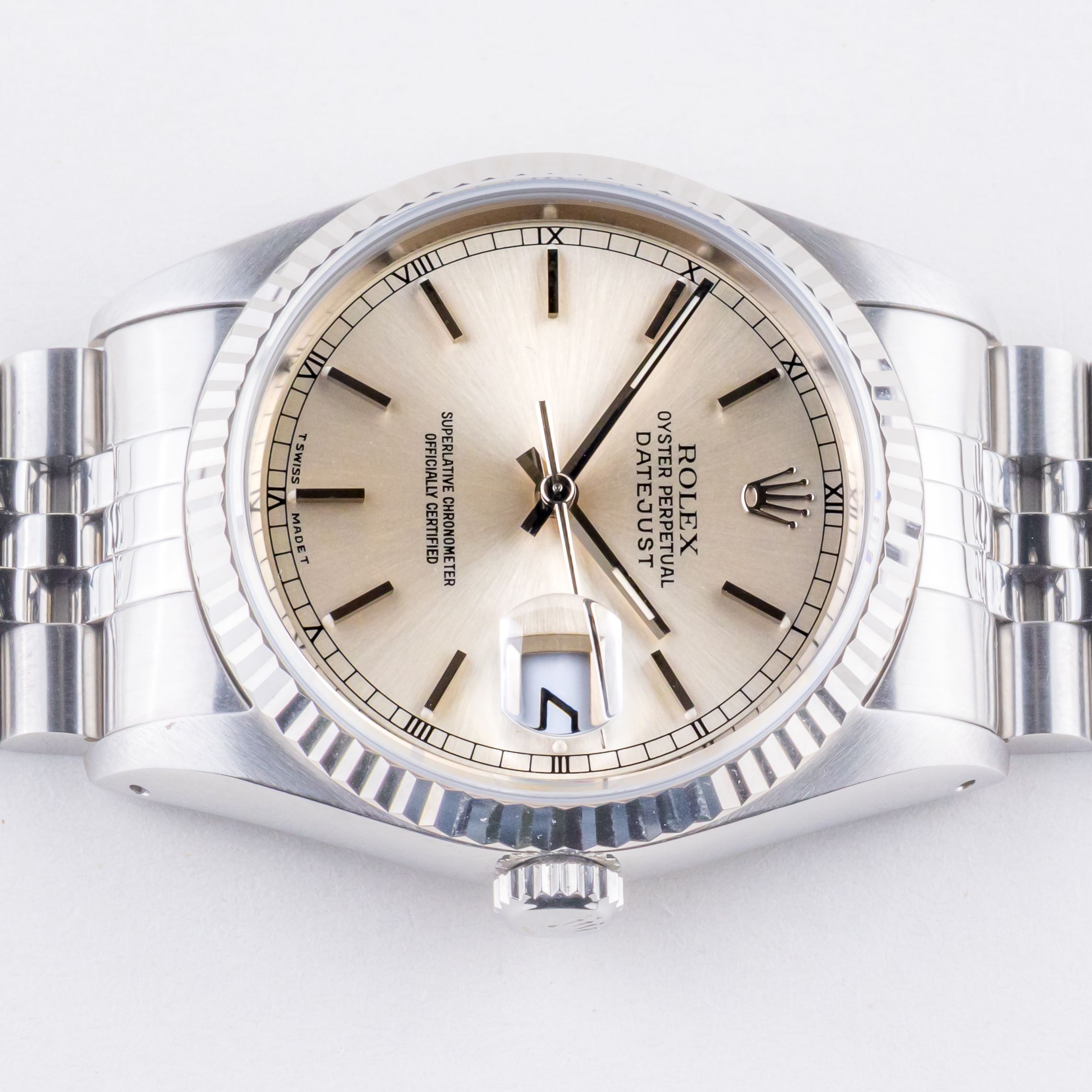 Rolex Oyster Perpetual Datejust reference 16234 from 1991 The Datejust 16234 Datejust measures a 36mm stainless steel case, a stainless steel Jubilee bracelet and a fluted 18k white gold bezel. This Datejust 16234 features an automatic movement caliber 3135 with quickset date function, a scratch resistance sapphire crystal and a silver dial.Every pre-owned watch we sell, comes with a 12-month warranty from the date of purchase. Every watch sold by Langedyk Vintage Watches is included with a LVW watch box, Authenticity report and free worldwide (insured) shipment.
