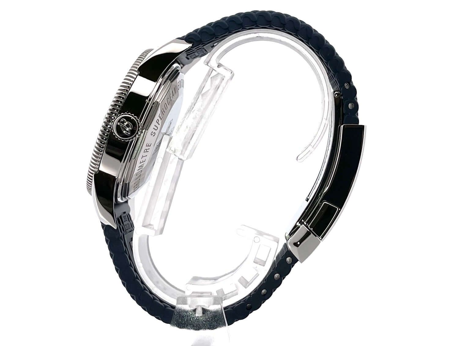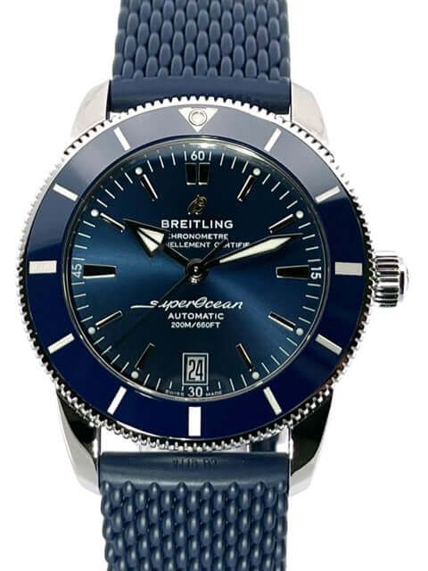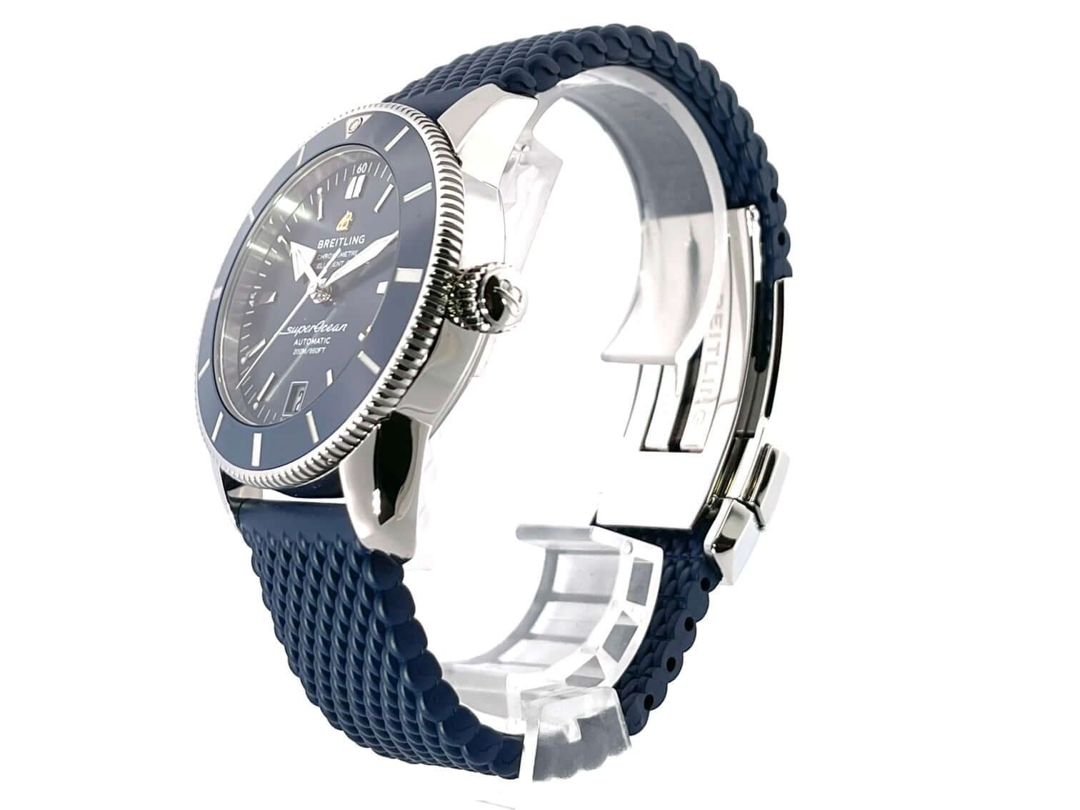 Breitling Superocean Heritage II B20 Automatic 42 Ref. AB2010161C1S1Case made of polished and satin-finished stainless steel, case diameter 42 mm, case height 14.35 mm, stainless steel bezel with blue ceramic inlay, 60 minute scale and rotatable in one direction with lock, blue Aero Classic rubber strap with folding clasp, blue dial with applied luminous indices, luminous hands, clockwork Automatic, Breitling B20 caliber with 28 jewels, oscillation 28,800 A/h, power reserve for approx. 70 hours, date display, chronometer with certificate, sapphire crystal, double-sided anti-reflective coating and cambered, screwed crown with side protection, 2 seals, screwed stainless steel base, water resistant up to 20 bar.