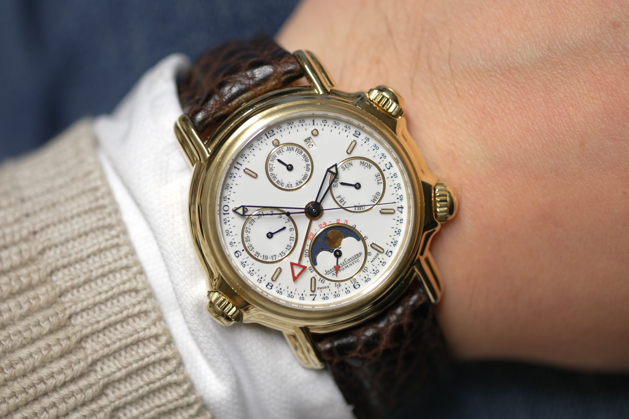 We are delighted to offer you a major complication—the JLC perpetual calendar with alarm function.In addition to the perpetual calendar, the watch also features a moon phase display and an alarm module.The case is in very good condition, with only minimal signs of wear commensurate with its age.