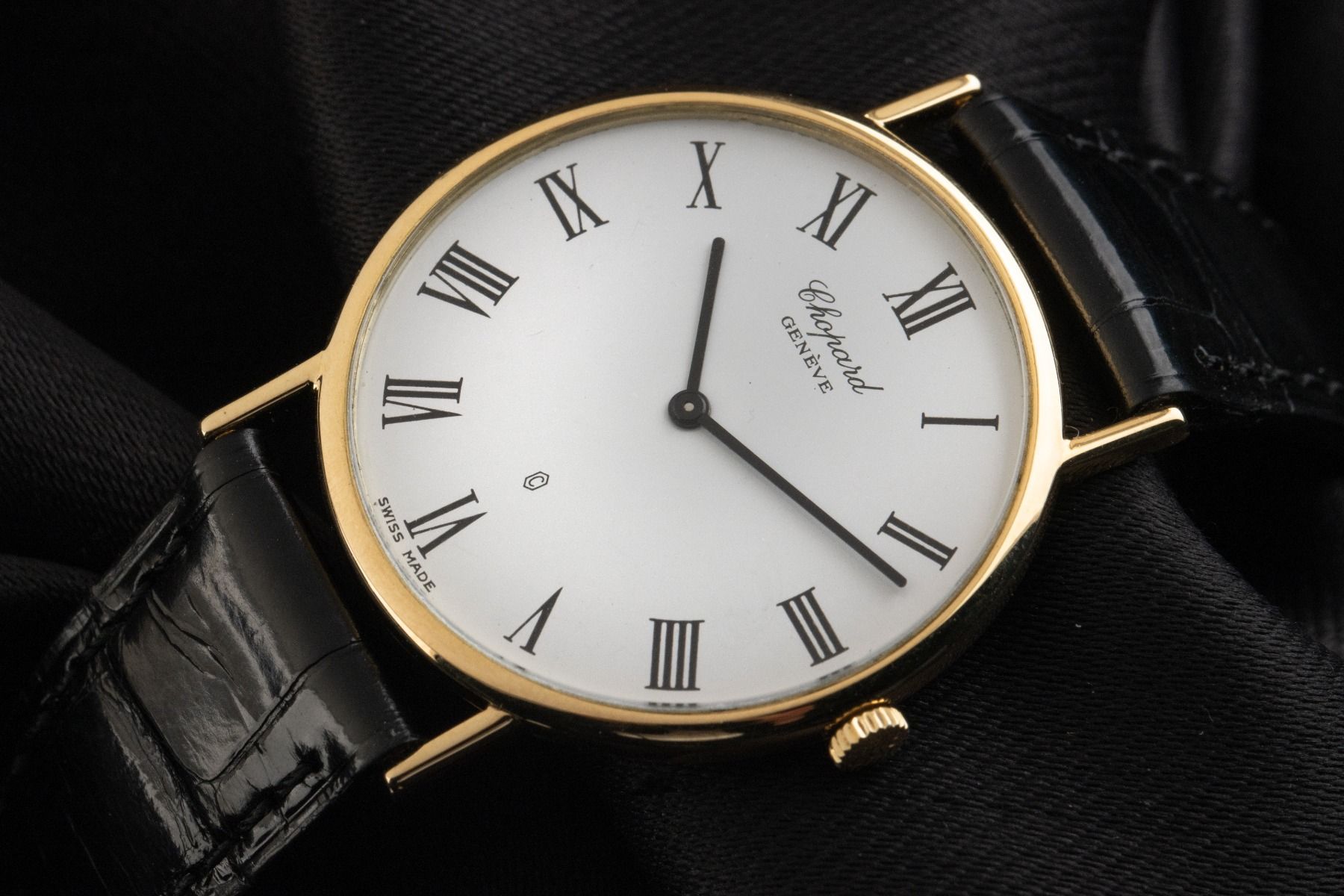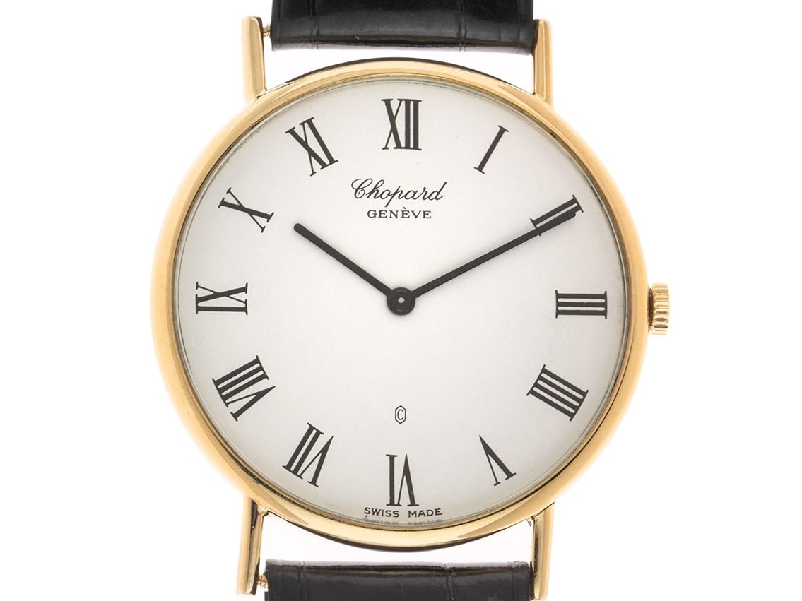 Chopard Classic 18kt Gelbgold Quarz Armband KrokolederGehäuse 18kt Gelbgold poliert, Gehäusedurchmesser ohne Krone 32mm, Gehäusehöhe 4,0mm. Armband Krokoleder schwarz mit Ziernaht, Anstoßbreite 17mm, Stiftschließe 18kt Gelbgold mit Hersteller-Logo. Zifferblatt weiß mit schwarzen römischen Ziffern und gelbgoldenen Zeigern. Uhrwerk quarzgesteuert, Kaliber ETA959.001 mit 6 Edelsteinen. Anzeige von Stunde und Minute über Zeiger aus der Mitte. Saphirglas kratzfest. Krone geriffelt. Boden 18kt Gelbgold graviert. Gewicht der Uhr inklusive Armband 23g. Referenznummer: 1068, Gehäusenummer: 179XXX, Baujahr: 1992, ID: P189126001125H-5200, Artikelnummer: 10000083127. Mit Gangkontrolle und kompletter äußerlicher Aufarbeitung von November 2025. Original Chopard Box mit Umkarton und Watchregister Auszug von November 2025, The Watch Register Zertifikat / ohne Eintrag (Internationale Datenbank für verlorene oder gestohlene Uhren). Superschnäppchen, sehr seltenes Sammlerstück. Sehr guter Zustand. Lieferzeit sofort.